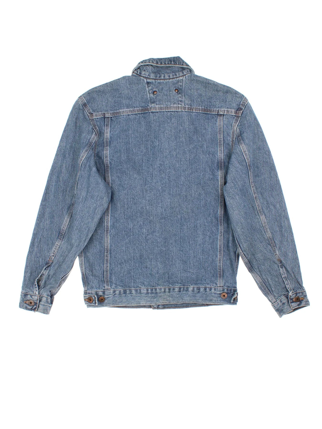 Carhartt Denim Jacket in a blue colourway with button up front, multiple pockets and small classic logo on the front.