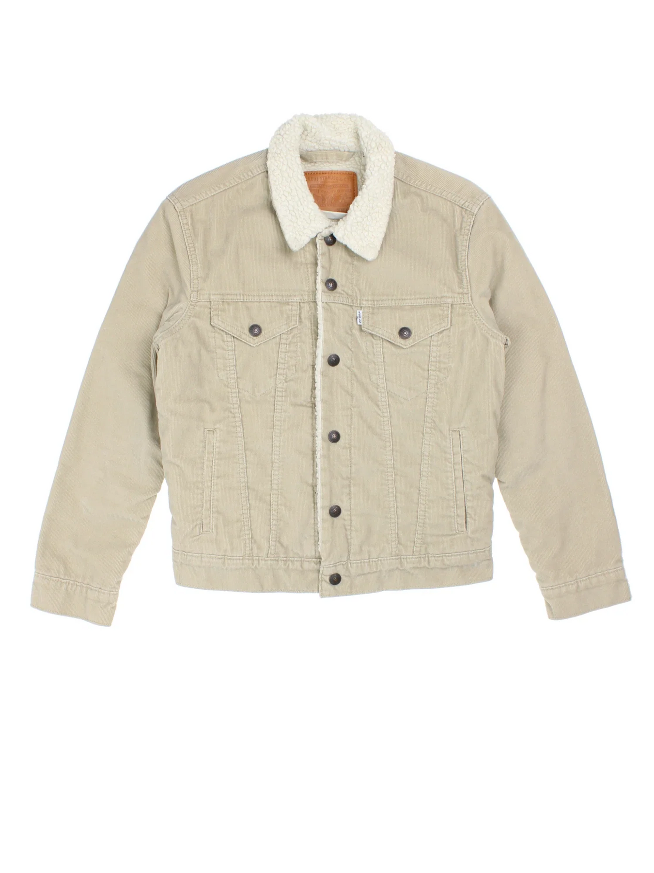 Levi Strauss Sherpa Cord Trucker Jacket in a tan colourway. Buttons up and has multiple pockets, insulated lining, and has the logo tab embroidered on the front.
