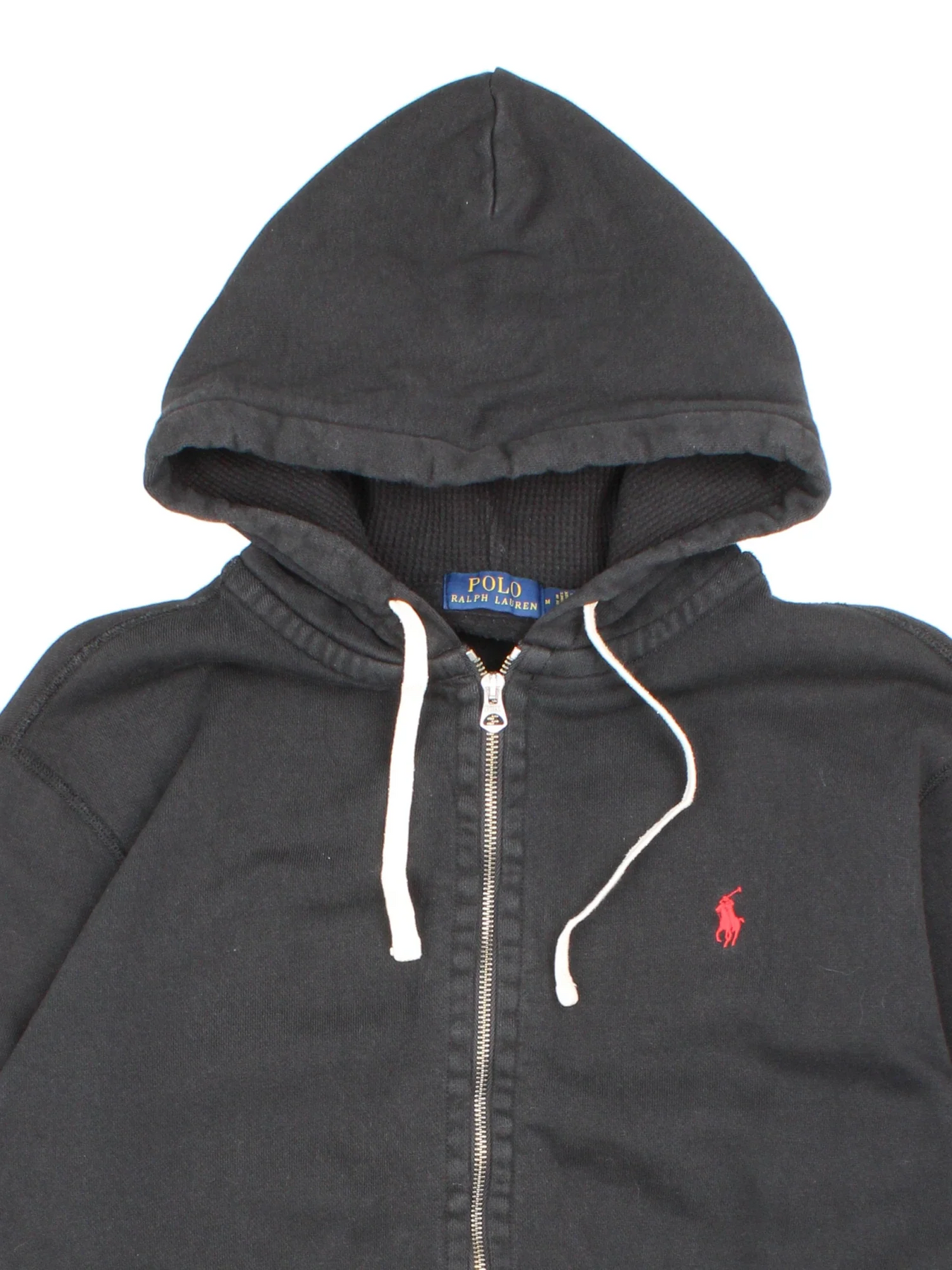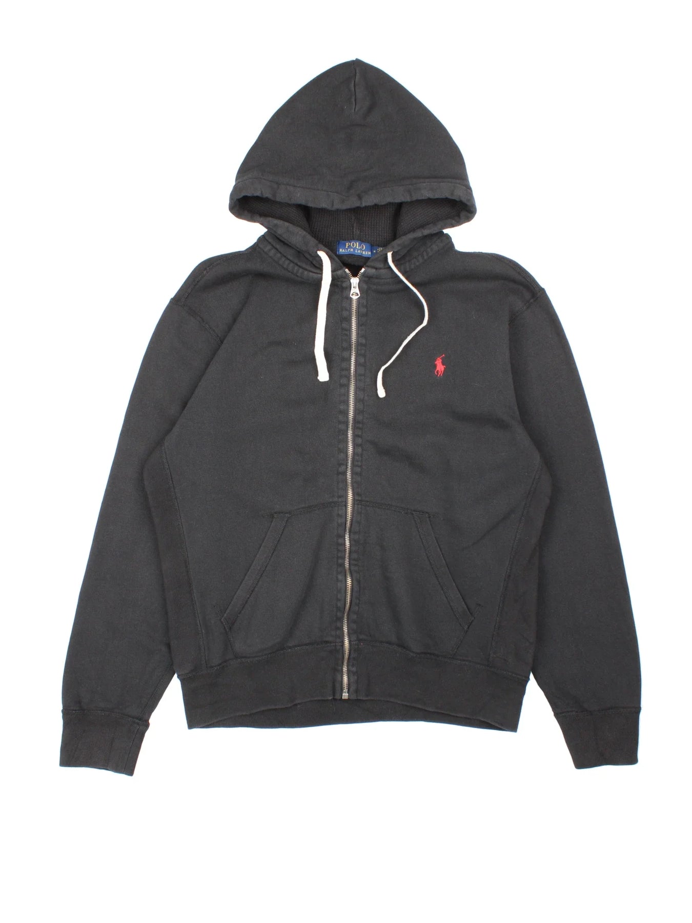 Ralph Lauren Hoodie in a black colourway with small classic logo on the front, full zip, side pockets and drawstring hood.