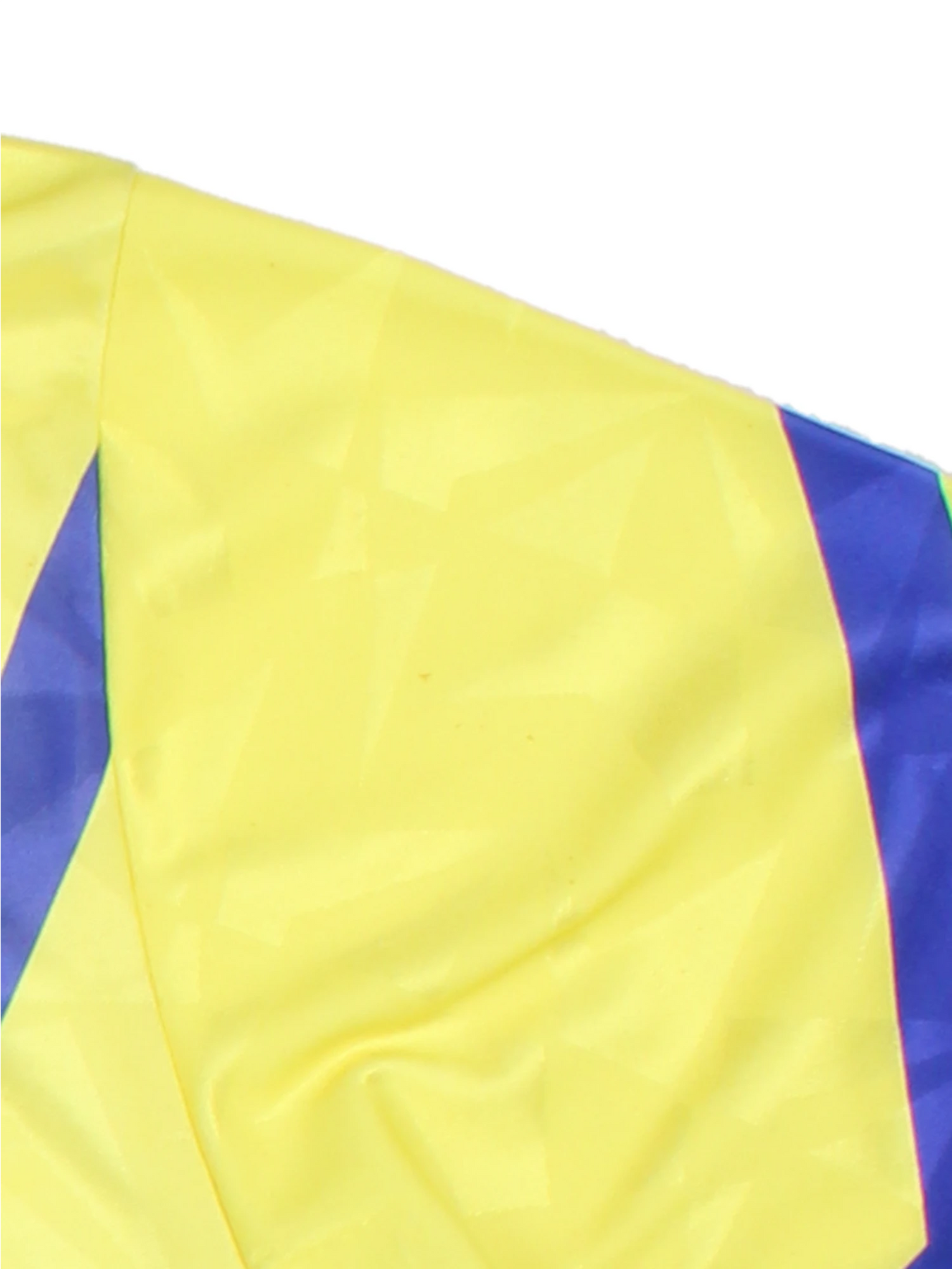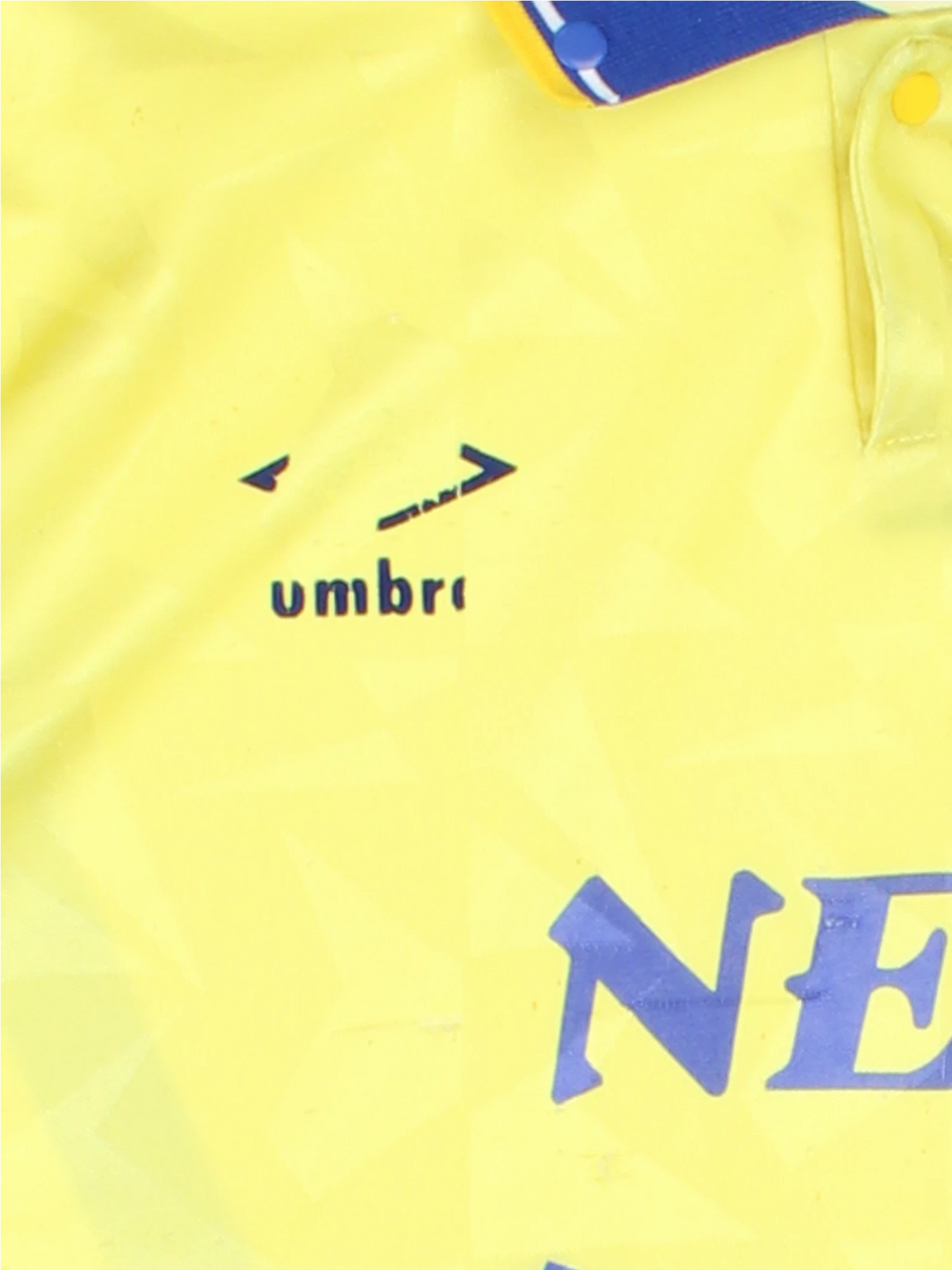 Relive the iconic era of football with the Umbro Everton EFC 90's Yellow Blue NEC Retro Football Shirt. Designed in a striking yellow base with bold blue zigzag accents, this vintage shirt features classic sponsor branding and the legendary EFC crest, making it a true collector’s item. Constructed from high-quality polyester, it ensures lasting durability and comfort whether you’re cheering from the stands or styling it for casual wear. The collared design with blue trim adds an authentic 90's touch, perfect for dedicated fans and fashion enthusiasts alike. Available in size L, this retro piece celebrates Everton’s historic legacy. Pair it with jeans for a laid-back, sporty look and own a significant chapter of football heritage today.