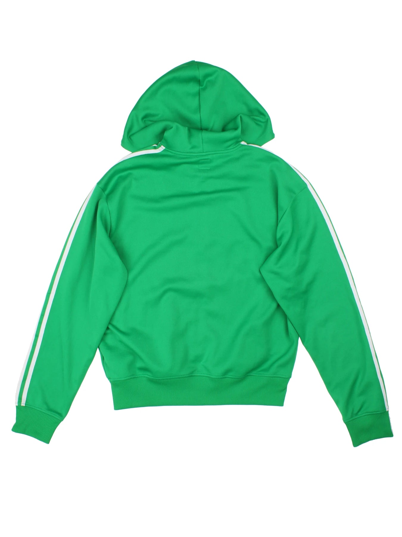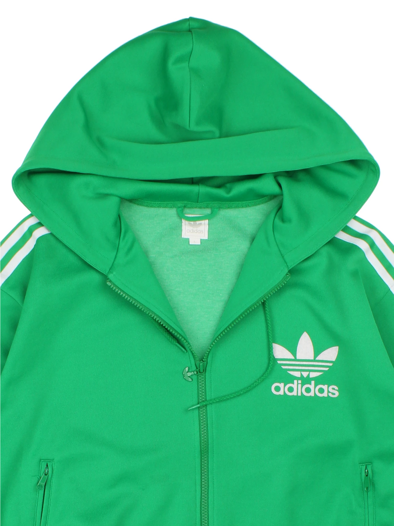 Elevate your casualwear with this striking Adidas Green Polyester Zip Up Hooded Track Jacket, designed for both style and comfort. Crafted from high-quality polyester, this jacket features the iconic Adidas three-stripe detailing along the sleeves and a bold white Trefoil logo at the chest for unmistakable brand appeal. The full zip fastening, adjustable drawstring hood, and ribbed cuffs and hem ensure a perfect fit while providing extra warmth and protection. Practical zipped side pockets offer secure storage for essentials on the go. In a vibrant green hue, this classic Adidas track jacket in size L brings a sporty edge to any outfit and is ideal for both sports and streetwear looks. Pair it effortlessly with joggers or jeans for an on-trend, athletic-inspired ensemble that guarantees standout appeal. Perfect for men seeking a fresh update to their sports and casual wardrobes.