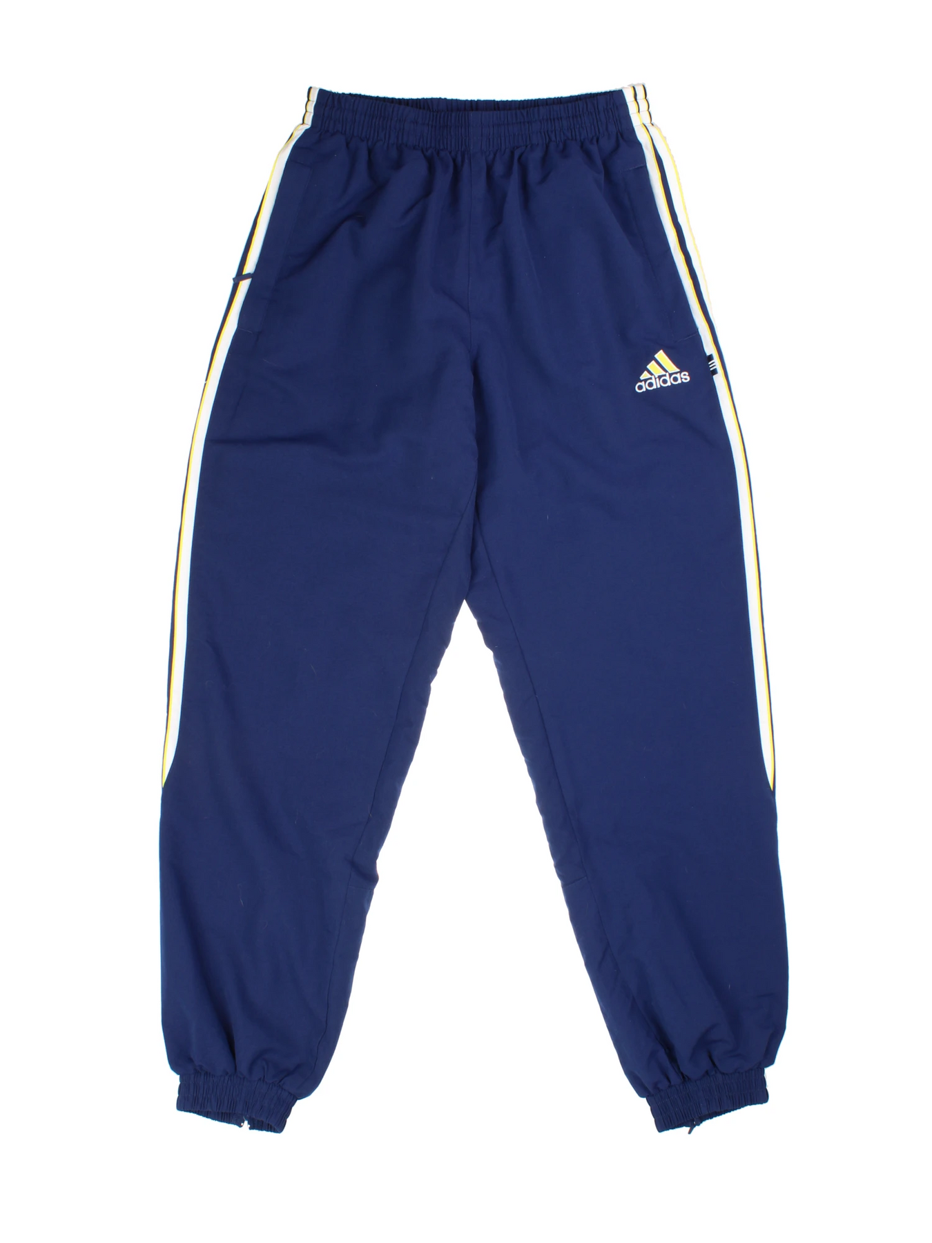 Elevate your casual style with these authentic Adidas Navy Blue Polyester Track Pants, designed for versatility and comfort. Featuring the iconic triple stripe design along the legs and prominent Adidas branding. The durable polyester construction provides lightweight comfort, making them ideal for workouts, lounging, or casual outings. With an elasticated waistband and cuffs, these size S track pants offer a relaxed, secure fit for everyday wear. Pair with trainers and a vintage tee to complete the ultimate streetwear look or wear for your next training session. Don't miss out on this essential sportswear staple, perfect for those who appreciate classic Adidas style and premium quality.