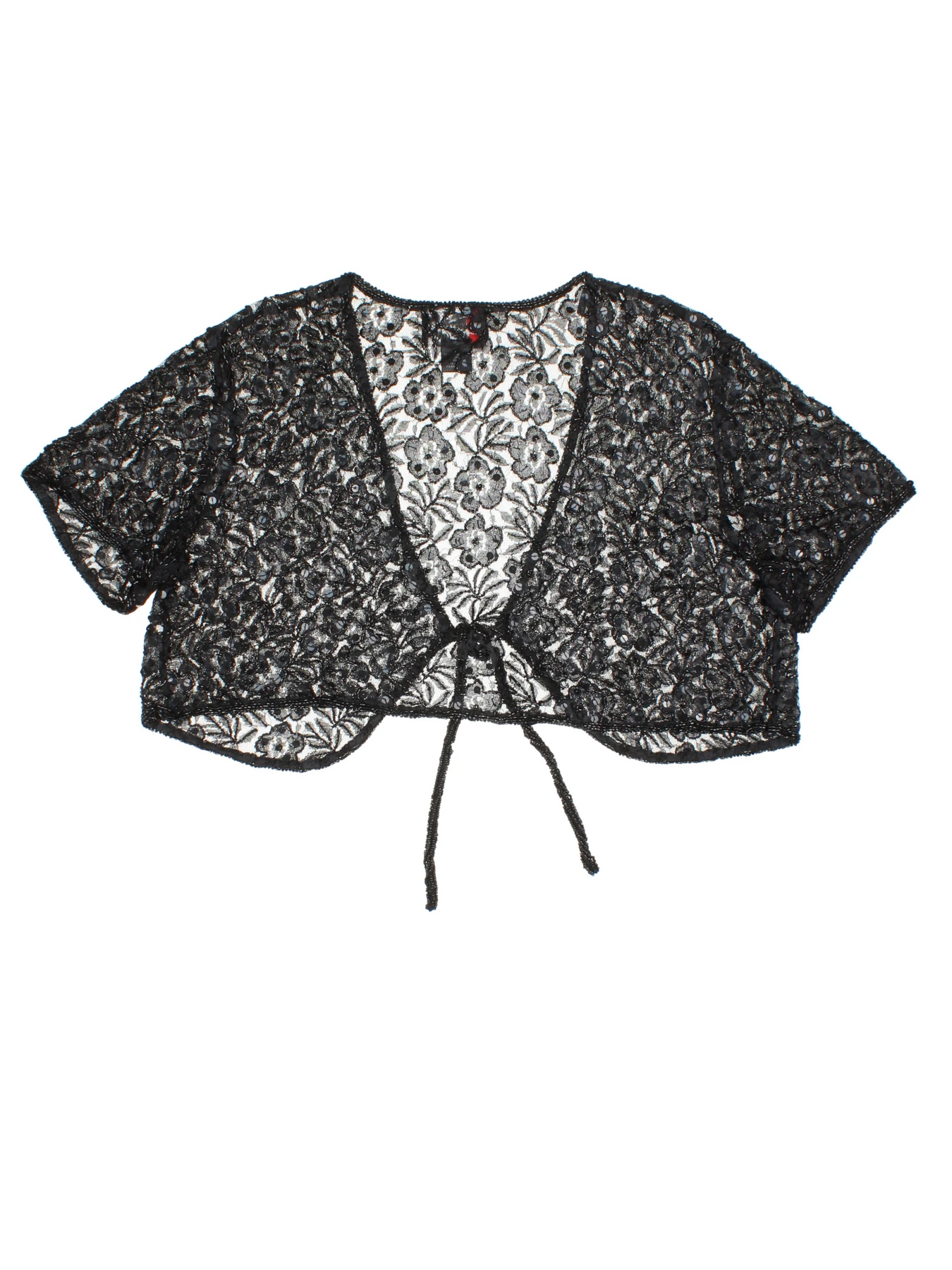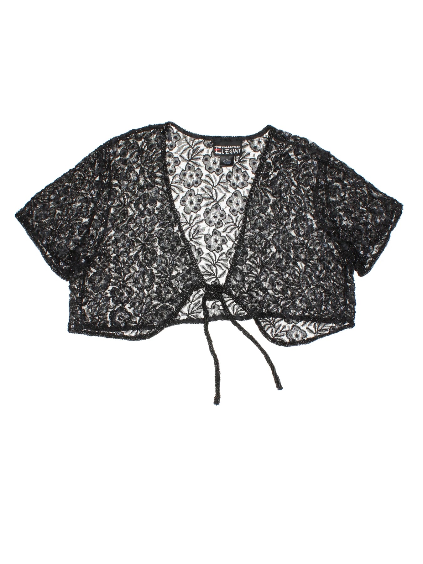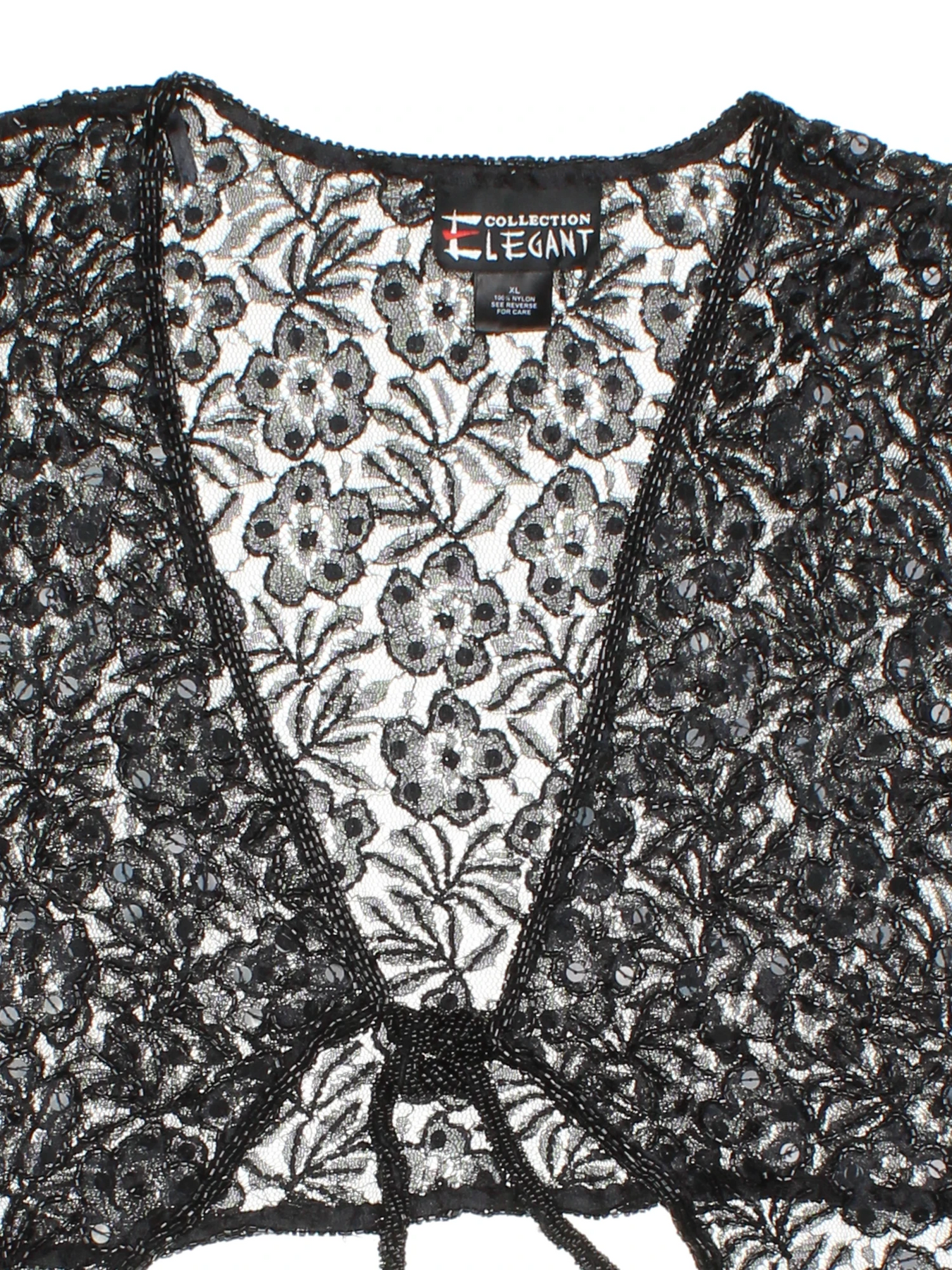 Add a touch of sophisticated charm to your evening look with this Elegant Collection Black Lace Floral Short Sleeve Shrug in a flattering L fit. Showcasing intricate floral lace detail with subtle sequin accents, this breezy open-front cardigan layers effortlessly over camisoles or sleeveless dresses for instant 90's party flair. The lightweight sheer material offers both coverage and allure, making it ideal for festive occasions or cocktails. Its tie front fastening enhances the feminine silhouette whilst the relaxed sleeve ensures easy styling.