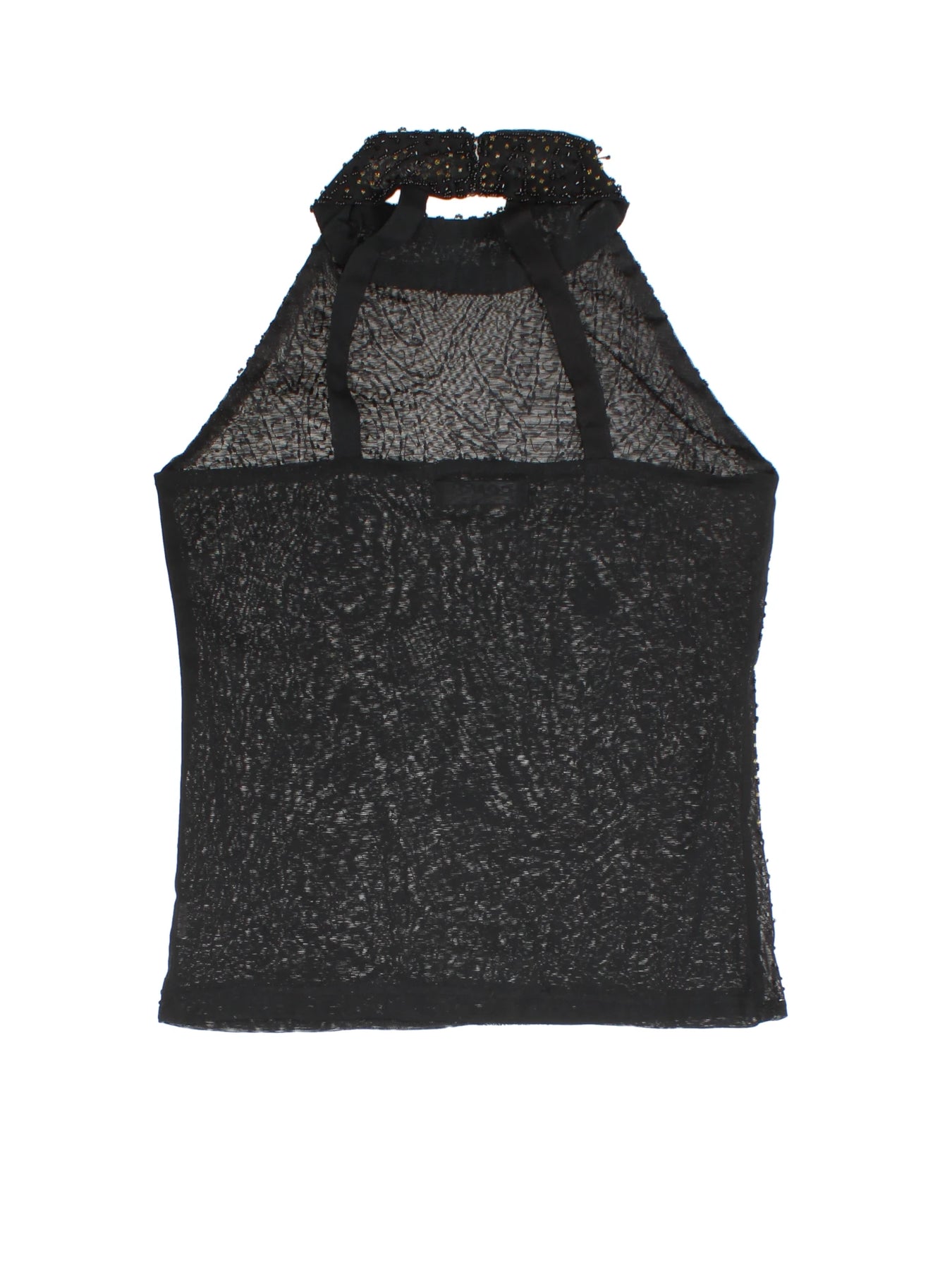 Step into the spotlight with the Conos Black Beaded Halterneck Mesh Top in size XXS, crafted for women who appreciate elegance and striking detail. This sleeveless partywear essential features a sheer black mesh fabric intricately embellished with delicate black and gold beads, making it a must-have for evening outings, parties, or any special event. The halterneck neckline, also adorned with beadwork, adds a touch of vintage-inspired glamour, while the lightweight polyester material ensures a comfortable yet sophisticated fit. Perfect for layering over your favourite camisole or bralette, this beaded top is designed to catch the light and elevate your look. Pair it with tailored trousers or a skirt and heels for a timeless ensemble that stands out. Discover the fusion of modern chic and classic style with this unique piece, ready to enhance your autumn/winter wardrobe.