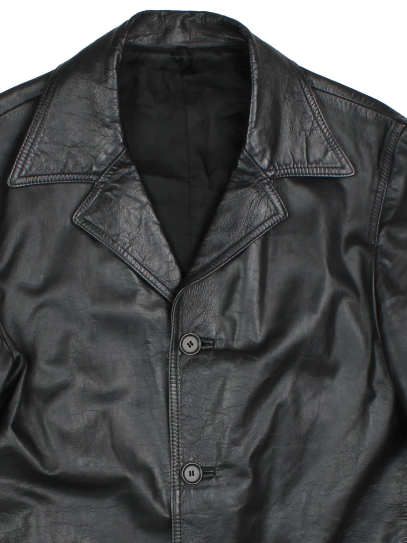 Discover timeless style with the ZEN Italia Black Leather Jacket. Crafted from high-quality genuine leather, this classic piece features a sleek black finish that encapsulates iconic 90's fashion. The large fit and structured tailoring deliver both comfort and sharp style, making it ideal for layering through seasons. Its wide lapel collar and front button closure add a sophisticated touch, while spacious pockets provide practicality for everyday essentials. Whether you're upgrading your casual wardrobe or seeking a standout coat for special occasions, this Italian-made jacket effortlessly complements trousers, jeans, or smart-casual outfits. Elevate your look with enduring confidence and make a statement with authentic vintage outerwear.