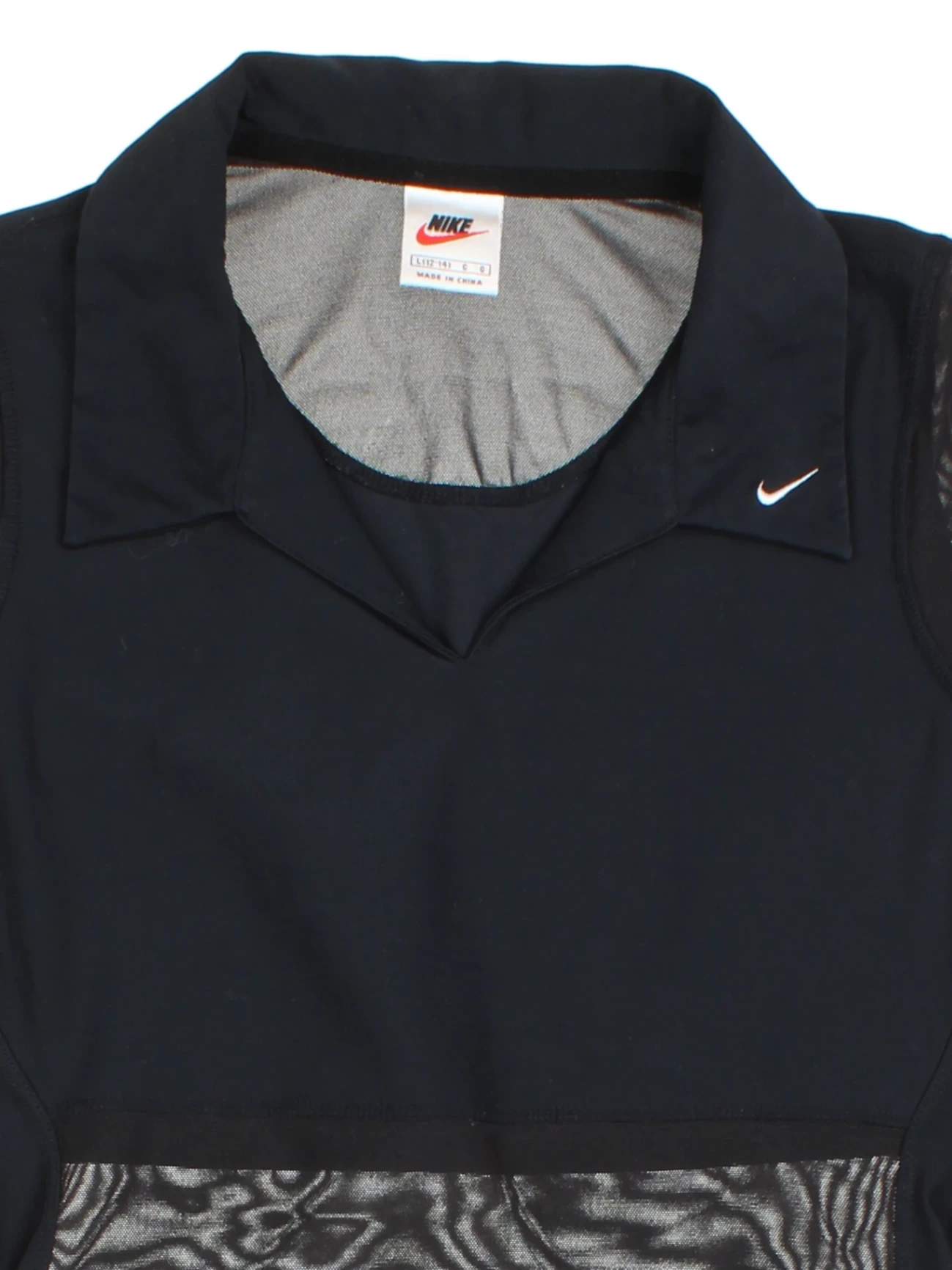 Elevate your activewear collection with this Nike Black Mesh Panel Polo Shirt, blending sporty 90's style and modern comfort. Crafted from lightweight polyester, this unique top features sheer mesh panelling on the sleeves and waist for an airy, breathable fit, perfect for both casual outings and energetic sports sessions. The classic polo collar, iconic Nike logo on the chest and tailored silhouette make this piece ideal for anyone who values both retro vibes and fashion-forward edge. Whether paired with trainers for a gym-ready look or styled with jeans for a casual day out, this versatile shirt is a wardrobe must-have for lovers of vintage and athleisure style.