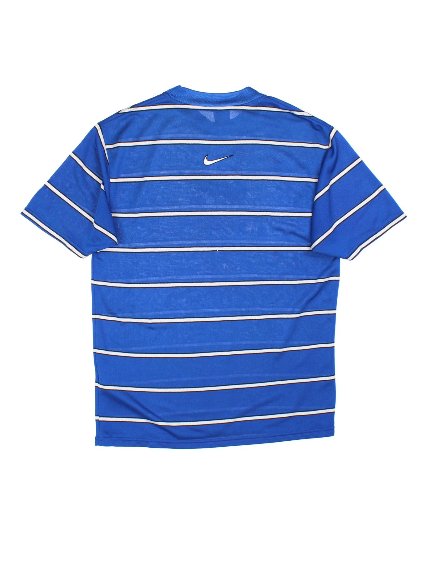 Bring a pop of colour and classic sports style to your wardrobe with the Nike Blue Striped Training Top in size M. This vintage-inspired 90's T-shirt features bold horizontal stripes in blue, accented with the iconic Nike Swoosh logo on the chest, ensuring you stand out at any casual event or streetwear gathering. Crafted from breathable cotton, it offers a comfortable fit suitable for everyday activities, making it an essential piece for summer days, training sessions, or laid-back outings. Ideal for those who appreciate retro flair, this T-shirt easily pairs with jeans, joggers, or shorts for a timelessly cool look. Step up your vintage game and enjoy all-day comfort with this versatile Nike classic.