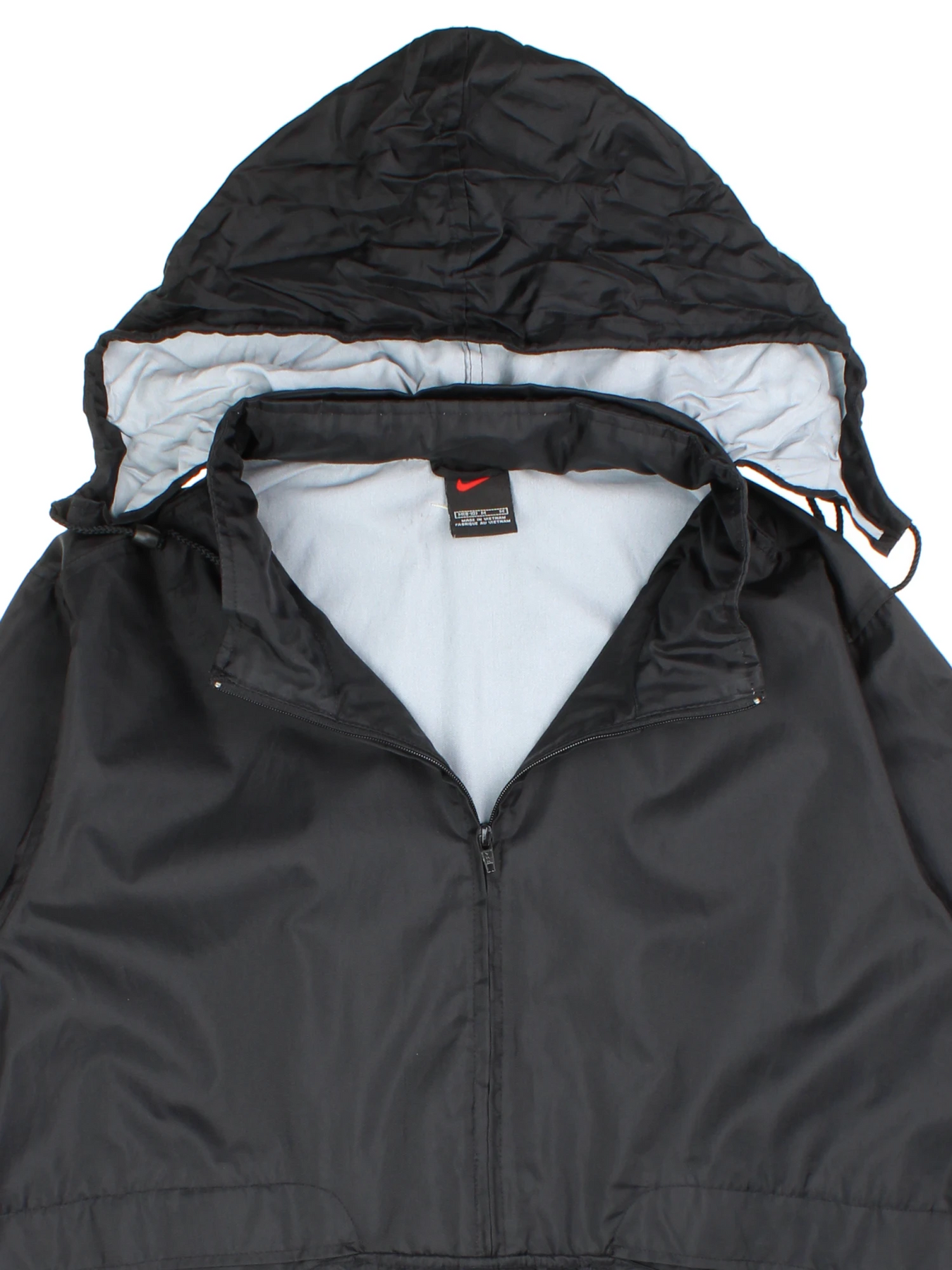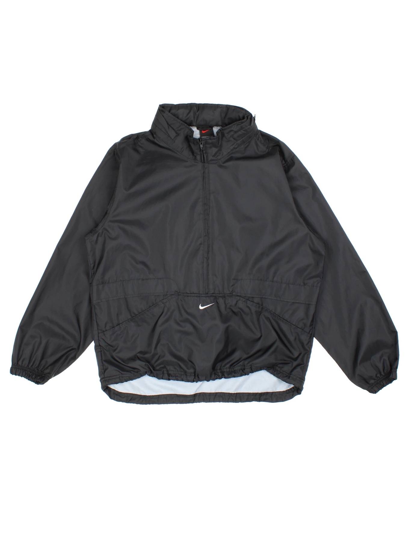 Elevate your outerwear collection with this Nike Black Half Zip Hooded Nylon Pullover Jacket in size Large, an essential addition for fans of vintage-inspired sportswear. Crafted from durable nylon, this classic 90s windbreaker provides lightweight protection and breathability, perfect for unpredictable weather conditions. Featuring a half zip front, attached hood with drawstring for custom fit, and iconic Nike swoosh logo embroidery, this jacket combines style and practicality in a timeless black colourway. The relaxed fit with elasticated cuffs and hem ensures you stay protected from the elements while maintaining unrestricted movement. Style this piece with jeans or joggers for an authentic athletic vibe—essential for those who appreciate genuine Nike quality.