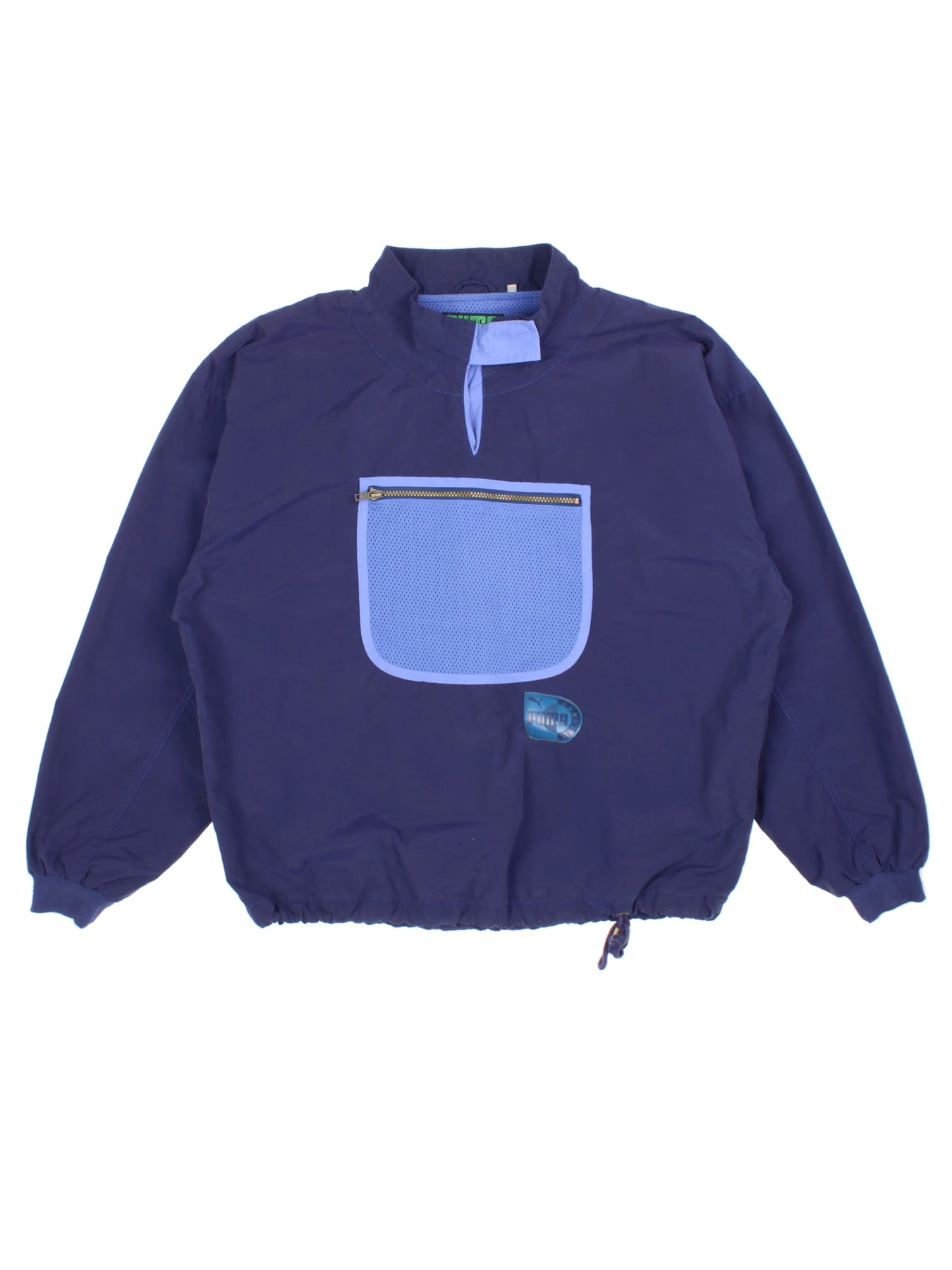 Upgrade your vintage wardrobe with this iconic Puma Vintage 90's Nylon Blue 1/4 Zip Pullover Drill Top. Crafted in lightweight nylon, this is perfect for transitional weather, offering both comfort and function with its mesh front pocket and adjustable drawstring hem. The bold blue colour and large mesh zip pocket on the front infuse your look with standout retro flair, making it ideal for casual streetwear or athletic-inspired outfits. The relaxed fit and classic 1/4 zip design ensure ease of movement, while the elastic cuffs and durable material keep you protected from the wind. Pair it with classic jeans or joggers for a timeless 90’s ensemble that never goes out of style. Don’t miss out on this unique blend of comfort, practicality, and trendsetting vintage charm—perfect for everyday wear or statement athletic looks!