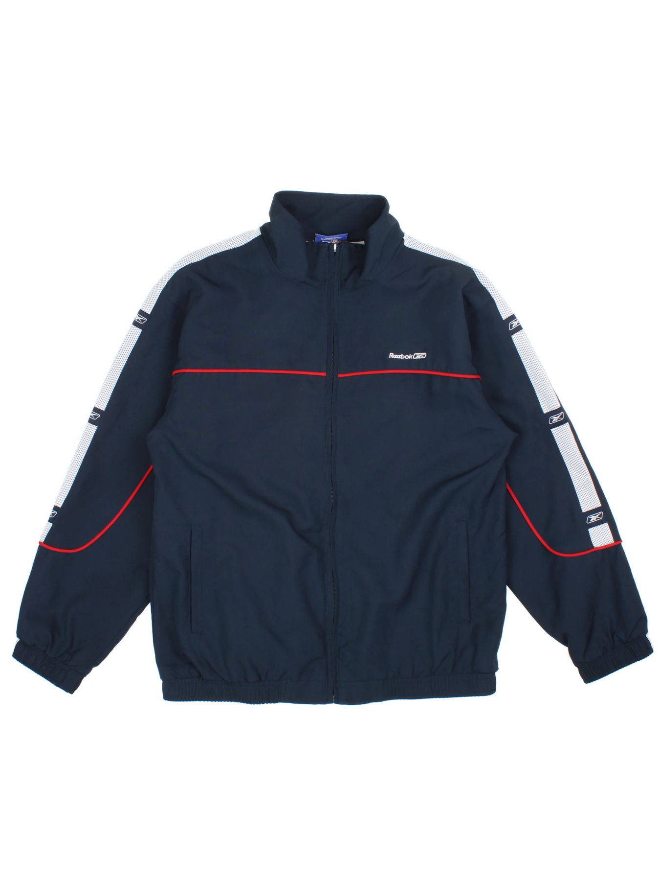Upgrade your athleisure with this classic Reebok Navy Blue Polyamide Retro Track Jacket, crafted for a perfect blend of vintage style and functional design. This M jacket features a full zip front, signature red piping details across the chest and sleeves, and white Reebok logo branding for authentic 90's flair. The lightweight polyamide construction ensures breathability, while the elasticated cuffs and hem offer a contoured, secure fit. Ideal for training sessions, casual outings, or layering during cooler days, this jacket delivers timeless sportswear style. Its rich blue hue is versatile, complementing a wide array of looks from streetwear to lounge attire. Stay comfortable and on trend with this standout piece that brings retro fashion back into play. Grab this essential for your vintage-inspired wardrobe today.