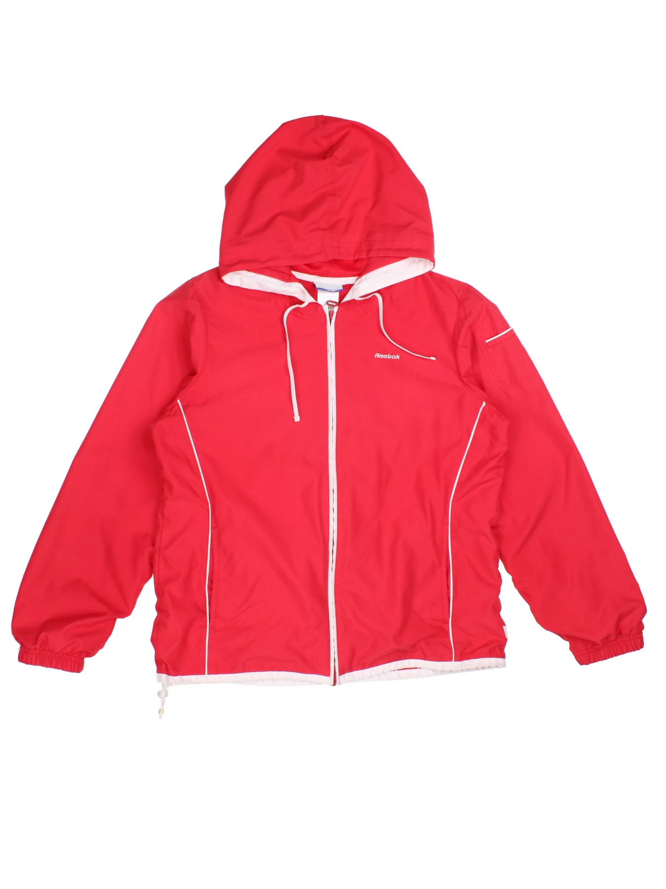 Elevate your collection with this Reebok Red Polyester Hooded Jacket, a standout piece that embodies the retro sportswear aesthetic of the 90's. Crafted from lightweight polyester, this jacket ensures comfort and durability for everyday wear or active outdoor pursuits. The vibrant red colour, accented with white piping and a contrasting white zip, creates a bold, eye-catching look that’s truly timeless. Featuring a full zip front, adjustable drawstring hem, and a lined hood for added protection. The M size ensures a relaxed, comfortable fit suitable for a wide range of occasions – from casual strolls to weekend adventures. With its signature Reebok branding, this jacket is a must-have for fans of vintage sports style. Add this unique piece to your wardrobe and turn heads wherever you go!