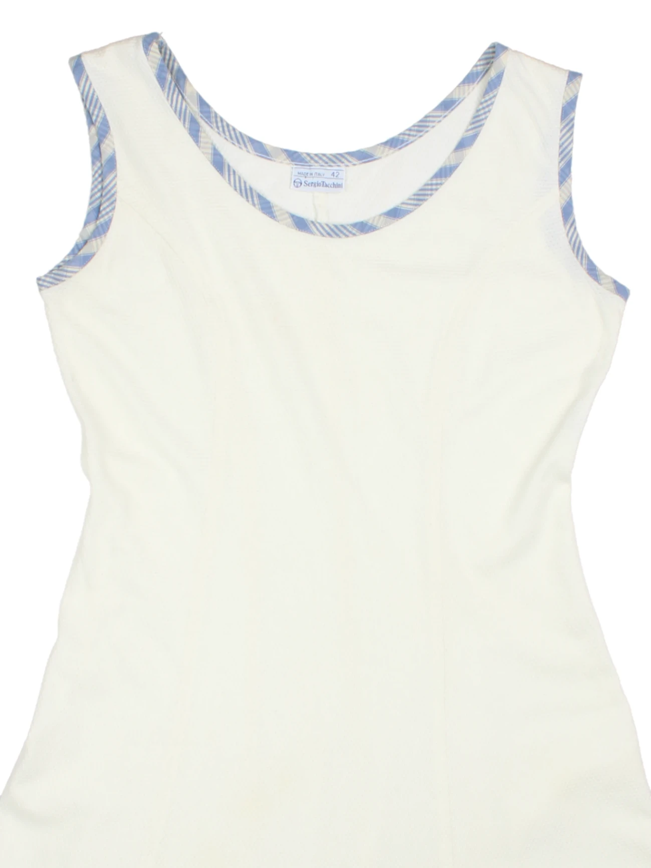Brighten up your wardrobe with this captivating Sergio Tacchini Vintage 90s White Cotton Mini Dress, designed with effortless style and quintessential retro flair. Crafted from premium cotton for softness and breathability, this sleeveless dress delivers a relaxed, comfortable fit that is ideal for summer adventures, weekend brunches, and daytime outings. The blue plaid trim around the neckline and armholes adds a unique touch of retro detail, while mini slits at the hem create a playful and feminine silhouette. Pair it with trainers or sandals for an easy, timeless look, and embrace true summer comfort and charm.