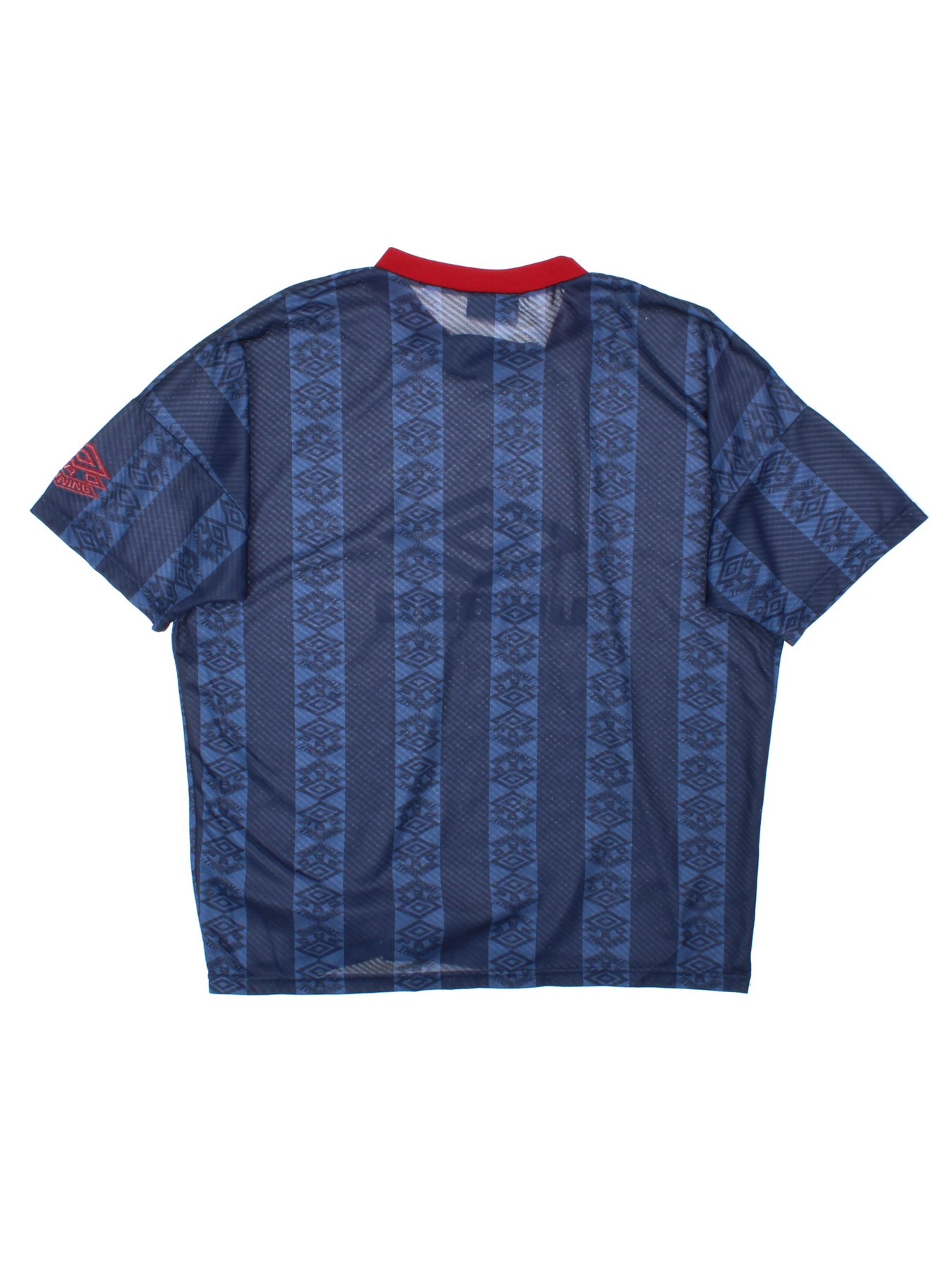 Elevate your retro wardrobe with the Umbro Vintage 90's Blue Patterned Polyester Football Shirt, featuring an iconic geometric design and bold red collar for classic sportswear appeal. This large-sized jersey is expertly crafted from lightweight polyester, offering a breathable fit ideal for active days, match outings, or casual urban styling. The vibrant red Umbro branding stands out against the deep blue patterned stripes, delivering unmistakable vintage flair. Pair it with denim or track bottoms for a truly versatile look that turns heads both on and off the pitch.