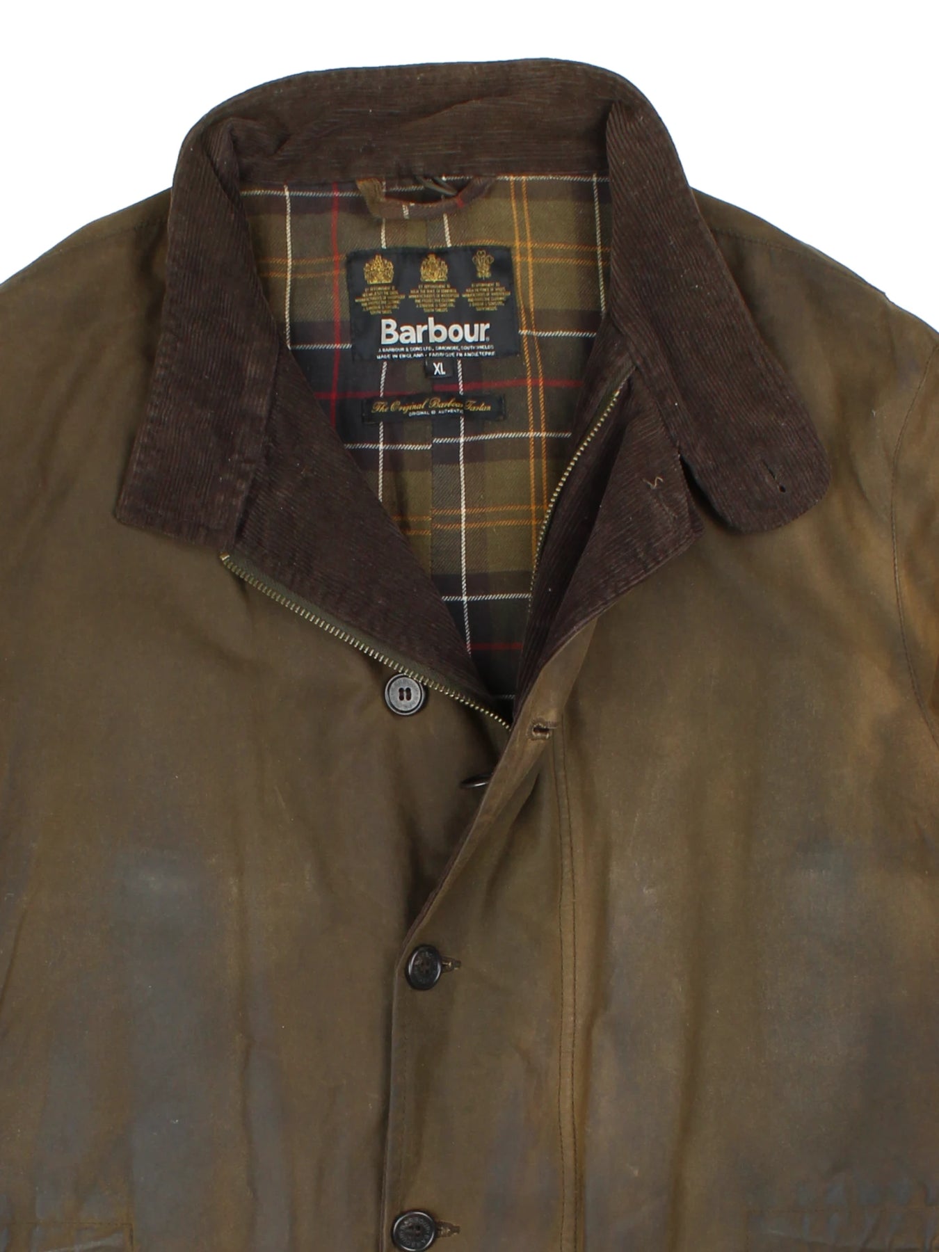 Embrace timeless country style with this Barbour Waxed Cotton Jacket in classic tan, engineered for the ultimate outdoor experience. The XL fit provides relaxed layering, making it ideal for countryside walks, festivals, or brisk city commutes. Finished with a brown corduroy collar, sturdy button front, and multiple utility pockets, this jacket is built for both functionality and unmistakable style. Perfect as a versatile autumn-winter staple, this Barbour coat ensures protection from the elements while elevating any casual or outdoor look. Pair with boots and jeans for a classic British countryside ensemble.