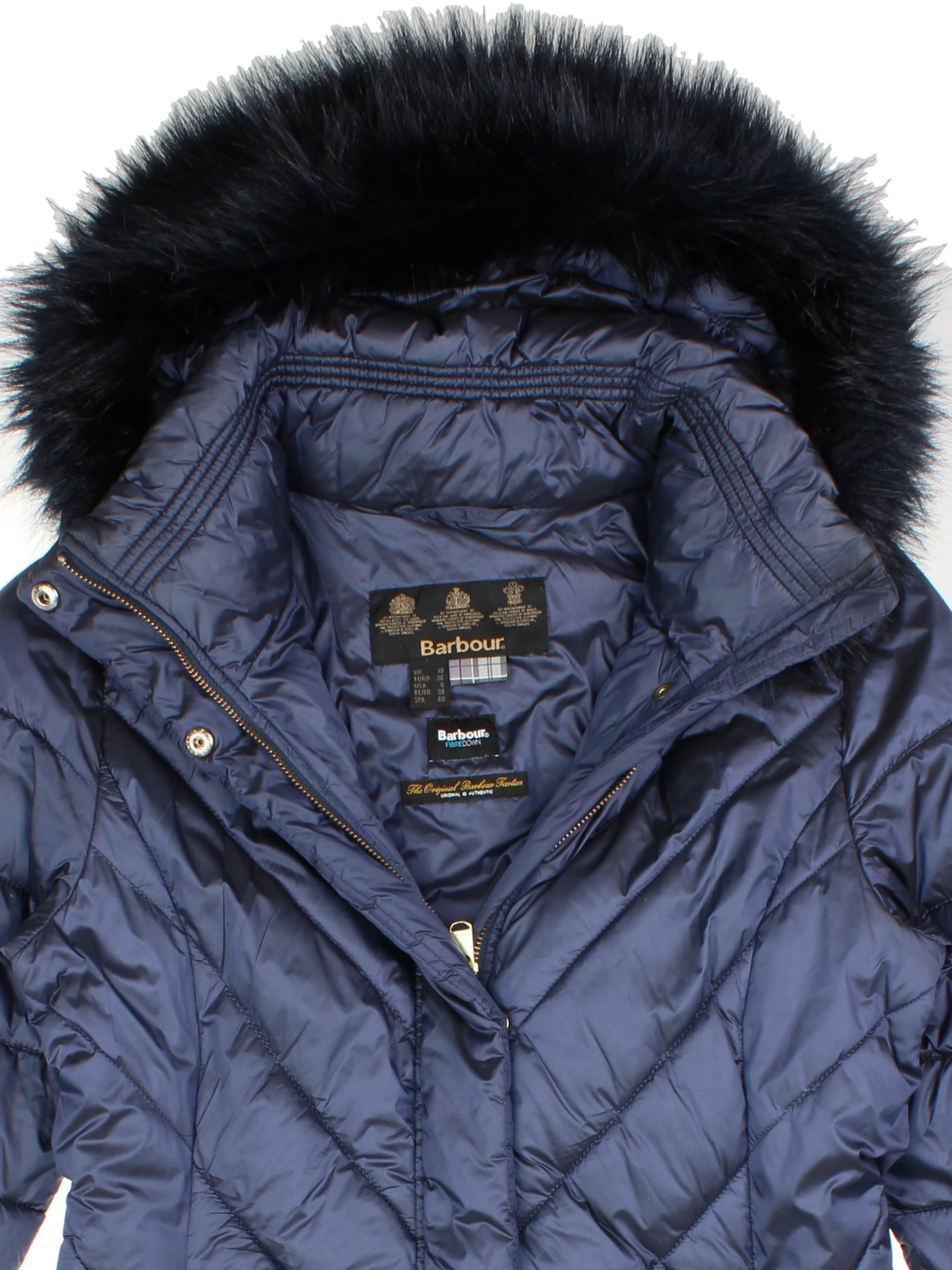 Experience ultimate comfort and timeless style with the Barbour Navy Blue Quilted Hooded Long Coat in S. Crafted from durable polyester, this coat features a beautifully quilted design with a stylish faux fur-trimmed hood, ensuring you stay warm and elegant throughout the colder seasons. The navy blue colour offers versatile styling, while the full-length cut and secure zip closure provide enhanced protection against chilly winds. Gold-tone zip pockets add both practicality and a touch of sophistication, making this Barbour piece perfect for winter walks or daily urban adventures. As part of our exclusive A/W24 Collection, this coat is the ideal addition to elevate your outerwear wardrobe. Pair with boots for a polished winter look or dress down with trainers for everyday comfort.