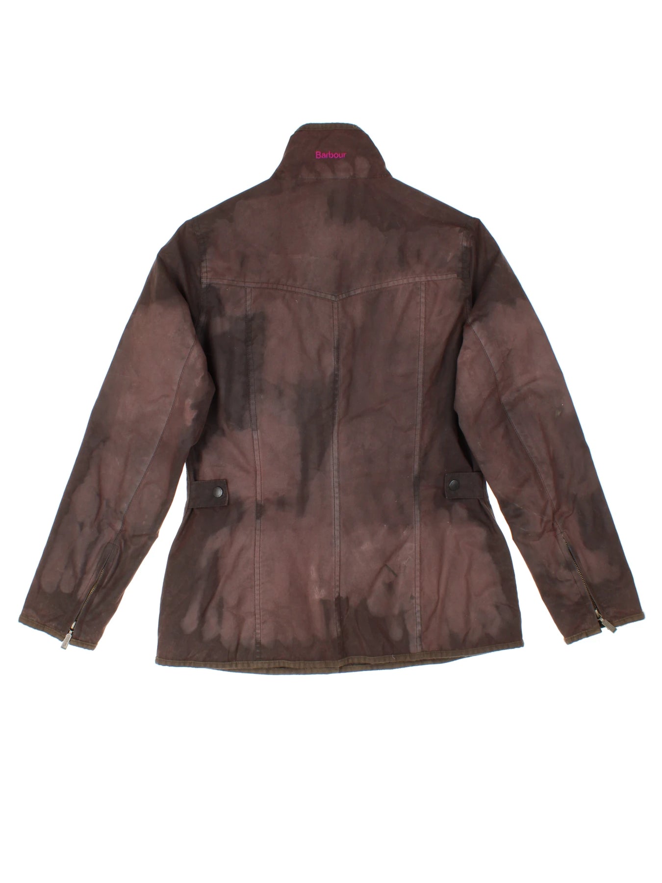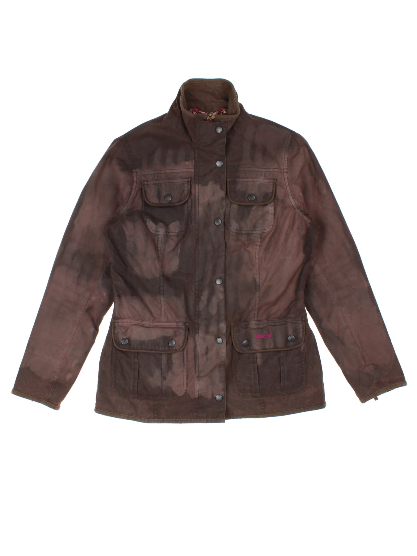 Discover timeless outdoor style with this Barbour Brown Waxed Cotton Jacket in size S. Crafted from authentic waxed cotton for robust water resistance and durability, this piece is perfect for countryside strolls and city outings alike. The interior features Barbour's signature floral lining, adding a touch of classic femininity and heritage flair. With a practical multi-pocket design, strong snap closures, and collared neck, this jacket ensures both function and fashion. Its flattering silhouette is ideal for layering in cooler months, while the adjustable tabs enable a custom fit. This classic Barbour jacket offers long-lasting style and practicality.