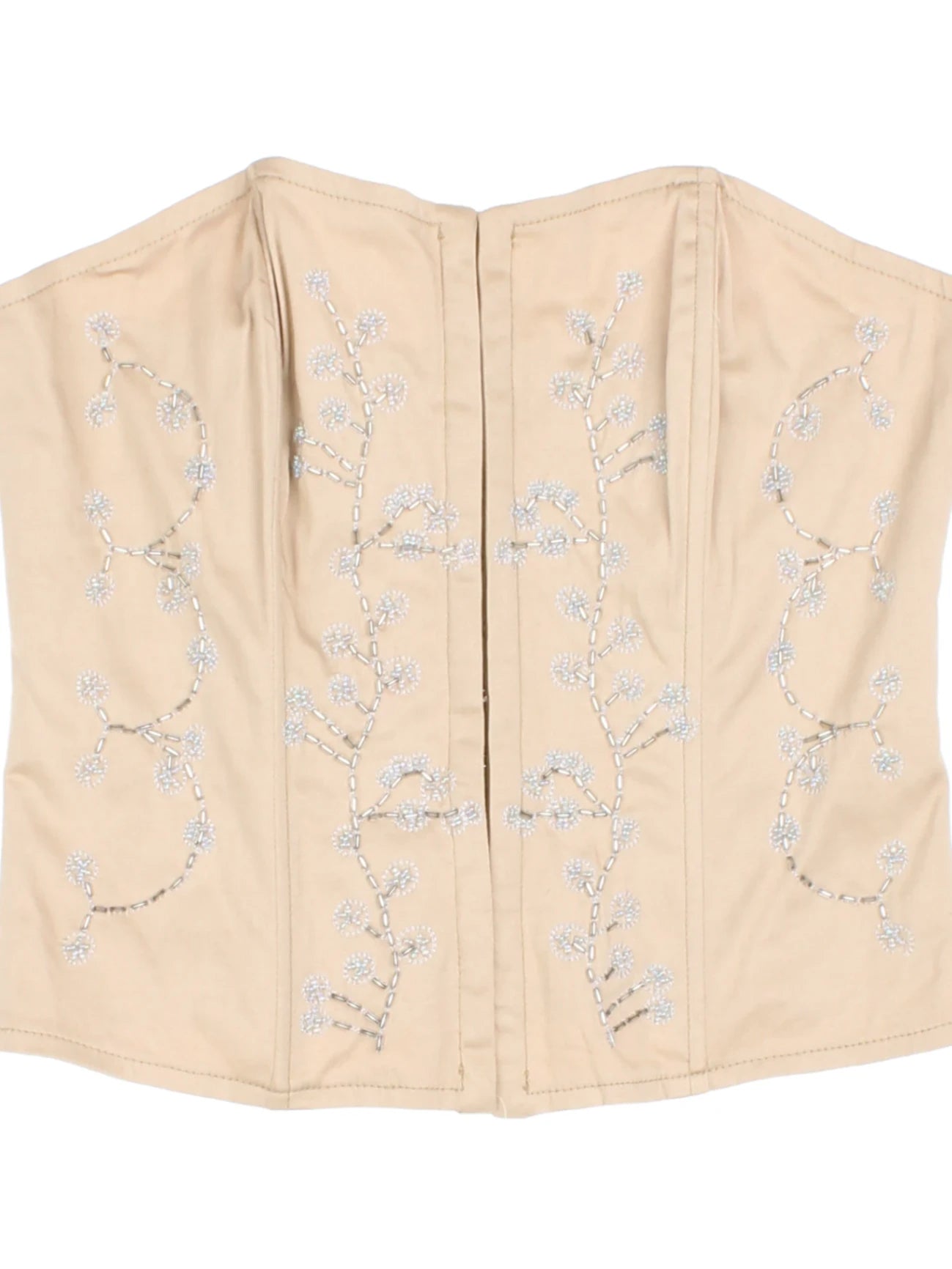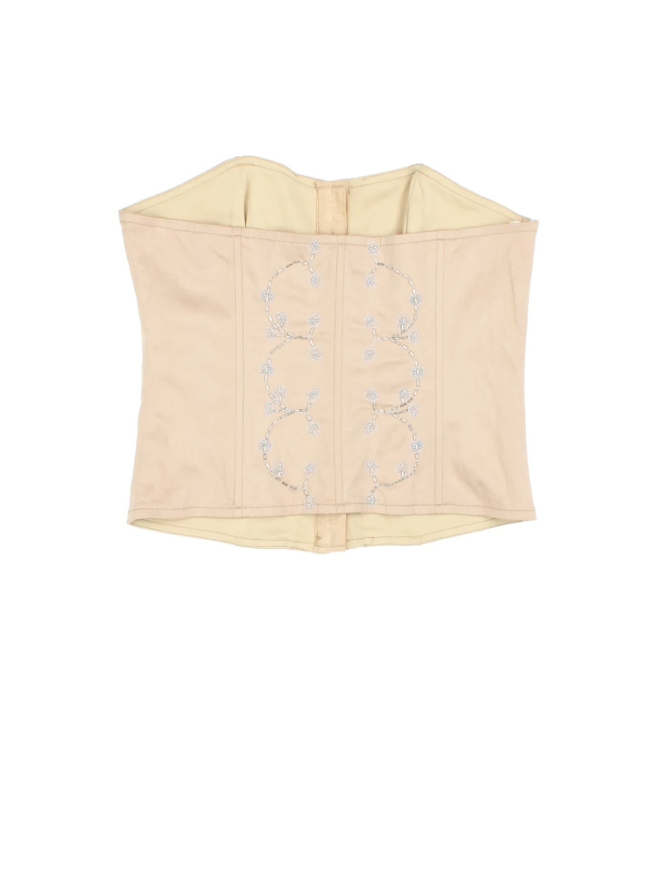Elevate your wardrobe with this Vintage Embroidered Corset Top, designed for a touch of timeless Y2K charm. Crafted from polyester, this strapless top features exquisite white floral embroidery across the front, creating a delicate and feminine allure. The structured fit flatters the silhouette for an elegant look ideal for spring and summer, whether paired with high-waisted jeans for a casual outing or a skirt for an evening event.