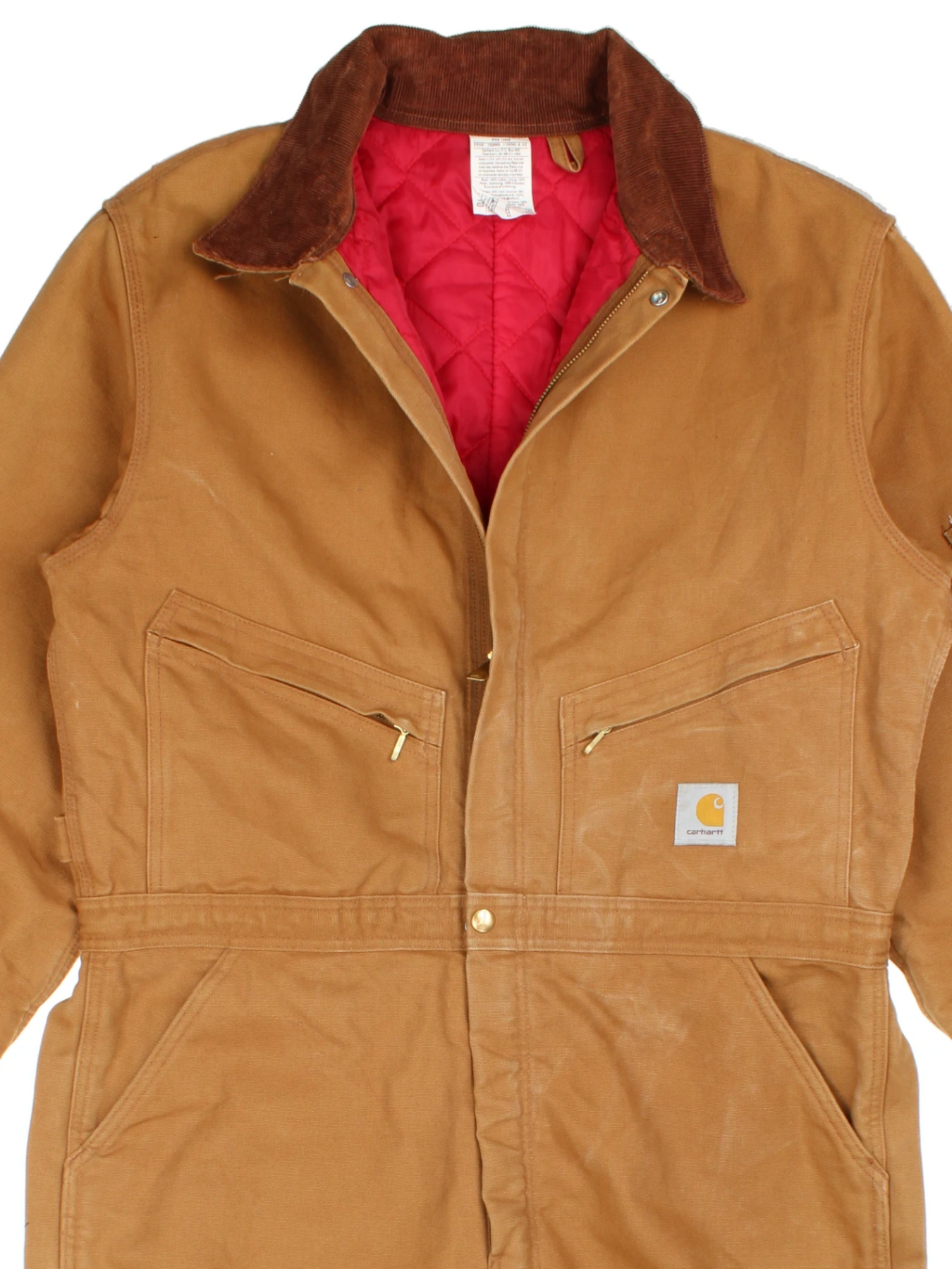 Embrace rugged durability with these Carhartt Tan Cotton Insulated Workwear Boilersuit, perfect for those seeking reliable protection and comfort in demanding environments. Crafted from heavyweight cotton with a quilted lining, these classic overalls feature a sturdy corduroy collar, zip-secured chest pockets, snap-fastening legs and a reinforced design that stands up to tough outdoor work. The iconic Carhartt logo and quality construction ensure both style and practicality, making them a must-have for vintage enthusiasts and workwear lovers alike. The tan colourway pairs easily with layers, ideal for winter tasks or day-to-day utility. Experience exceptional warmth and function in every detail, and upgrade your vintage workwear wardrobe with this timeless piece.