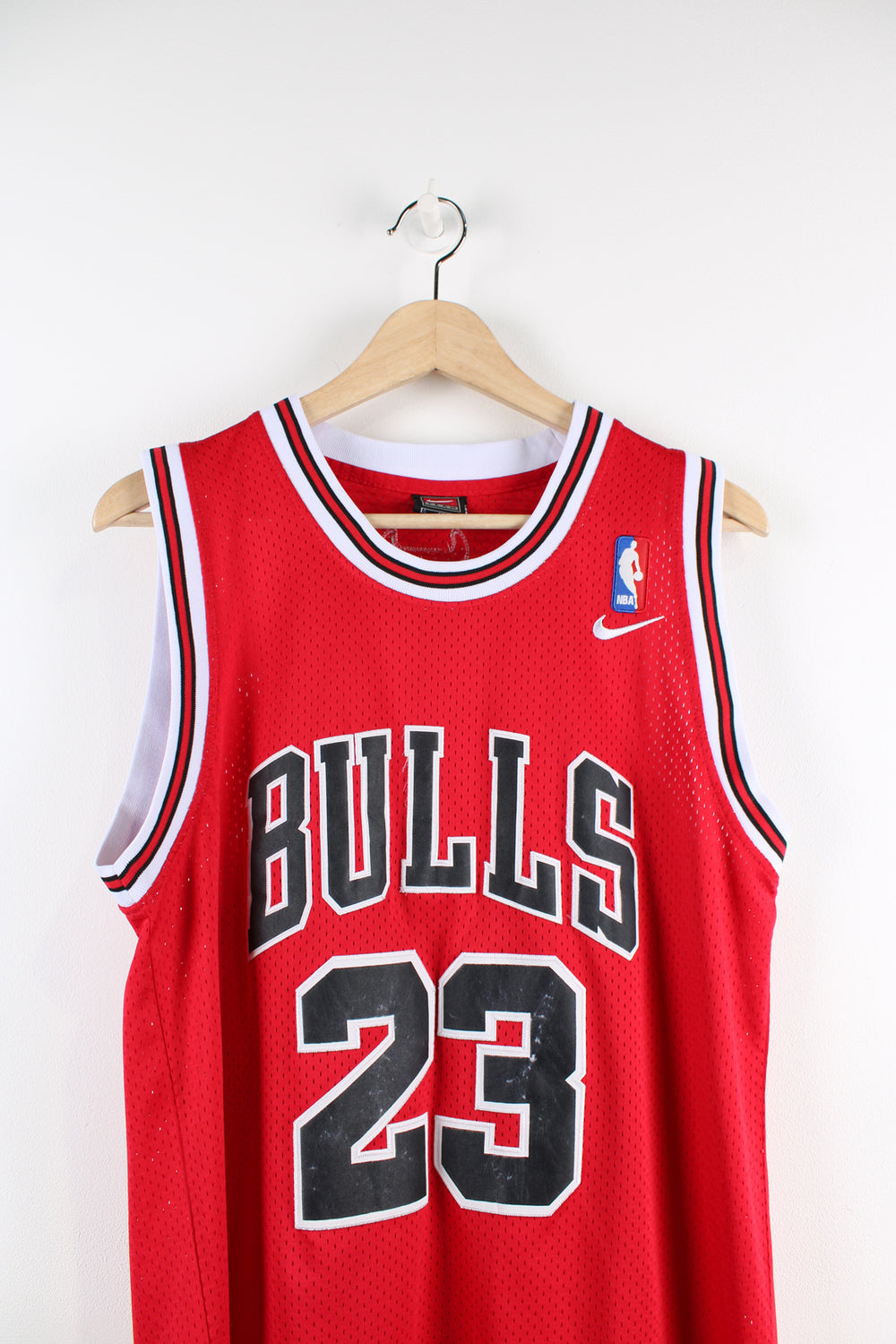 Chicago Bulls basketball jersey by Nike. Features embroidered Michael Jordan #23 lettering/ numbers on the front and back.