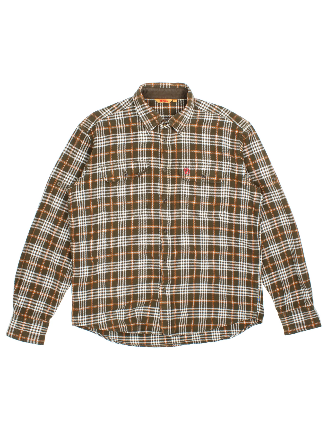 Experience timeless outdoor style with the Fjallraven XL Green Plaid Flannel Shirt, designed to balance classic aesthetics with hardwearing comfort. Crafted from premium flannel material, this shirt boasts an eye-catching green checked pattern, perfect for layering on brisk mornings or styling solo for casual days. The shirt features a button front, dual chest pockets, and striking orange and white plaid lines that add a modern twist to this vintage-inspired piece. Cut in an extra-large size, it delivers a relaxed fit ideal for workwear or outdoor adventures, ensuring comfort and durability with every wear. Upgrade your wardrobe with this versatile flannel shirt and channel rugged charm whether you're on the trail or in town.
