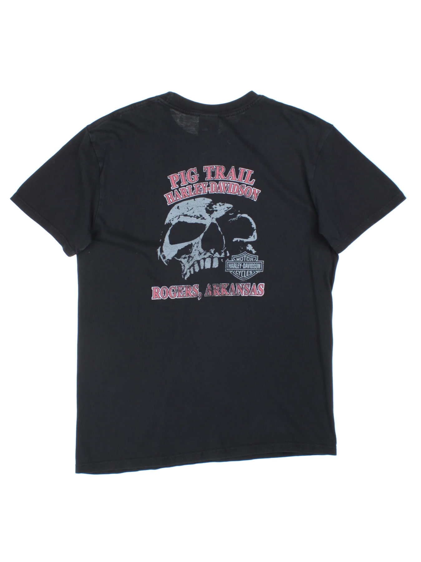 Showcase your rebellious style with this vintage Harley-Davidson Skull Graphic Black Cotton T-Shirt, featuring a standout 'Pig Trail Harley-Davidson' print on the back with a bold skull motif and a front emblem showcasing the iconic brand logo. Expertly crafted from breathable cotton for comfort, this men’s size M tee delivers classic biker edge with a relaxed fit. Made for lovers of authentic motorcycle culture, this Rogers, Arkansas special edition t-shirt is ideal for everyday wear, motorcycle rallies, or casual outings. Pair it with jeans or leather for a look that captures vintage biker cool and timeless freedom. Add this sought-after Harley-Davidson classic to your wardrobe today for unmatched authenticity and standout style.