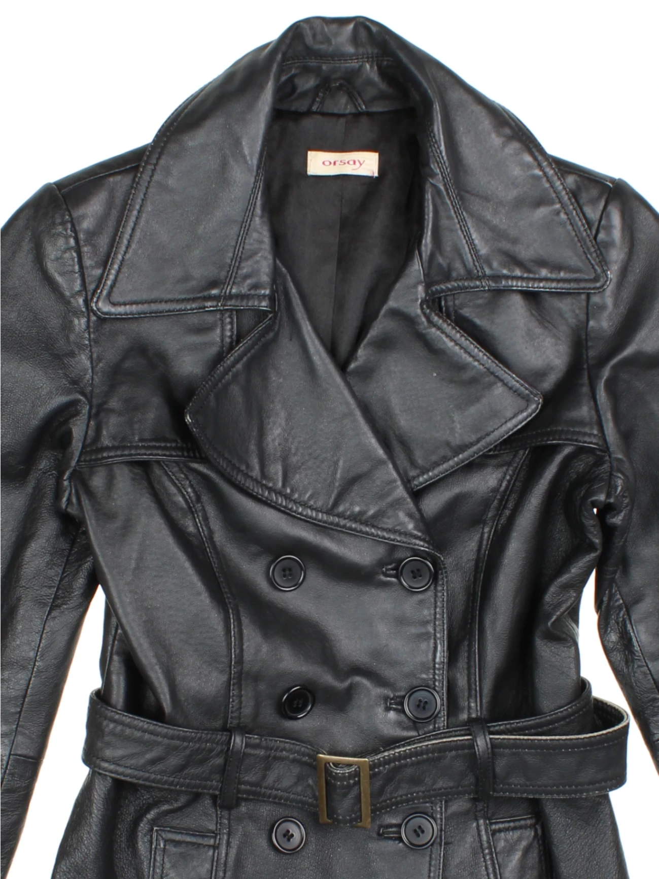 Discover timeless sophistication with this Orsay Women's Black Leather Trench Coat Jacket, crafted for those seeking a blend of elegance and edge. Made with premium leather, this jacket features a double-breasted front and a stylish waist belt for a flattering fit. The broad lapels and button details channel an iconic 90s outerwear appeal, ideal for city strolls or evening gatherings. Elevate your wardrobe with this versatile classic—perfect for layering through multiple seasons. Whether paired with denim or dresses, this piece is the ultimate wardrobe staple for adding a refined finish to any look.