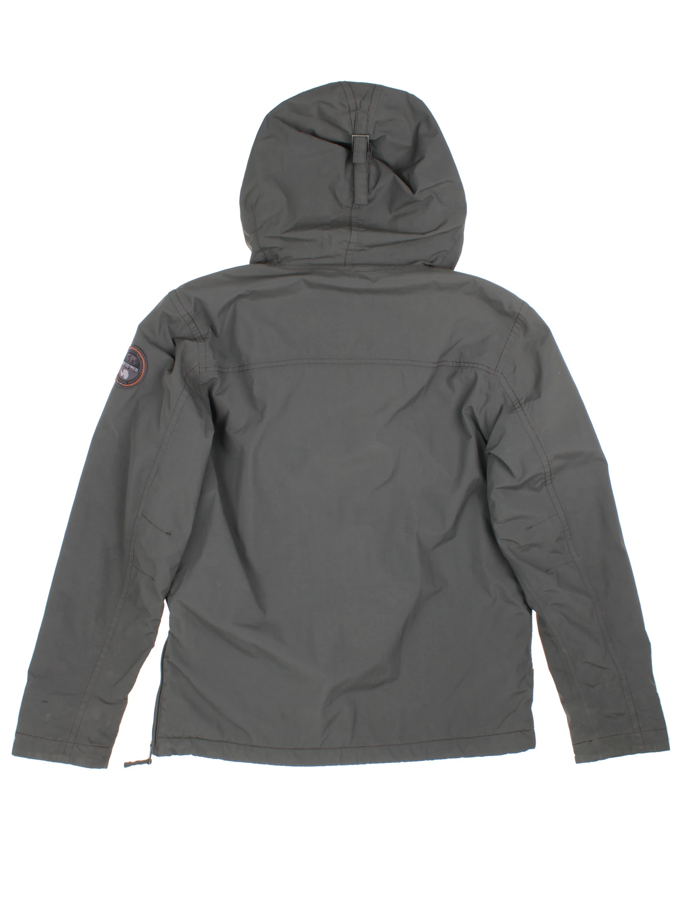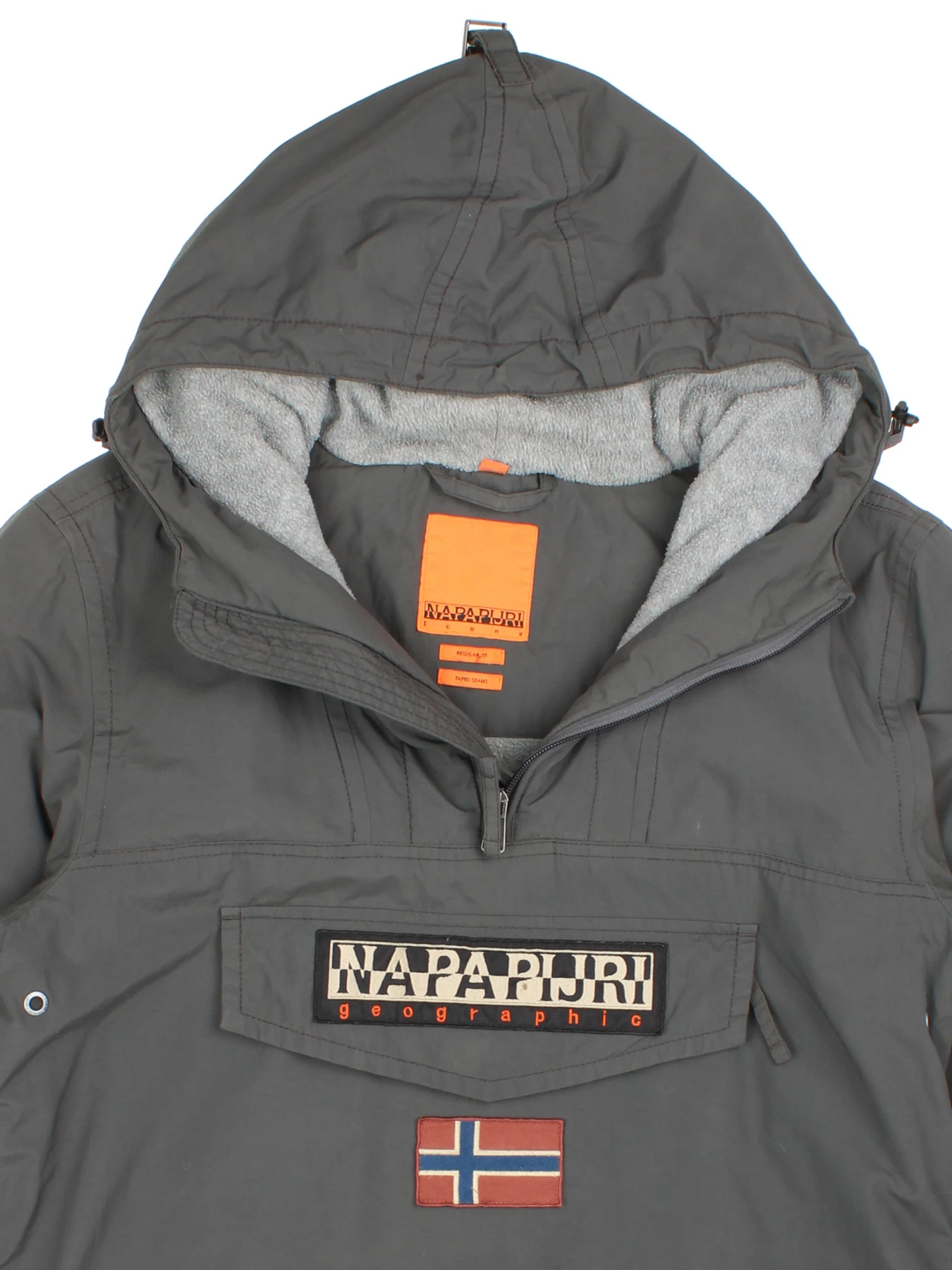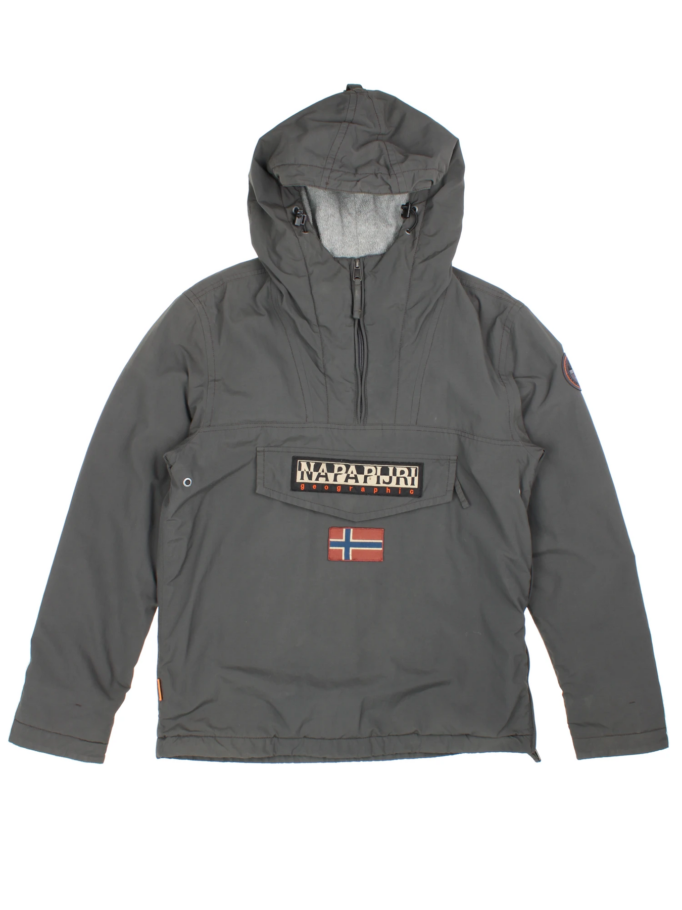 Stay warm and stylish with this authentic Napapijri Grey Hooded Anorak Jacket in size M, expertly crafted for people who enjoy outdoor adventures or daily urban commutes. Made from durable nylon, this jacket delivers hardy protection against the elements, featuring a water-resistant exterior, drawstring hood, and a functional pullover design for easy layering. The interior is lined with soft fleece for added comfort and warmth, while Napapijri’s iconic detailed logo and signature flag patch adorn the front pocket, making a bold statement. Designed for winter wear, this jacket offers a relaxed fit and versatile style perfect for layering during the colder seasons. Its practical features ensure exceptional performance in harsh conditions—ideal for hiking, outdoor pursuits or just braving the city chill. Elevate your outerwear collection with this classic piece, built to offer both fashion and function.