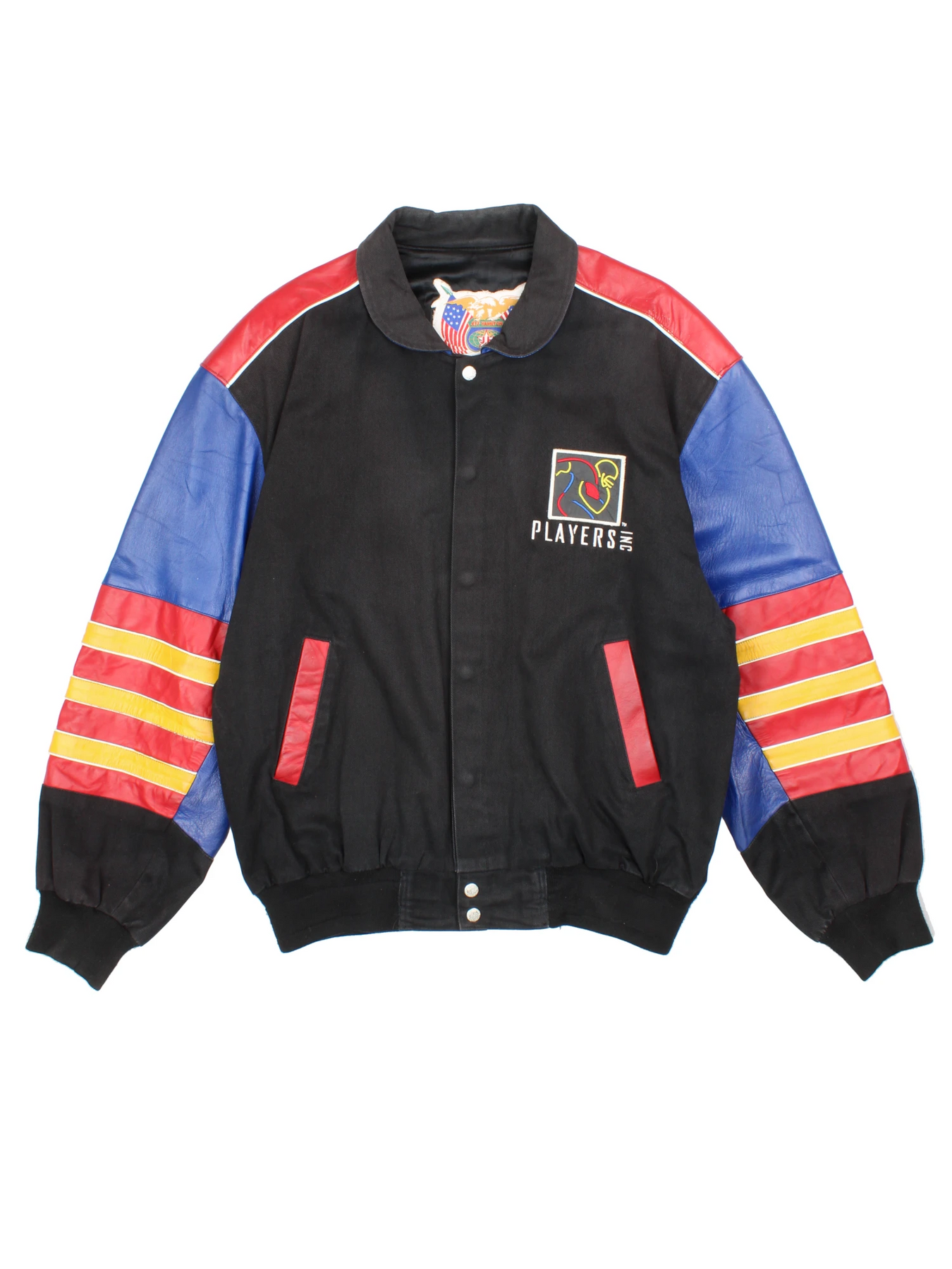 NFL Players Inc bomber/ varsity jacket made by Jeff Hamilton. Features a black cotton body with leather arms, collar and Players logo on the chest/ back.