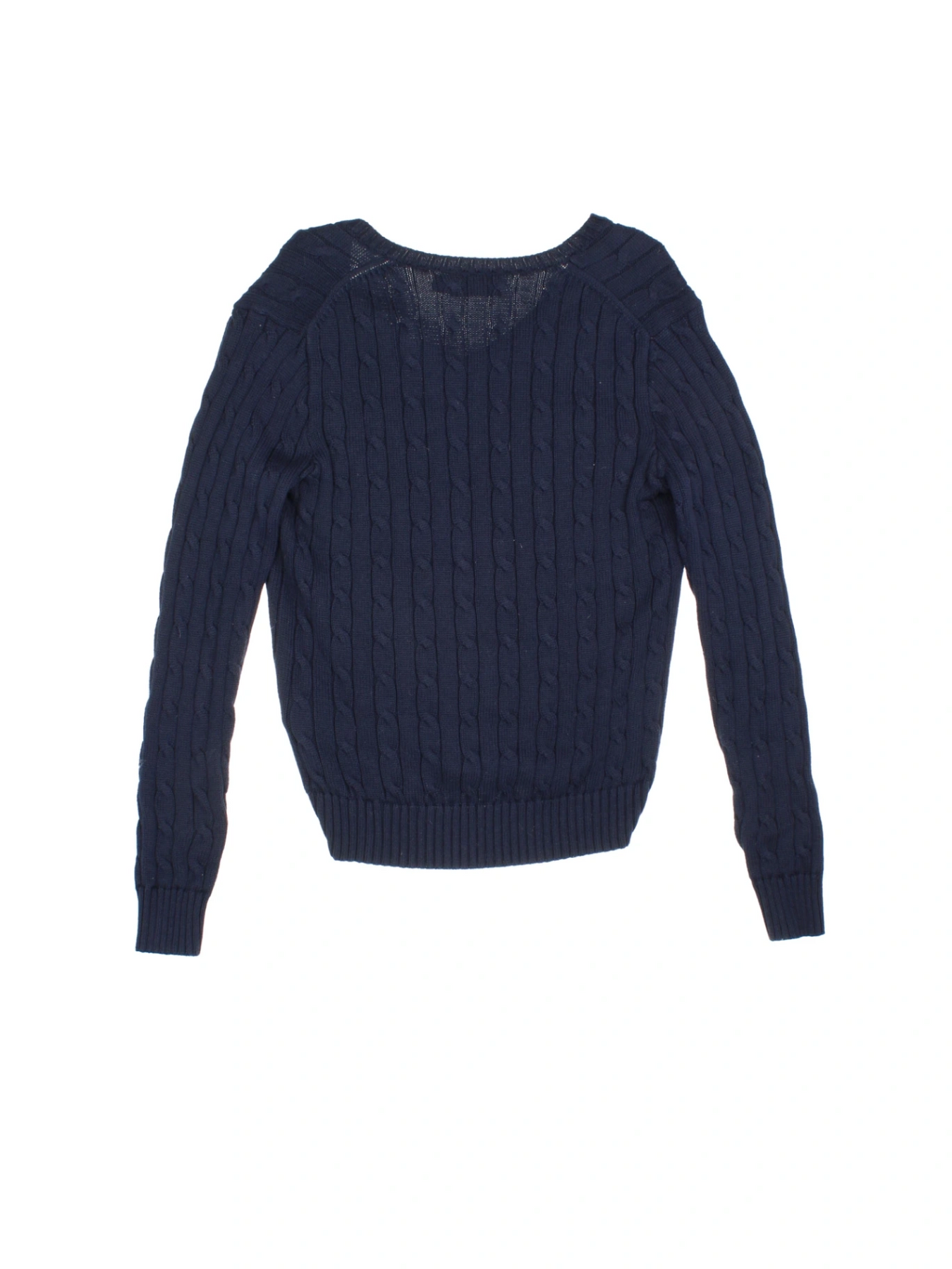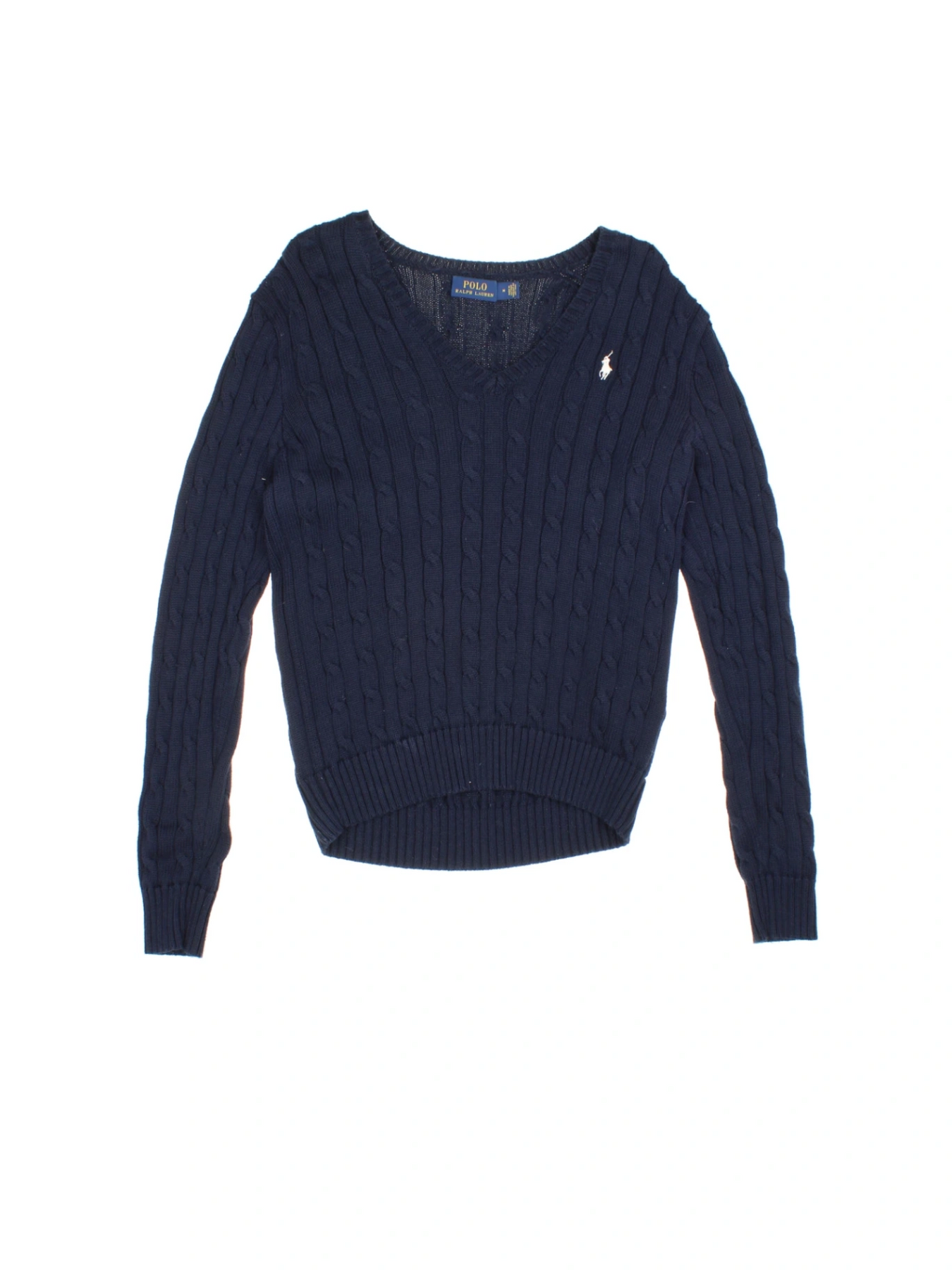 Elevate your wardrobe with the timeless Polo Ralph Lauren Navy Blue Cable Knit Cotton Jumper, perfectly crafted for effortless 90’s style. Made from premium quality cotton, this jumper delivers both breathability and warmth, making it an ideal piece for layering throughout the year. The classic navy blue shade complements any outfit, while the textured cable knit design and signature embroidered logo on the chest add a touch of luxury. Featuring a flattering V-neck and ribbed cuffs and hem. Pair it with jeans or skirts for a versatile look suitable for casual outings, work, or relaxed weekends. Upgrade your collection with this iconic knitwear staple that combines comfort and sophistication for any occasion.