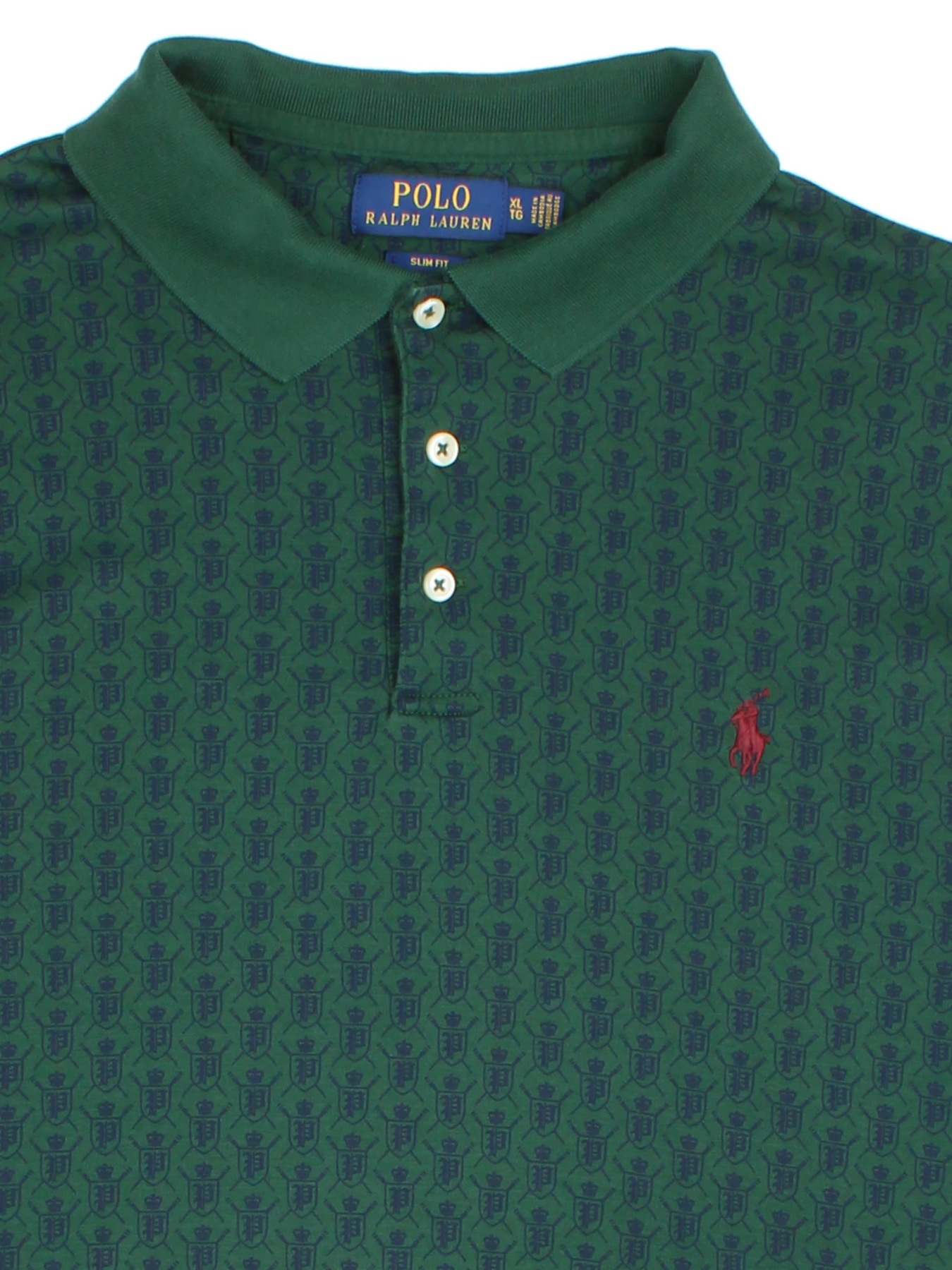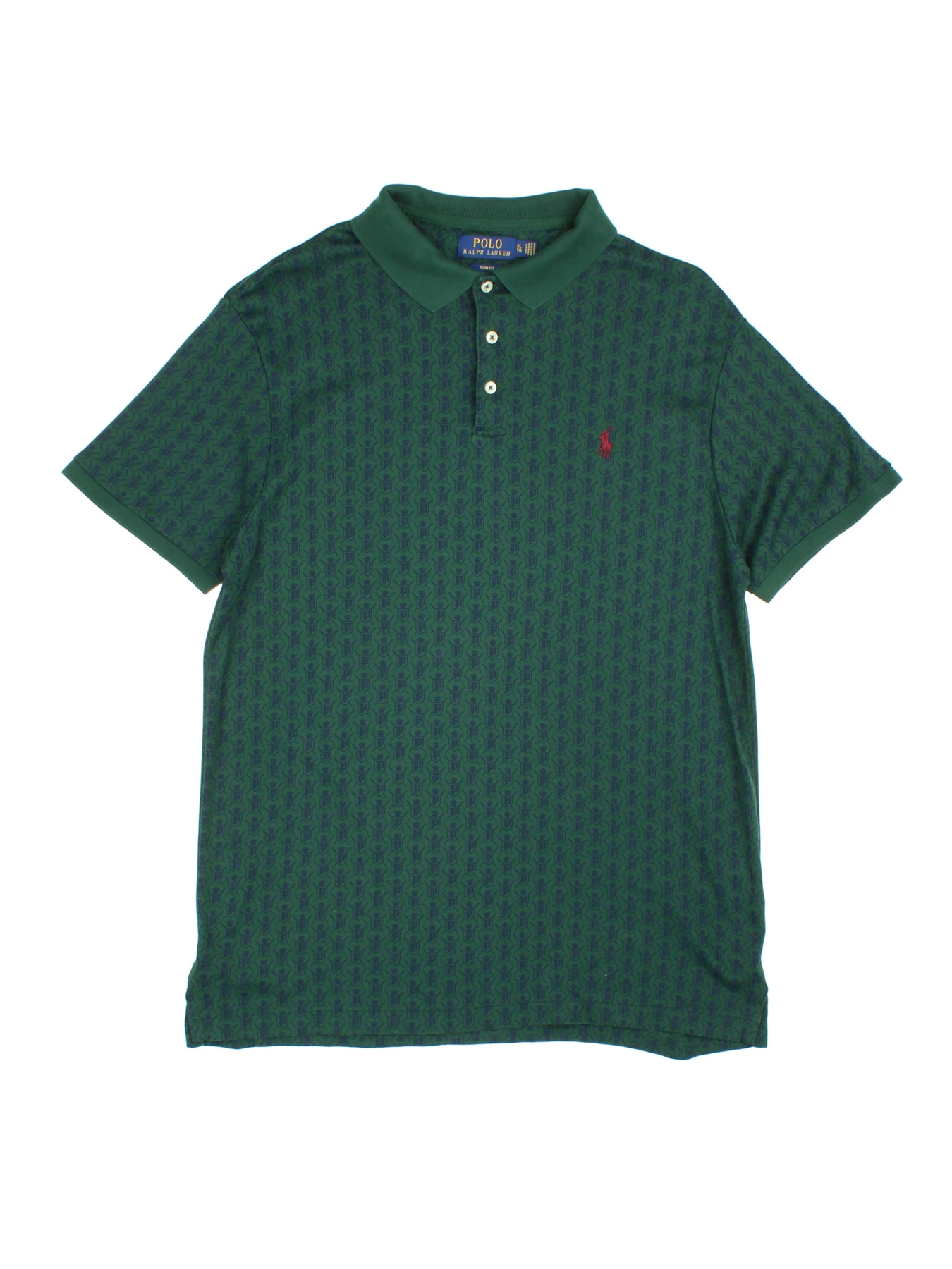 Elevate your casual wardrobe with this distinguished Polo Ralph Lauren Green Patterned Cotton Polo Shirt in size M, perfect for those who appreciate timeless style infused with signature detailing. Crafted from high-quality cotton, this vintage folk-inspired polo features an all-over crest motif and a classic green hue, complemented by the iconic red embroidered Polo logo on the chest. The slim fit and soft fabric ensure comfortable all-day wear whether you're heading to a laid-back brunch or spending the day out with friends. Pair it effortlessly with chinos or shorts for a versatile addition to your collection.
