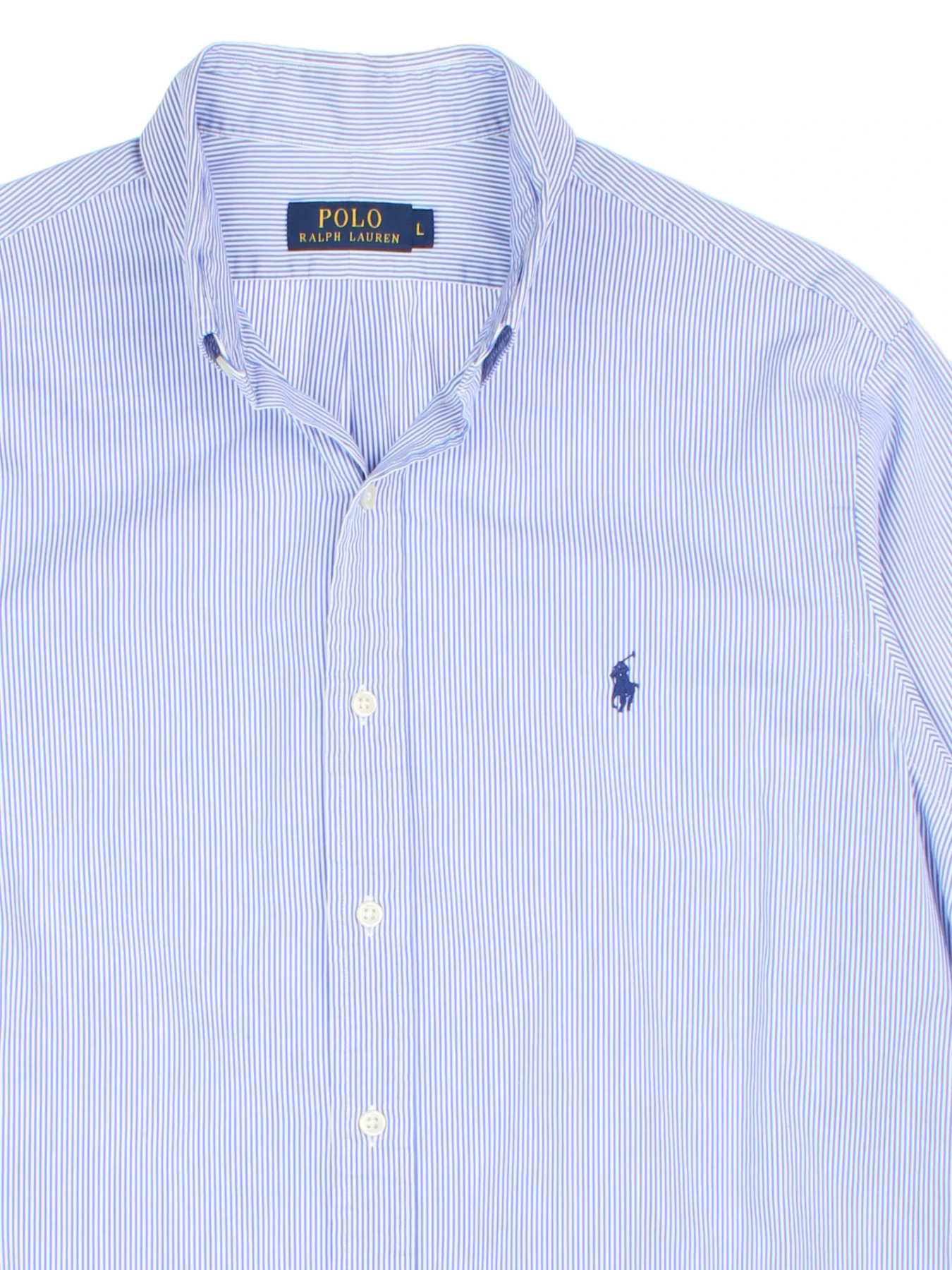 Upgrade your wardrobe with the Polo Ralph Lauren Blue Striped Cotton Shirt in size Large, crafted for those who appreciate timeless, versatile style. This classic long sleeve shirt features a refined blue and white striped pattern, tailored from soft, breathable cotton for enduring comfort throughout the day. The iconic embroidered Polo Ralph Lauren logo adds a touch of sophistication, making this collared shirt perfect for both formal and casual occasions. Pair this elegant shirt with tailored trousers for the office or dress it down with jeans for effortless weekend style.