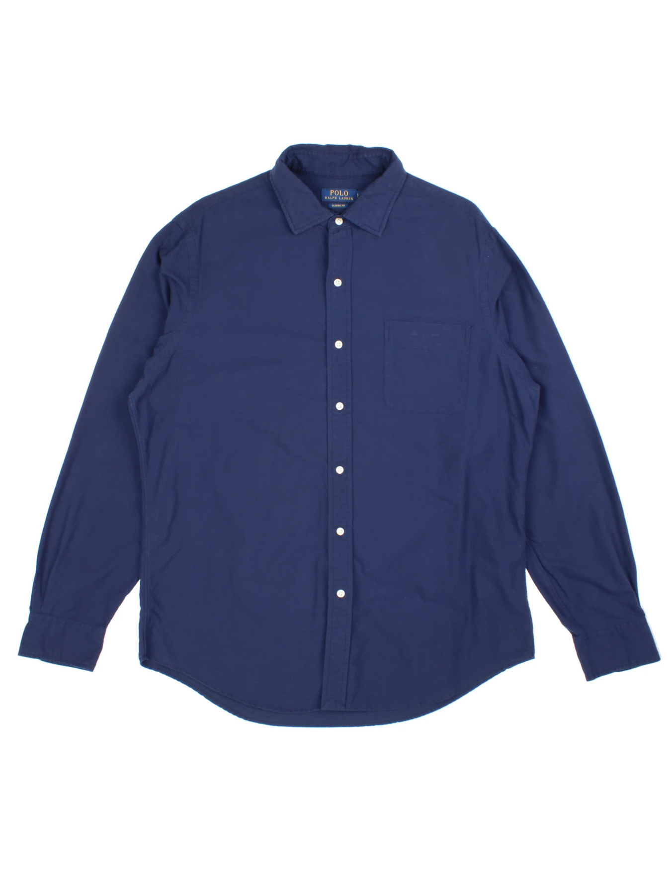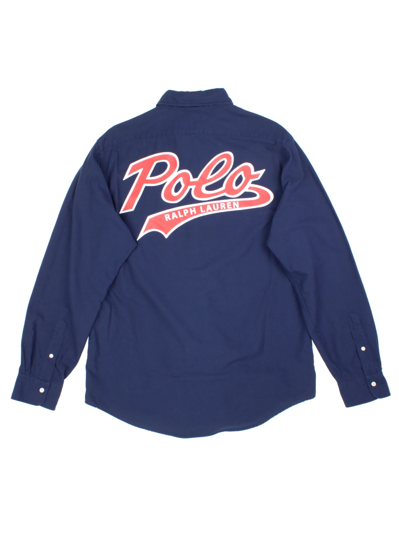 Elevate your wardrobe with this classic Ralph Lauren Polo Shirt in navy blue, featuring a bold, iconic Polo Ralph Lauren script logo across the back for standout style. Crafted from premium cotton, this long sleeve shirt offers a breathable and comfortable fit, ideal for both casual and smart-casual occasions. The classic fit design ensures a relaxed yet polished silhouette, finished with white button fastenings and a chest pocket for added detail. Perfect for layering or wearing on its own, this shirt seamlessly blends vintage-inspired workwear with timeless 90s style, making it a versatile staple for any collection. Pair it with jeans or chinos for an effortlessly refined look suitable for any season.