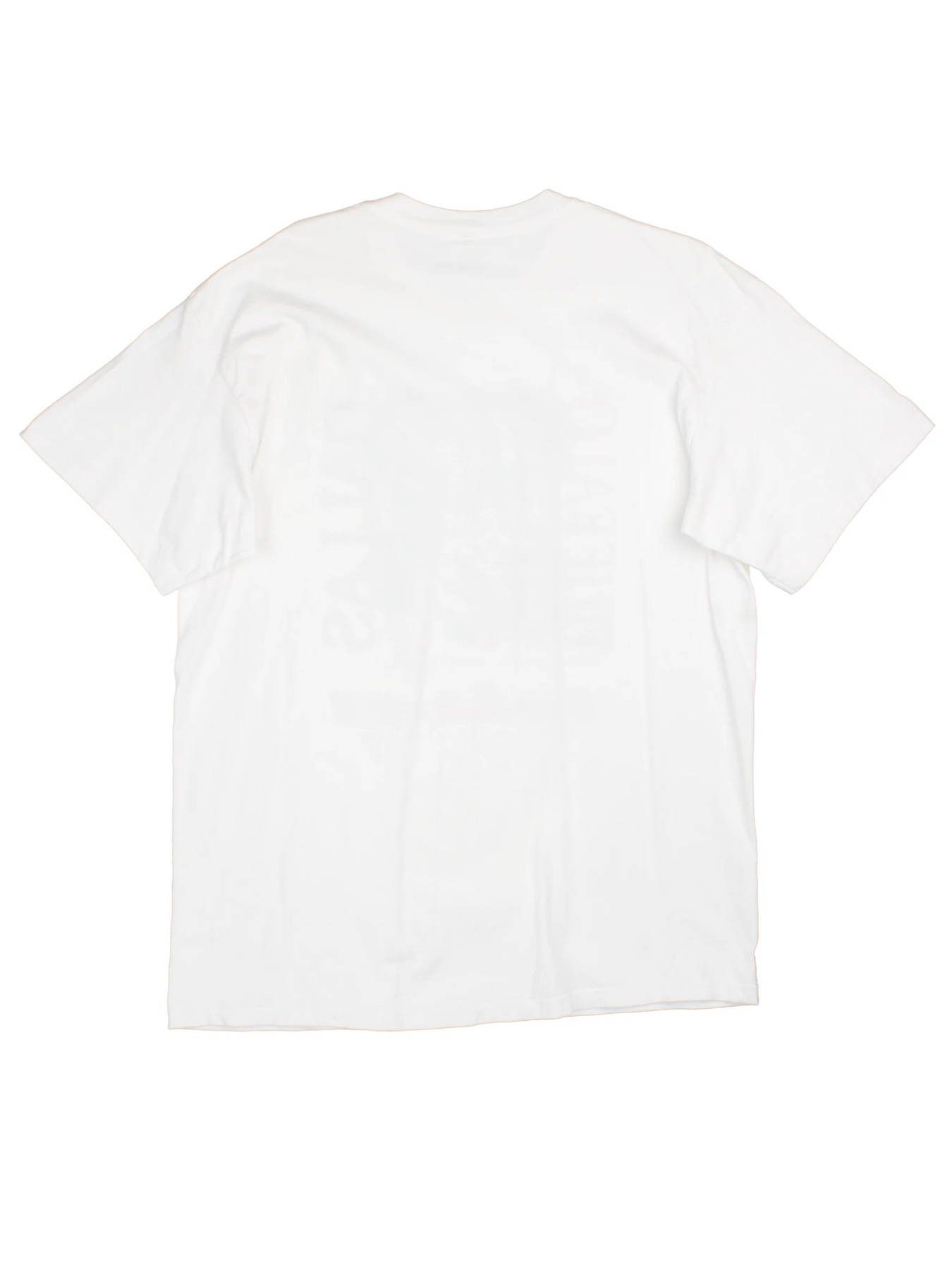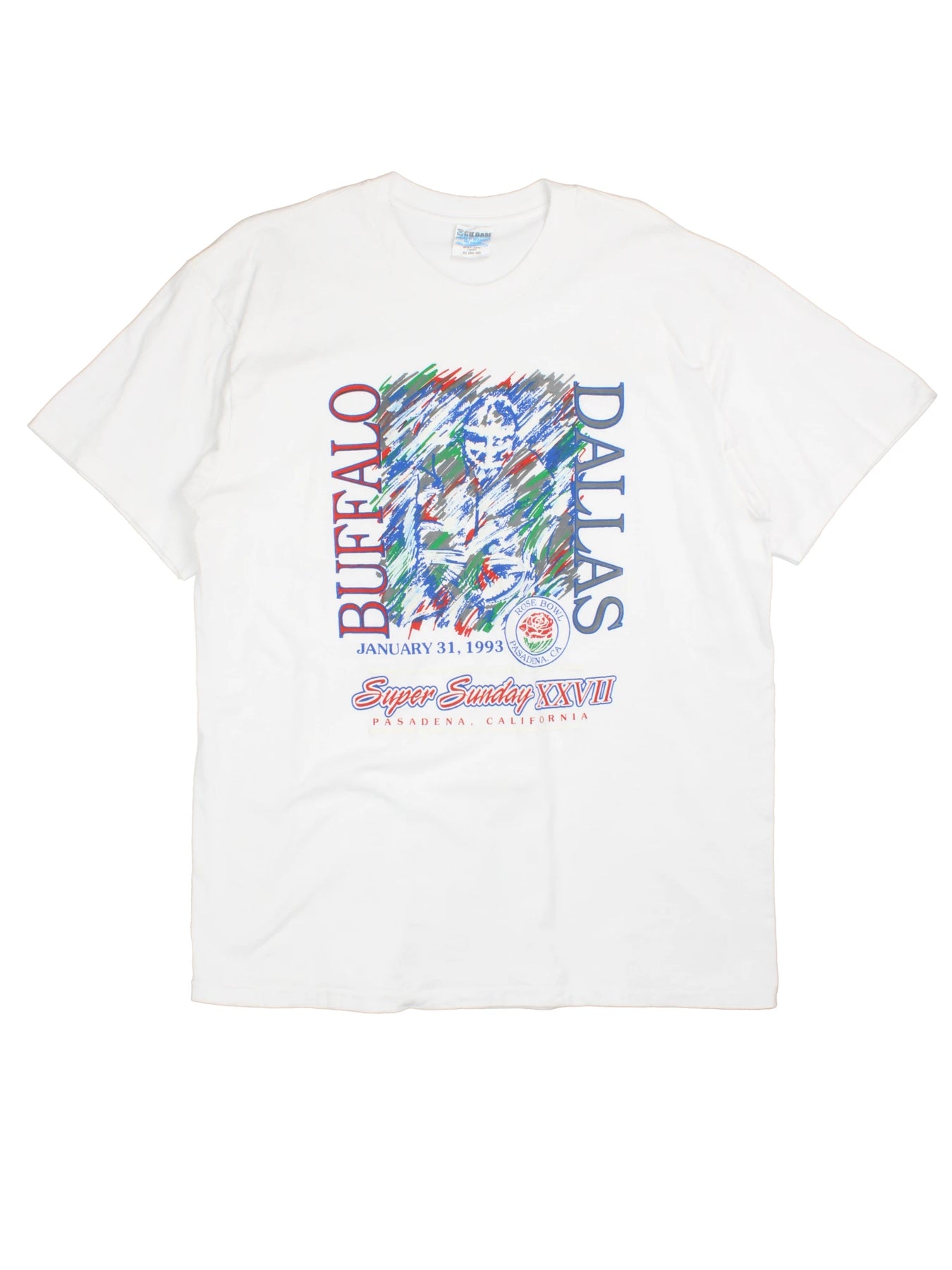 Buffalo vs Dallas 1993 Rose Bowl NFL tee in white with abstract football player graphic and spellout reading 'Super Sunday XXVI Pasadena California'.