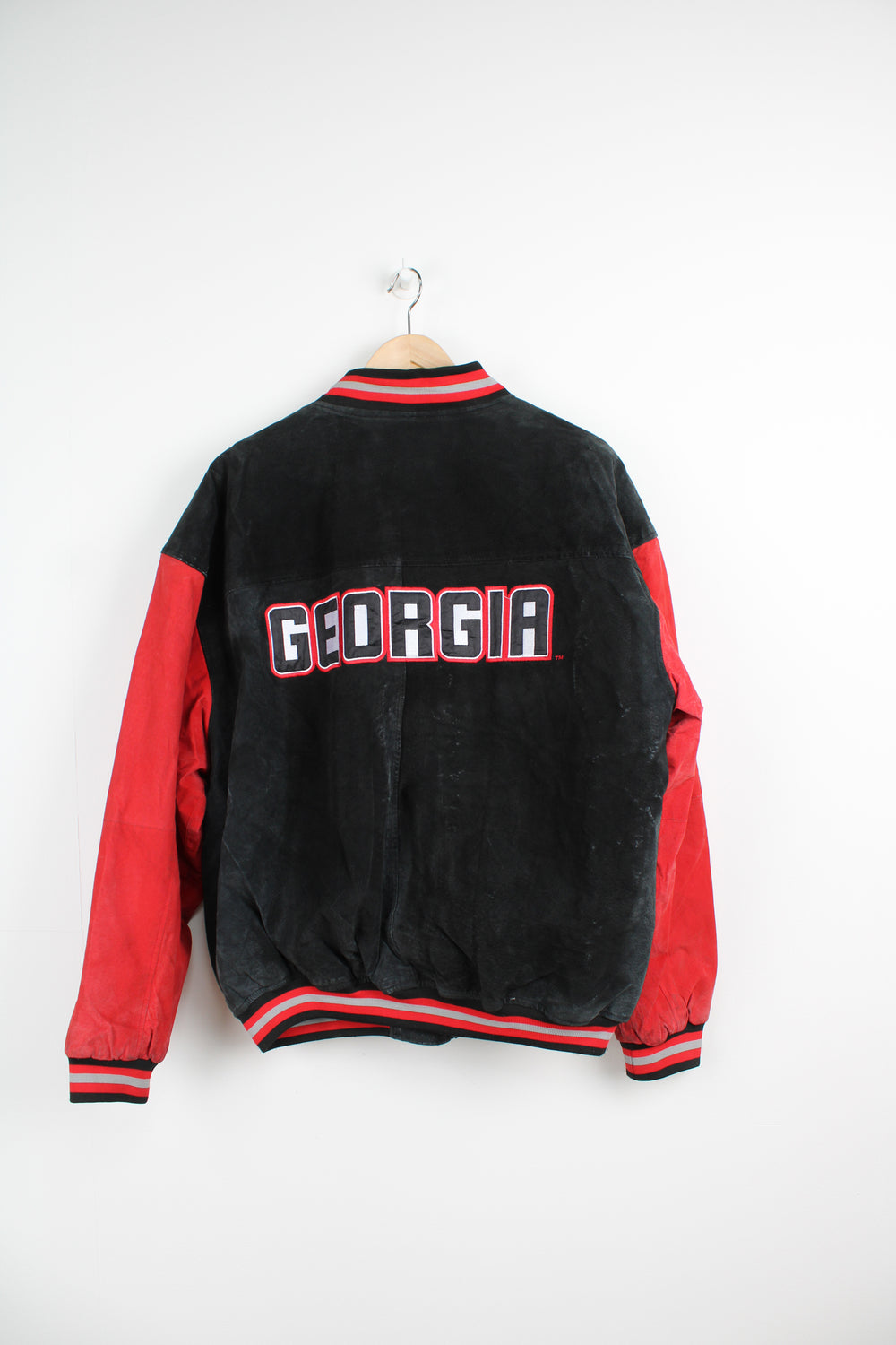 Georgia Bulldogs suede leather, red and black bomber Jacket. Embroidered logo and name on front and back.