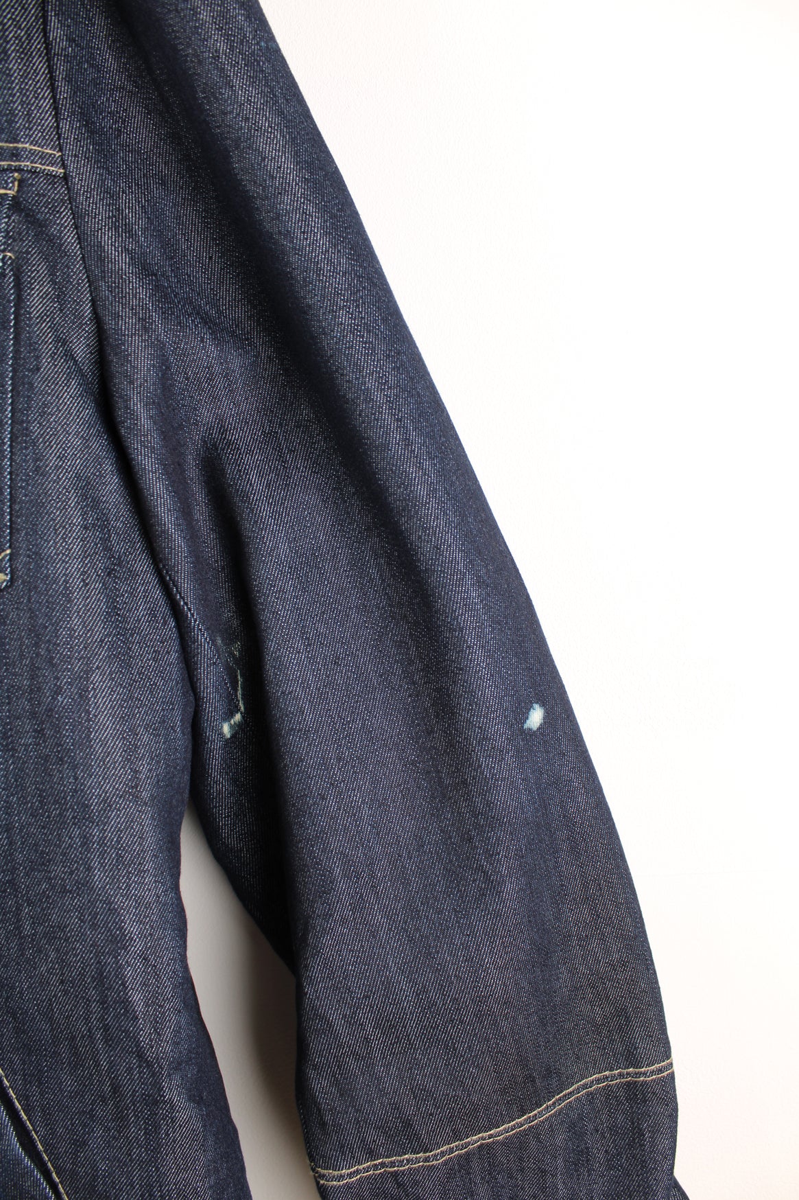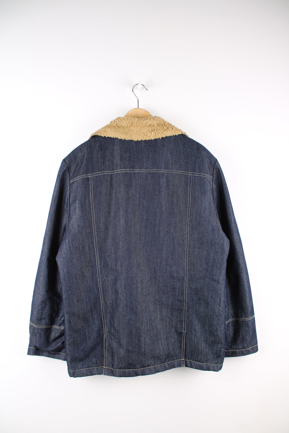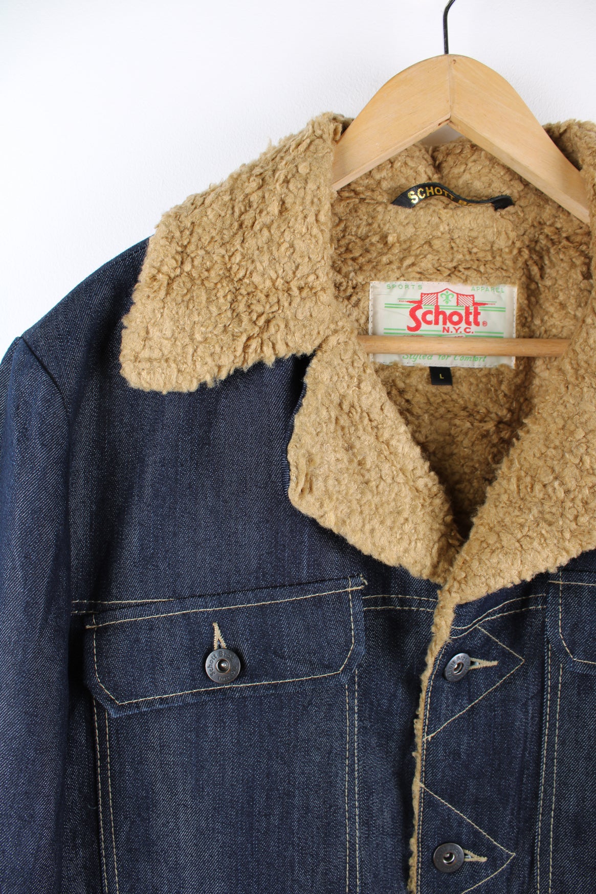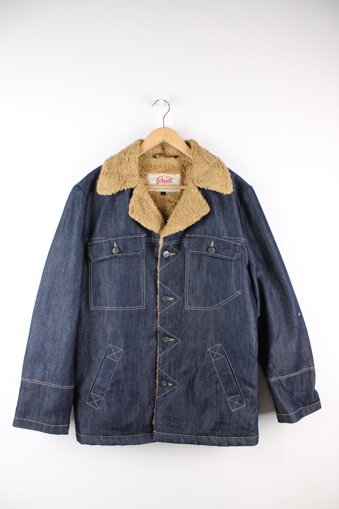 Vintage 00's Schott NYC denim chore jacket features shearling style lining and multiple pockets