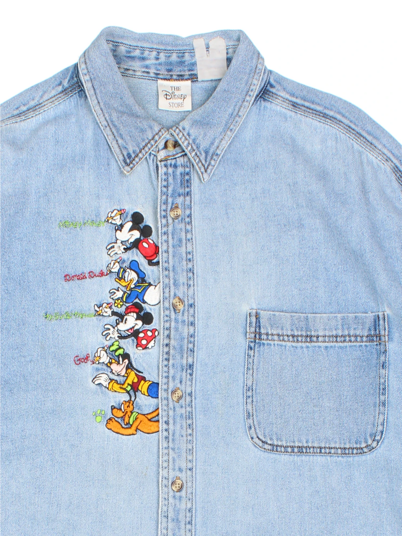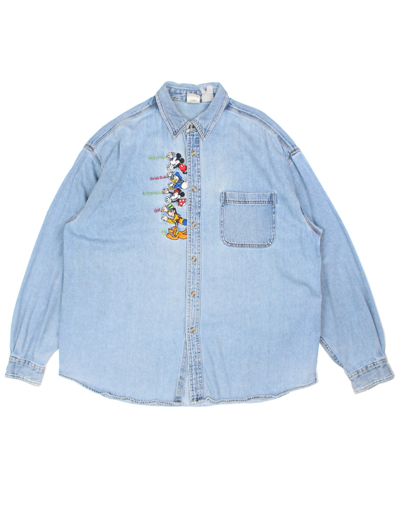 Step into playful style with this Vintage Disney Denim Shirt featuring vibrant embroidered details of Mickey Mouse, Donald Duck, Minnie Mouse, Goofy, and Pluto on the front. Crafted from 100% cotton, this light blue shirt offers comfort and durability, making it perfect for casual outings and everyday wear. Ideal for Disney fans and lovers of unique vintage apparel, this versatile piece pairs effortlessly with jeans or shorts for an iconic, timeless outfit. Add this rare find to your wardrobe for a comfortable, playful, and standout statement.