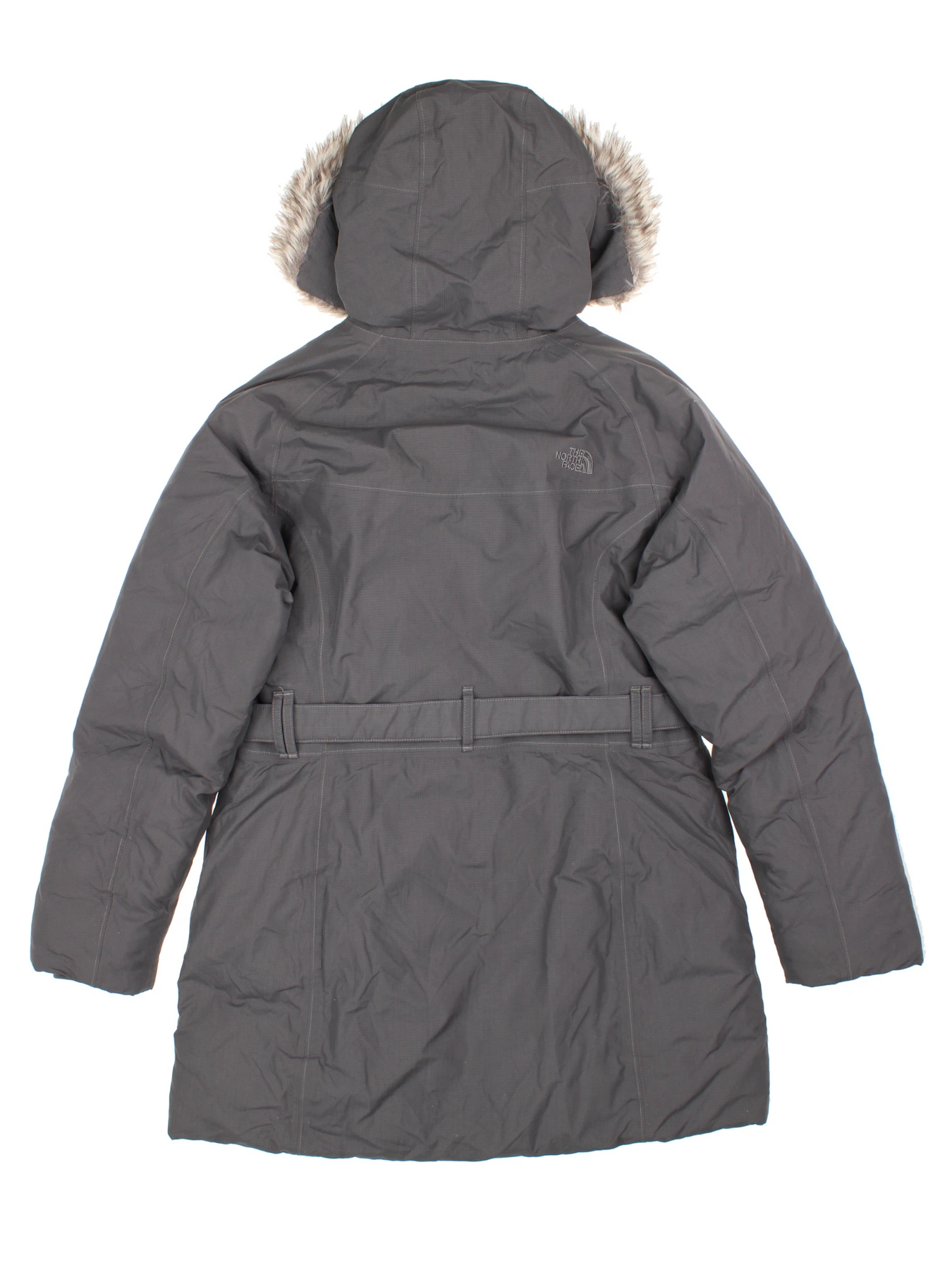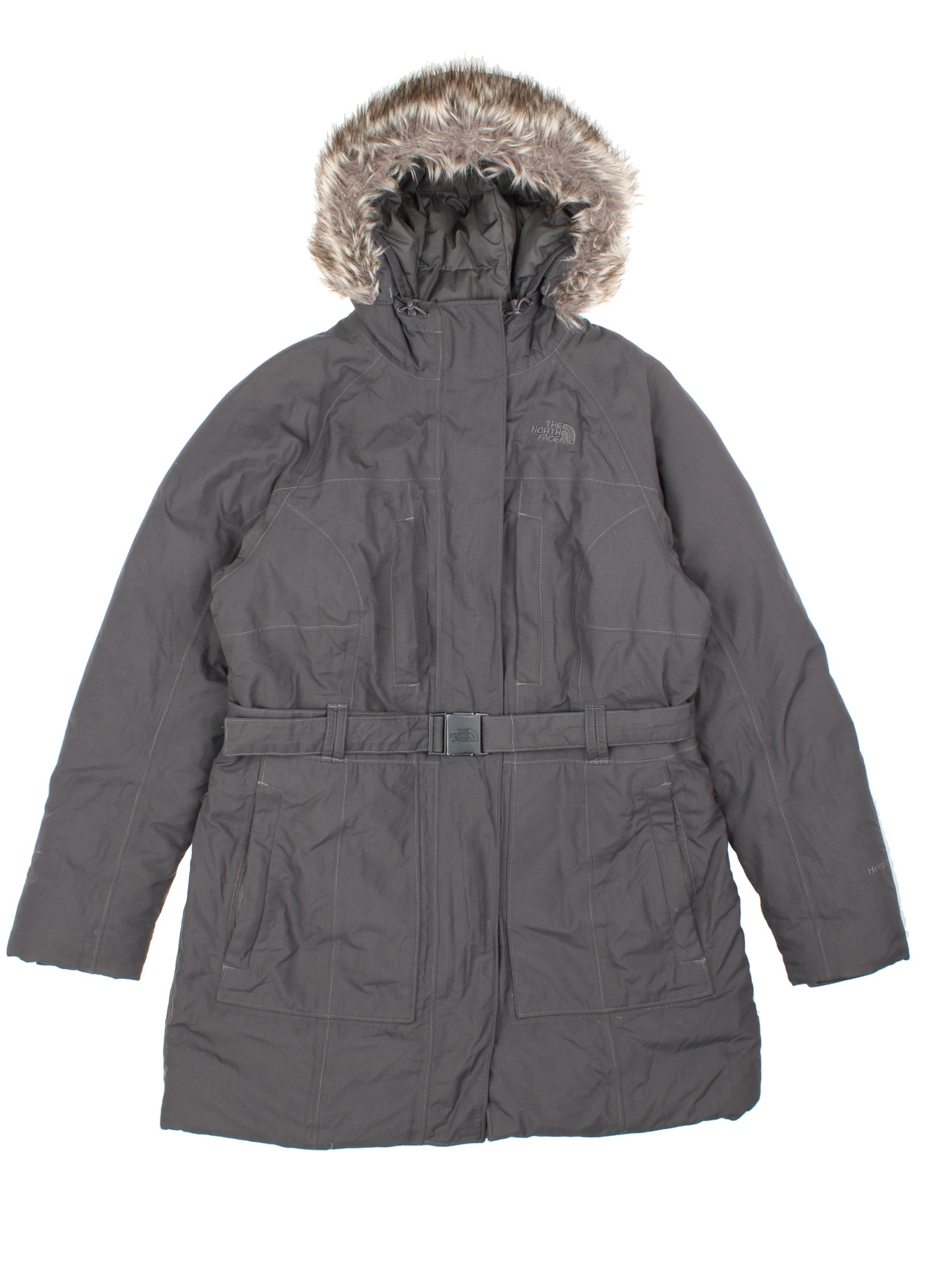 Brave the cold in style with The North Face HyVent Grey Hooded Parka Jacket for Women in size M. Designed for optimal protection, this winter coat features a water-resistant nylon shell, insulated quilting, and a plush faux fur-trimmed hood for added warmth. The belted waist adds a flattering touch, ensuring a contoured fit. Ideal for the colder seasons, it combines iconic durability with modern fashion and practicality, perfect for outdoor adventures or everyday urban wear. Step out confidently this winter with dependable comfort and warmth from The North Face.