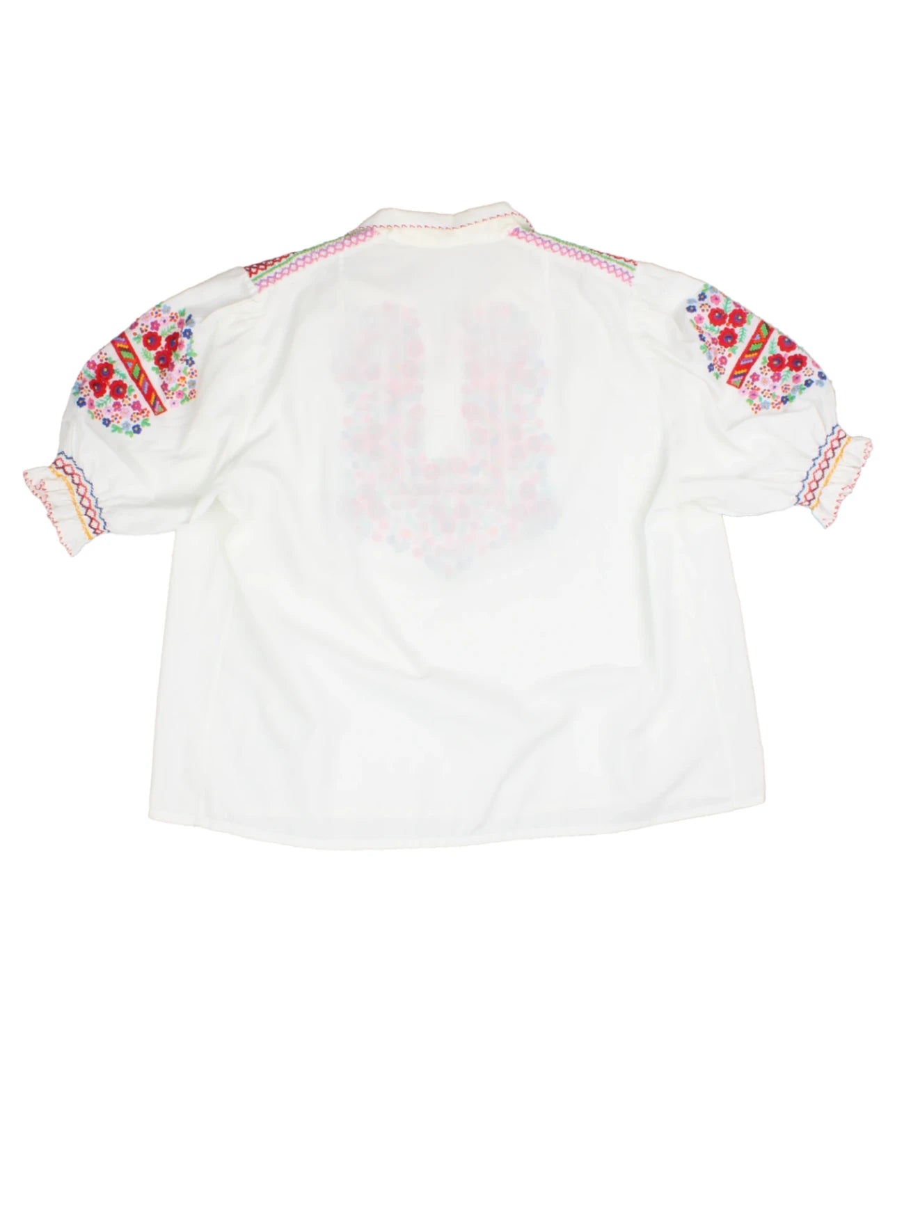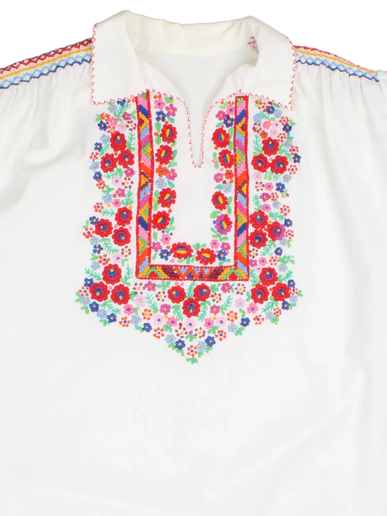 Brighten up your wardrobe with this beautiful vintage embroidered floral cotton top in classic white. This charming blouse features intricate multicoloured florals throughout the front and sleeves, breathing new life into timeless boho style. Made from breathable cotton, it offers a relaxed, comfortable fit ideal for festivals, casual days, or summer gatherings. The pullover design and delicate detailing create an effortless vintage folk look, perfect for pairing with denim or your favourite skirt.