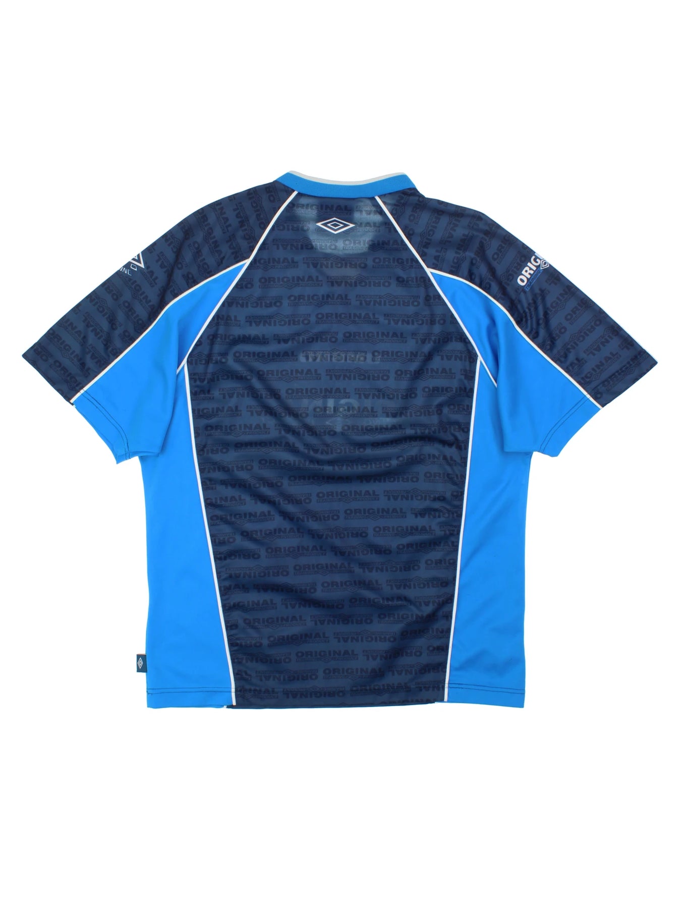Elevate your athletic wardrobe with this authentic Umbro Medium Original Training Blue Polyester Sports Top, inspired by the iconic 90's retro sportswear style. Constructed from lightweight polyester, this sports tee ensures breathability and comfort during intense workouts or casual outings. The striking dual-tone blue design features prominent Umbro branding and the 'Original Training Product' motif across the chest and sleeves, giving it standout appeal for football, gym, or leisurewear. Its relaxed fit in size M provides optimal movement and versatility.
