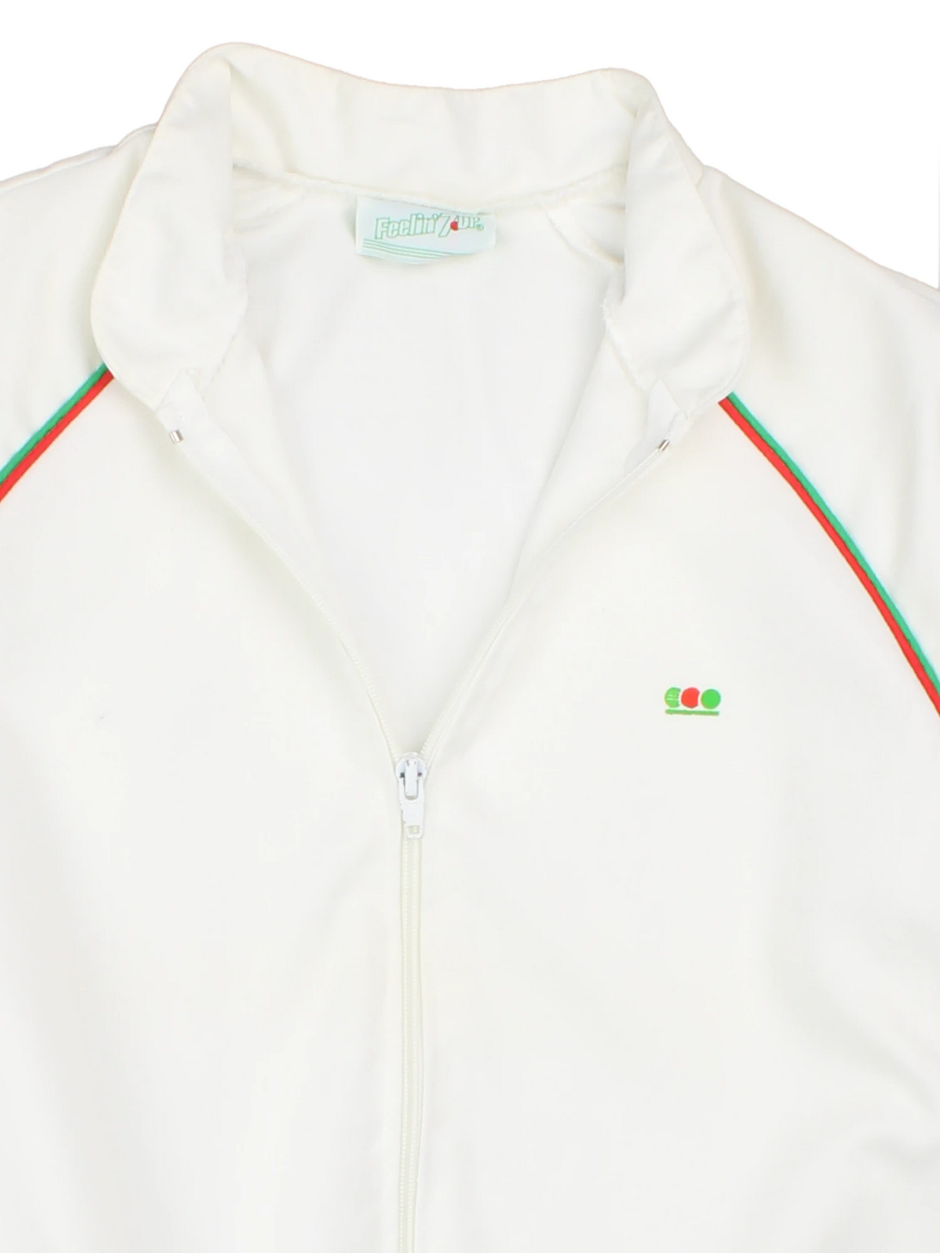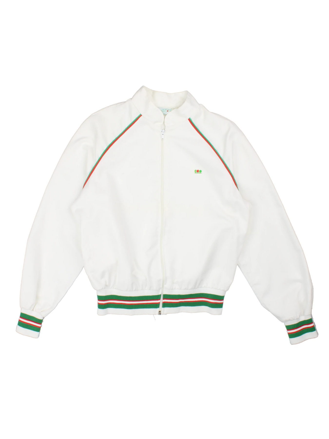 Elevate your retro wardrobe with this Vintage Feelin' Dip White Track Jacket, crafted from durable polyester for a lightweight, sporty feel. This stylish jacket features eye-catching green and red striped ribbed cuffs and hem that add a vibrant touch to its classic white exterior. The full zip front makes it easy to layer, while the XS size ensures a comfortable, relaxed fit for casual day wear or vintage-inspired occasions. The embroidered chest logo adds an authentic vintage detail, making it perfect for both sports enthusiasts and streetwear fans. Pair this versatile jacket with jeans or joggers to channel a true throwback vibe. Ideal for those who appreciate unique vintage finds, this retro sportswear piece is a statement addition to any fashion collection.