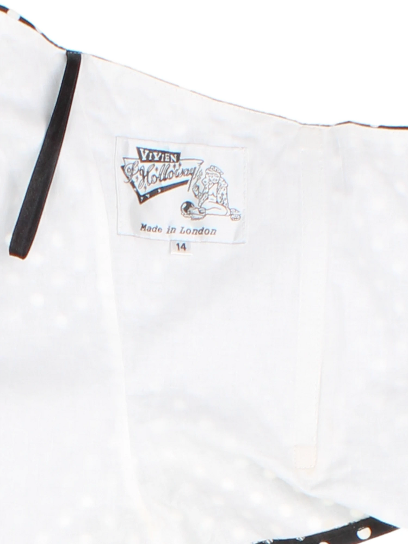 Step into retro-inspired style with this Vivien of Holloway Vintage Black Polka Dot Halterneck Cotton Top, expertly crafted in London. Designed in an iconic 50's silhouette, this top features a classic black colour base adorned with crisp white polka dots, capturing timeless feminine charm. The halterneck cut and structured bodice make it perfect for both daytime events and evening outings, while the pure cotton fabric ensures a comfortable, breathable fit. Whether paired with vintage skirts or modern jeans, this size XXS top flatters and defines the waist for a stunning look. Embrace the spirit of vintage glamour and add a statement piece to your collection today.