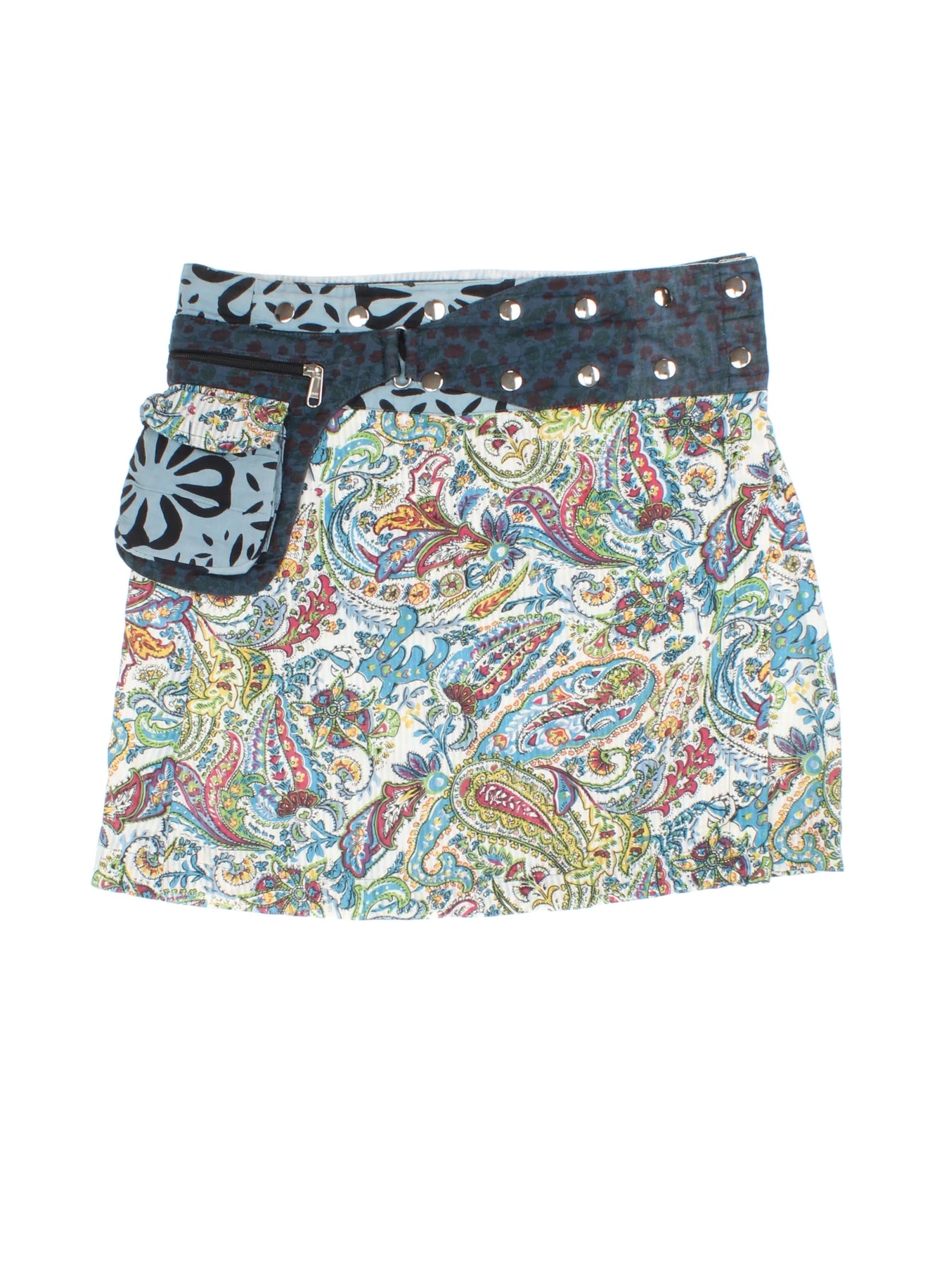 Elevate your wardrobe with this eye-catching Vintage Paisley Print Cotton Mini Skirt, designed in a flattering size XL for effortless style and comfort. Crafted from breathable cotton, this skirt is perfect for those who appreciate vibrant, unique patterns and the playful energy of Y2K fashion. The standout feature is the detachable patterned pocket with secure zip and snap fastening, blending practicality with bold design. With a comfortable blue waistband and statement metallic accents, this mini skirt is ideal for both casual outings and festival adventures. Style it with a simple top and trainers for a laid-back daytime look, or dress it up with boots and a jacket for a striking evening ensemble. Add this vintage piece to your collection for a one-of-a-kind staple that promises both versatility and standout charm.
