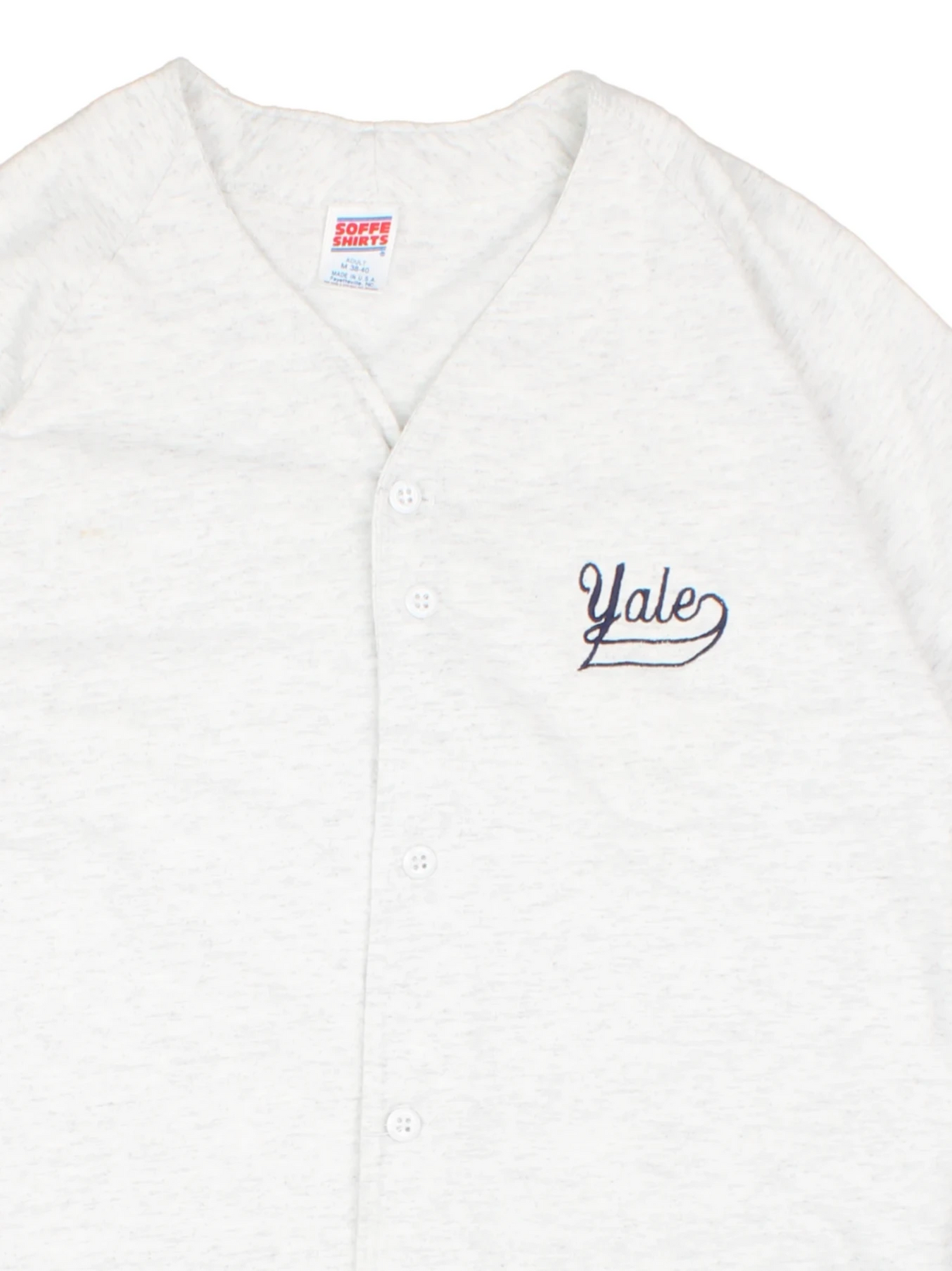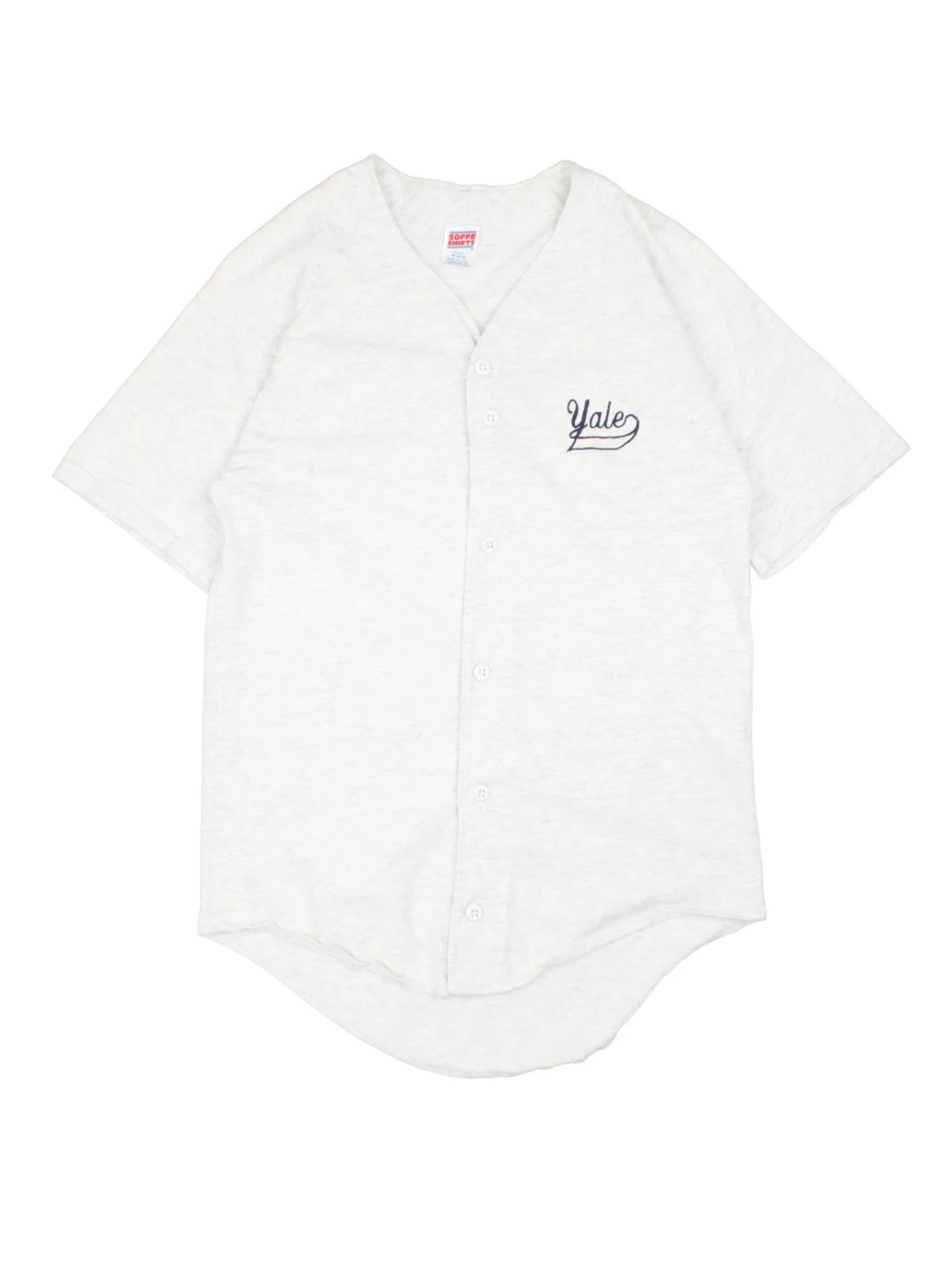 Vintage Yale Baseball T-Shirt in grey colourway. Features 'Yale' embroidery on the chest and button-down closure.