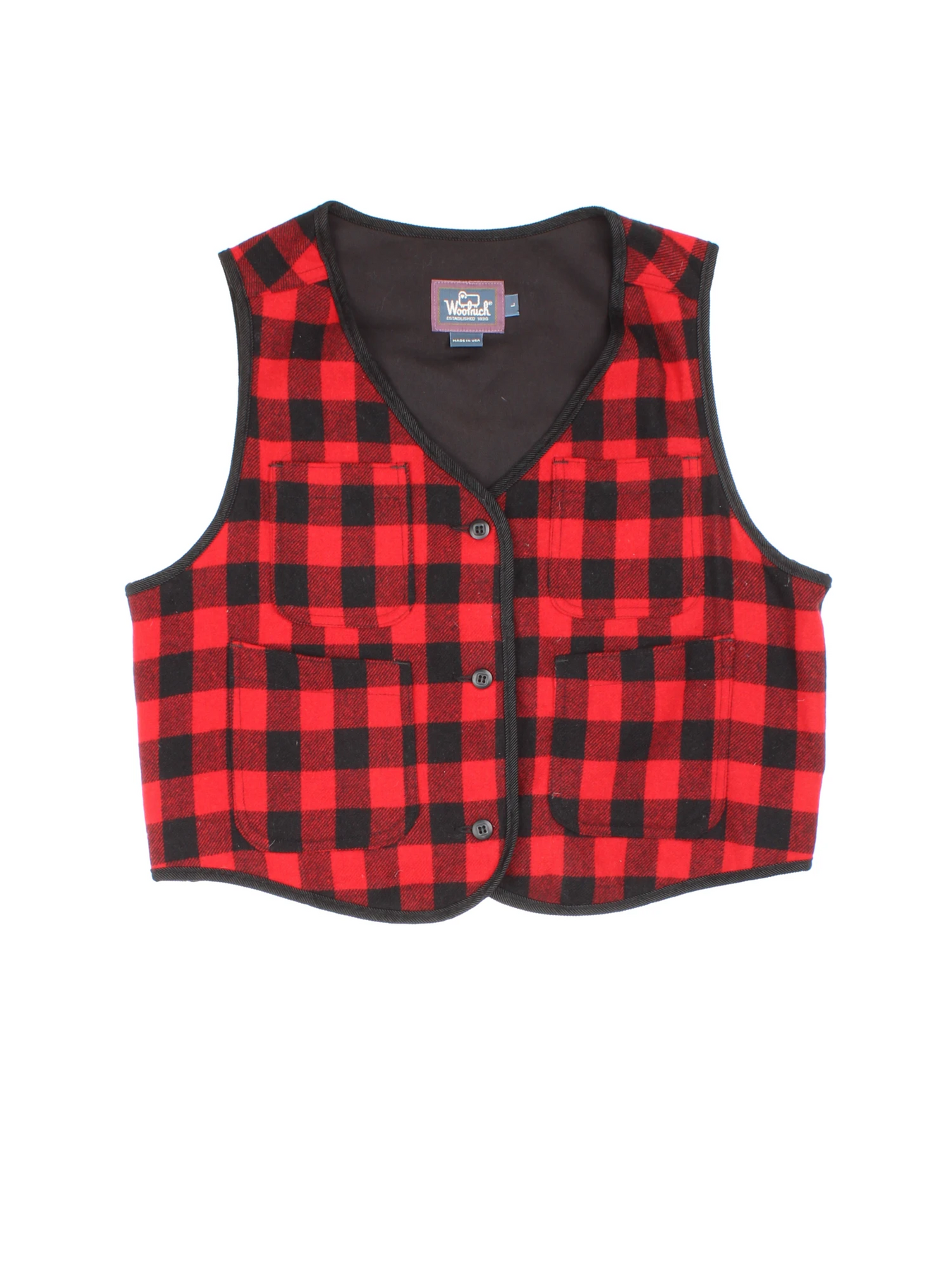Embrace timeless outdoor fashion with the Woolrich Red Black Buffalo Check Wool Vest, expertly crafted in the USA. Designed in an iconic plaid pattern, this vest ensures both warmth and classic style for all your seasonal adventures. Made from premium wool, the vest is exceptionally durable and provides the perfect layering option for hiking, camping, or casual city strolls. Its roomy Medium size offers a comfortable fit, while the front button closure and multiple pockets provide versatile functionality. Pair this signature vest with flannel shirts, rugged jeans, or outdoor gear to complete your effortlessly cool, heritage-inspired look.