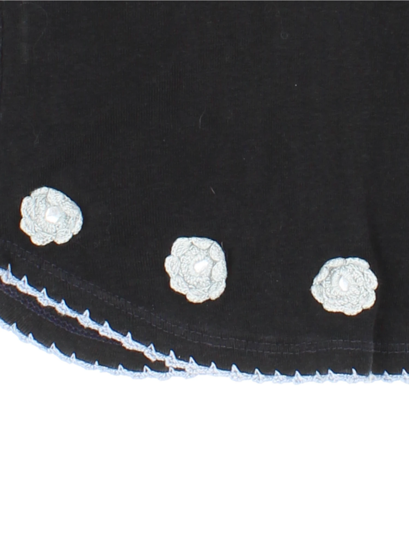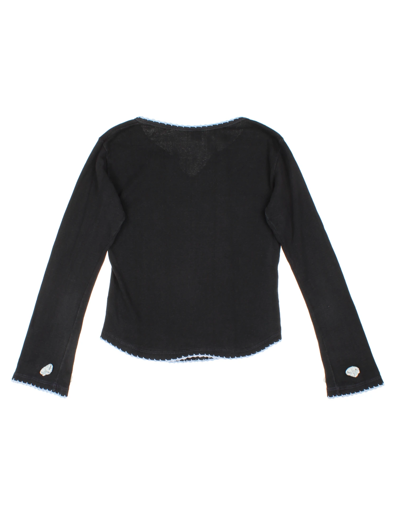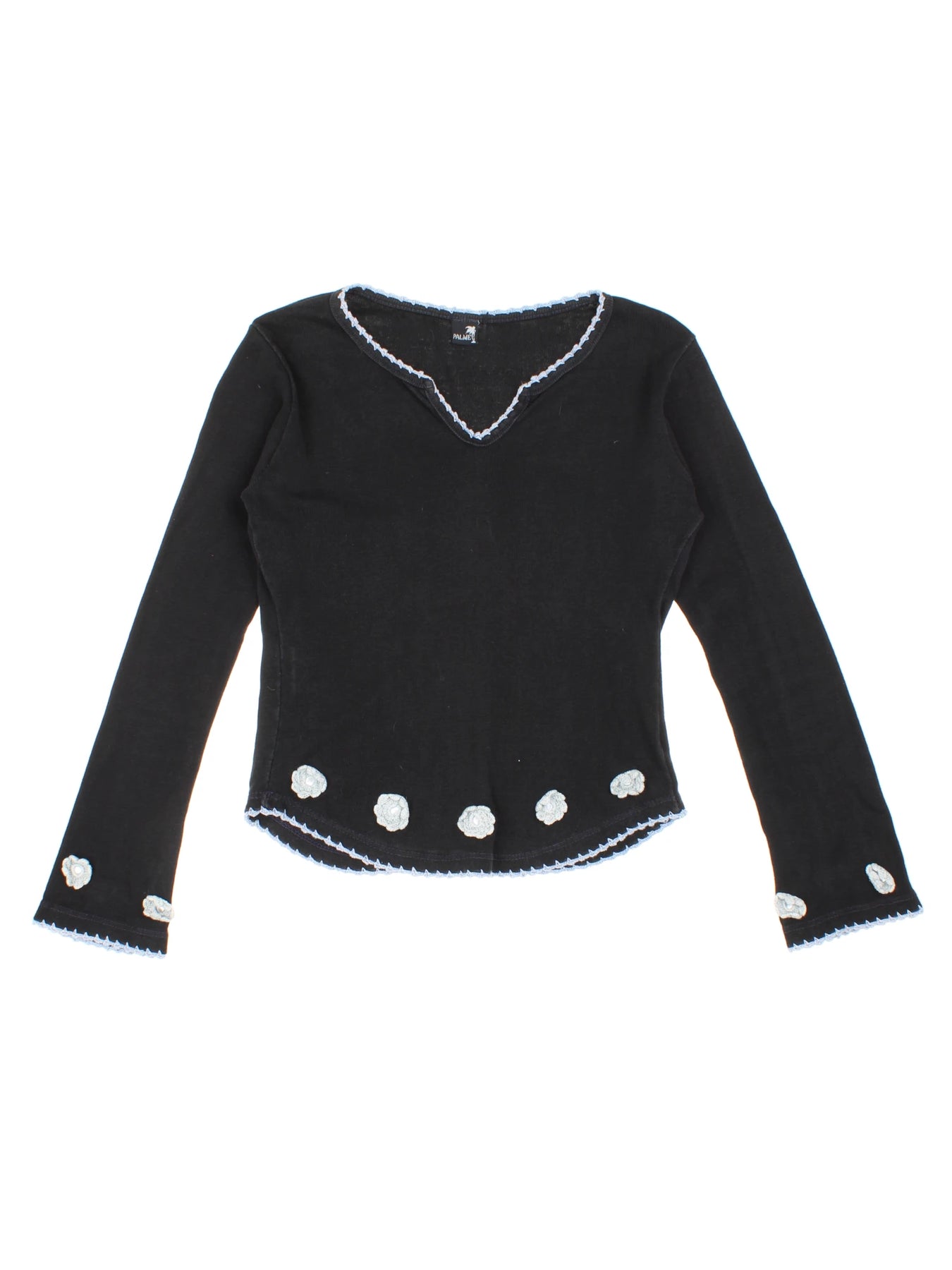 Elevate your wardrobe with this striking PALME Black Cotton Long Sleeve Top, crafted for women who appreciate the vintage-inspired Y2K style. Expertly made from breathable cotton, this top features delicate blue crochet trim along the neckline, cuffs, and hem, plus charming floral crochet appliqué details that set it apart from ordinary basics. Perfect for casual outings, it offers a comfortable, flattering fit in a XS size, with a classic black colour that makes it easy to pair with jeans or skirts. Whether you’re heading out for coffee or meeting friends, this unique top is a must-have addition to any collection.