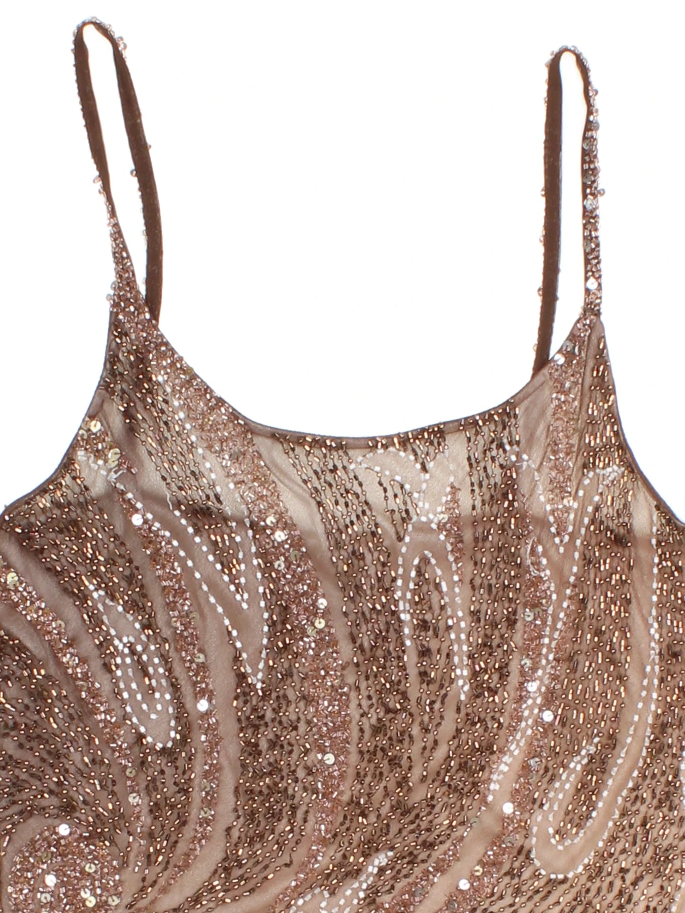 Elevate your evening wardrobe with this stunning YVE London Brown Sequin Asymmetric Party Cami Top in size XXS. Perfect for special occasions and glamorous nights out, this vintage-inspired 00’s top features dazzling sequin embellishments and intricate beadwork, adding an elegant sparkle to your look. Designed with a feminine silhouette, the asymmetric hem creates a unique twist for classic event styling. The lightweight, soft lining ensures comfortable wear, while delicate straps accentuate a chic, dressy vibe. Ideal for mixing and matching with your favourite skirts, high-waisted jeans, or tailored trousers, this YVE London cami top is a showstopping staple that promises all-day comfort and striking style. Step into the limelight and join the Dropstitch Fix Collection today!