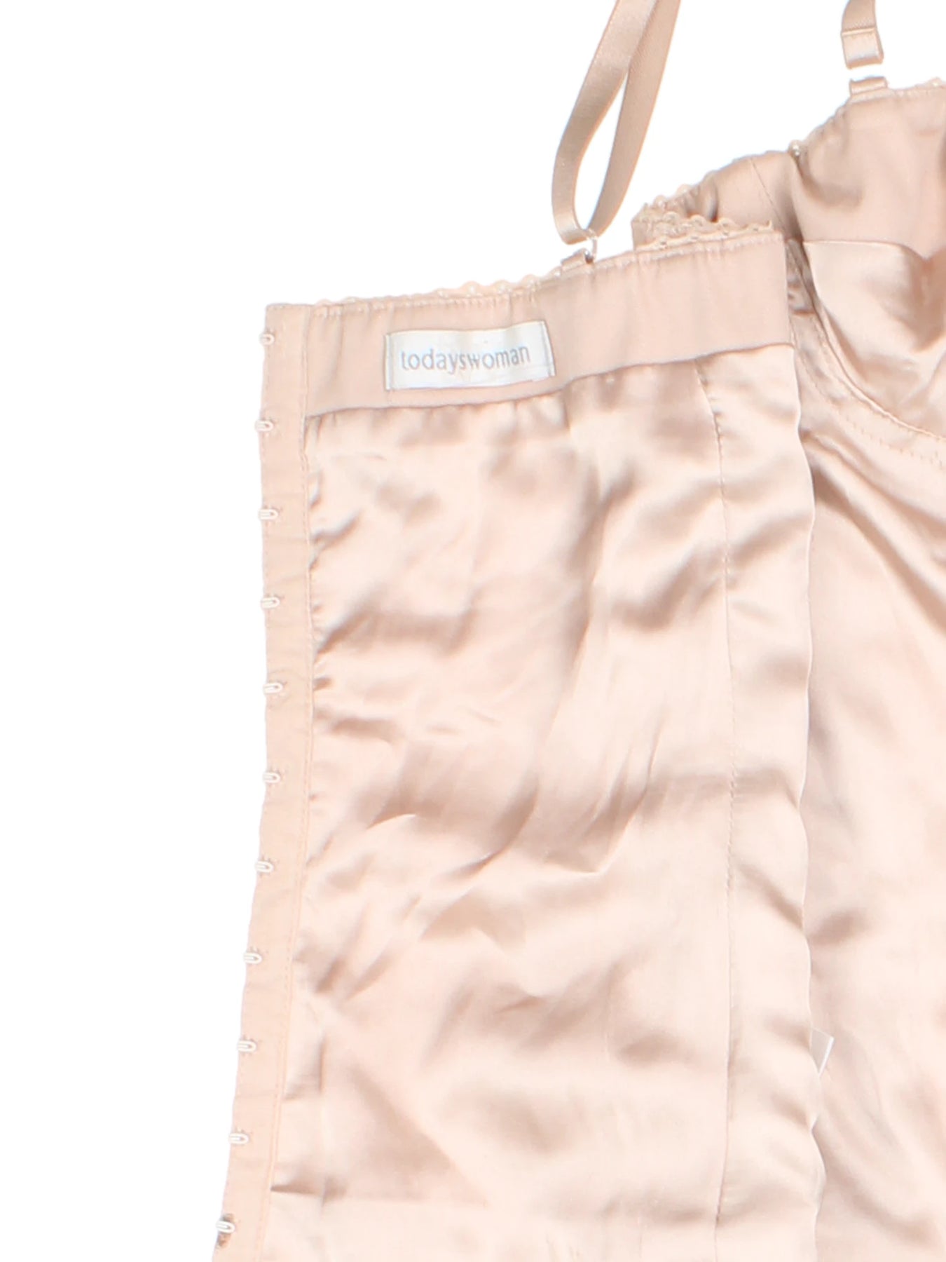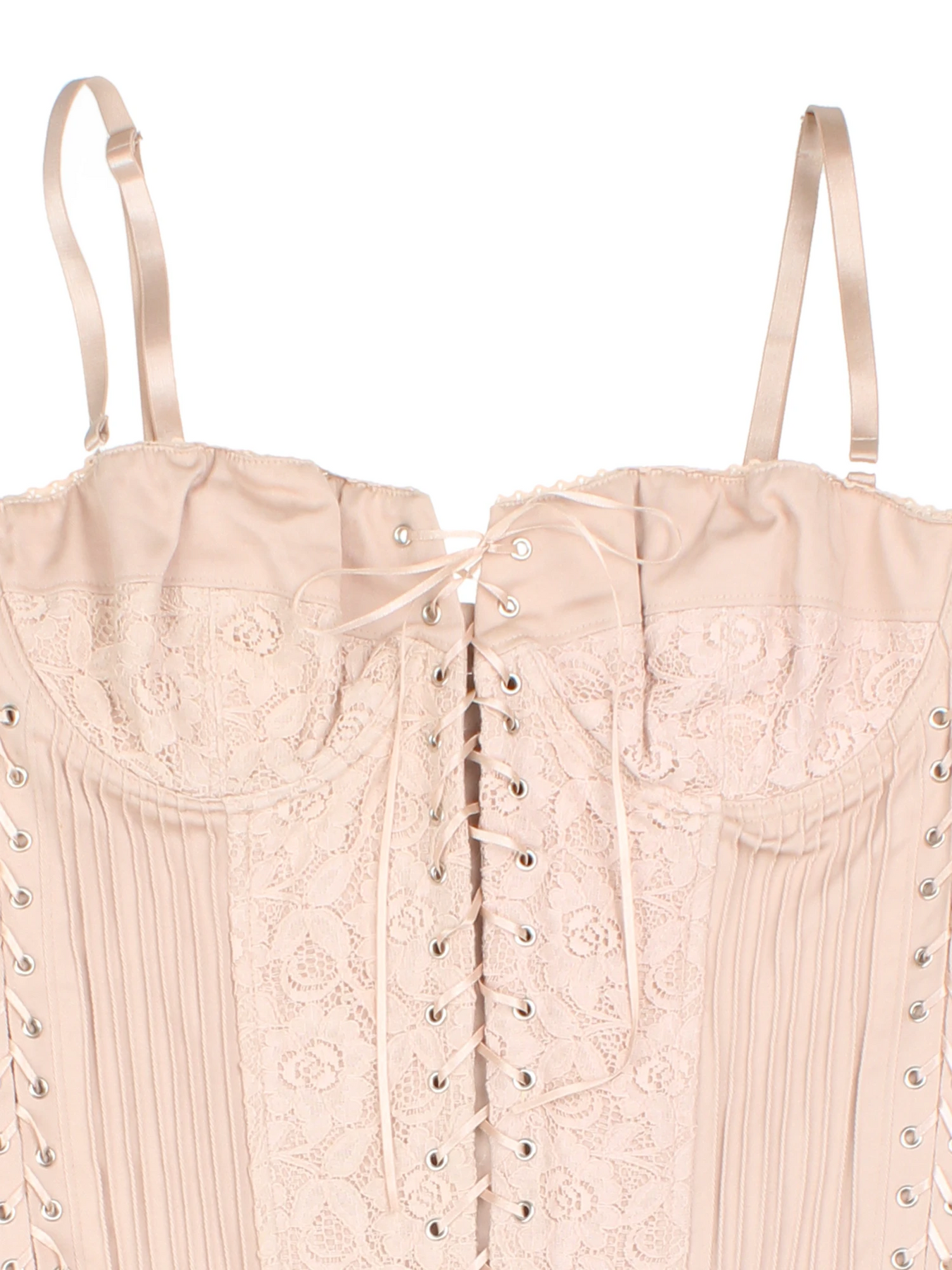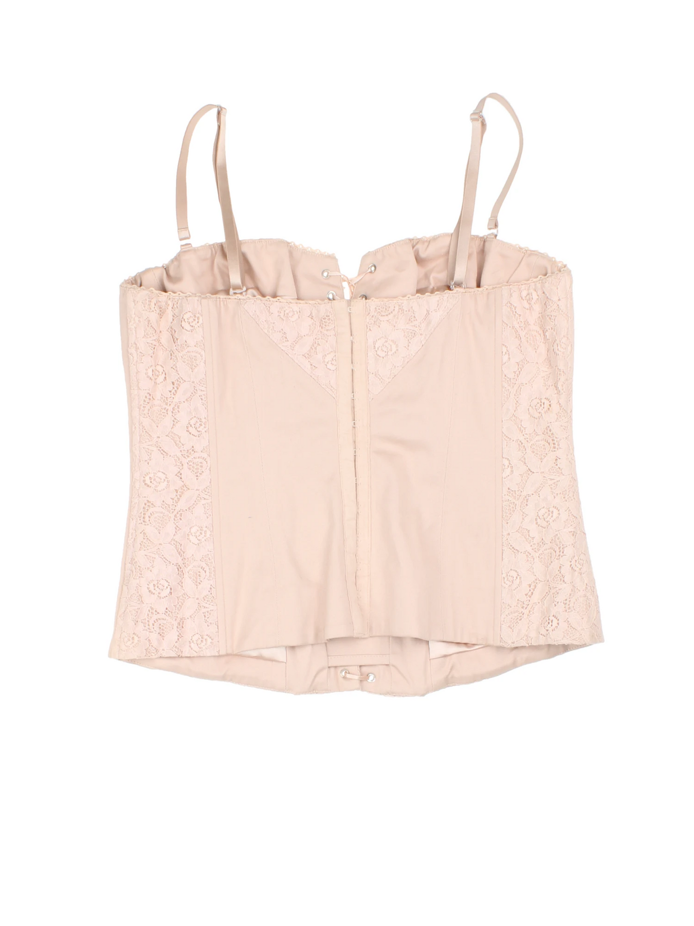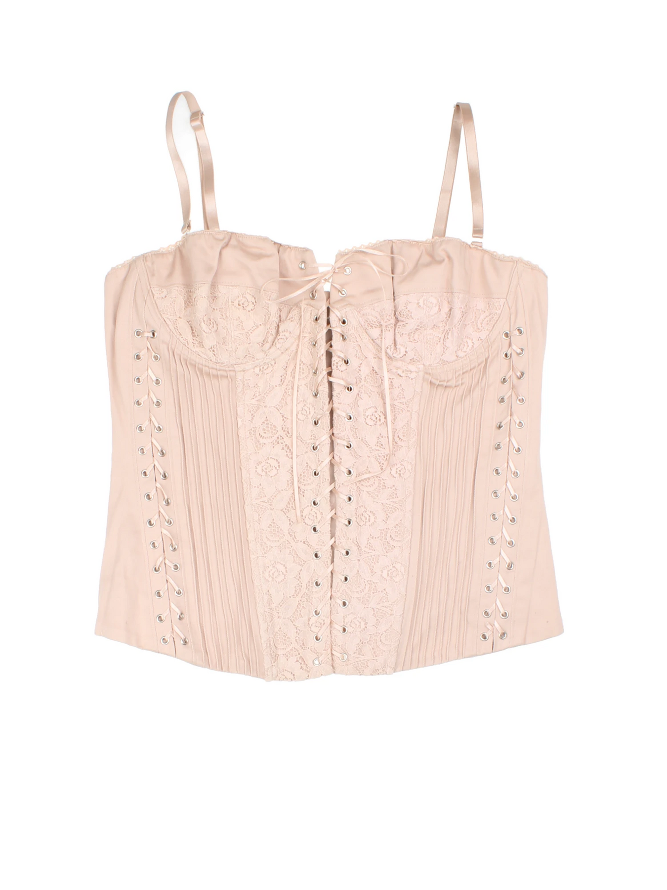 Elevate your wardrobe with this Vintage Lace Detail Pink Corset Top in size XS, beautifully crafted to highlight a feminine silhouette with a touch of elegance. Featuring intricate floral lace panels and satin-finish adjustable straps, this bustier offers both comfort and classic style. The lace-up front and structured boning ensure a flattering fit that accentuates your curves, perfect for parties, festivals, or chic everyday statements. The soft pink hue and vintage-inspired design add timeless appeal, making this piece a versatile must-have for any fashion-forward collection. Pair with denim or skirts for a look that transitions seamlessly from day to night.
