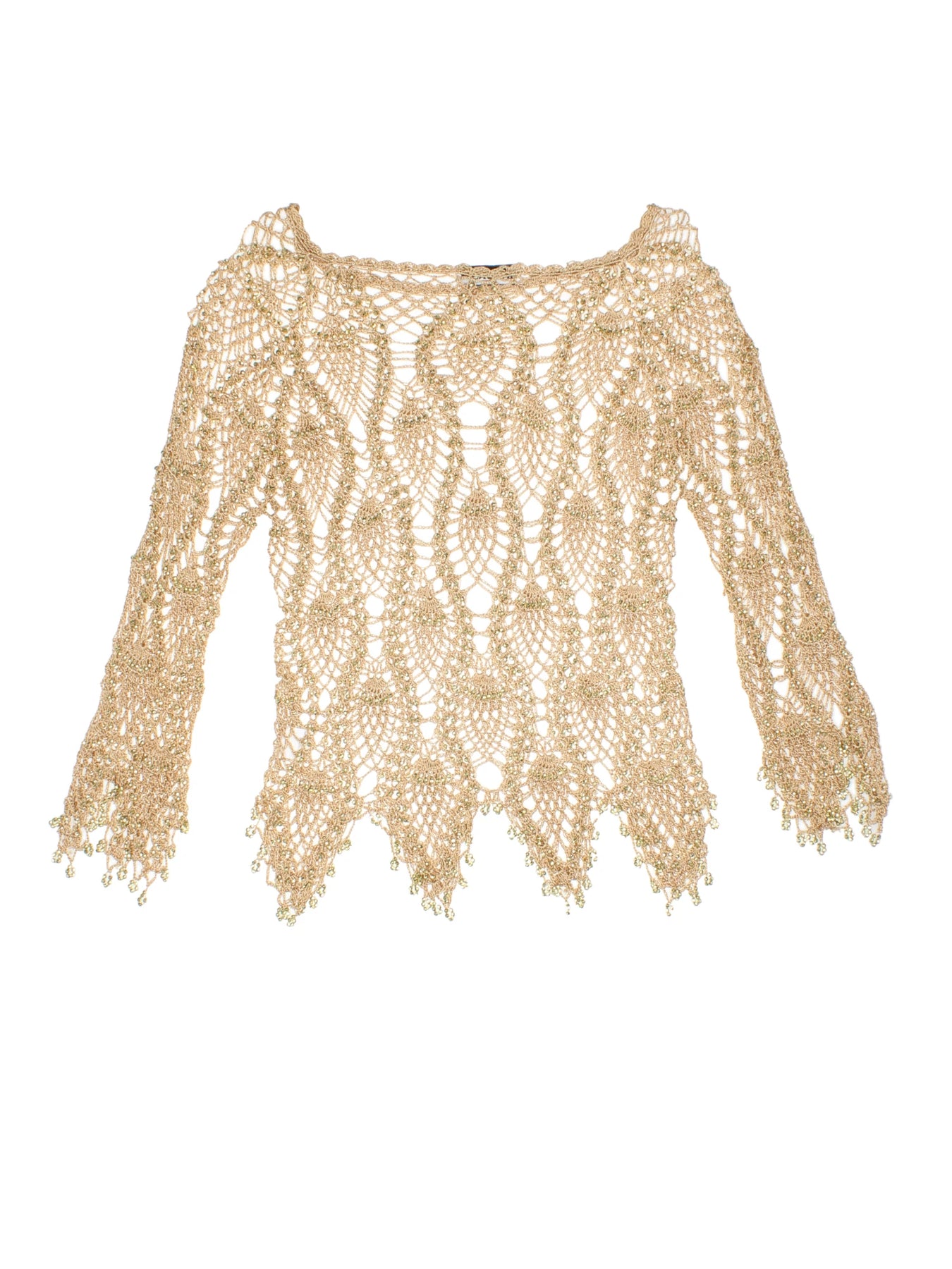 Embrace bohemian style with this stunning Inverse Gold Beaded Crochet Top in a gorgeous tan shade. Crafted from lightweight acrylic, this intricate crochet top features shimmering gold bead detailing throughout, adding a touch of glamour and elegance. The delicately patterned openwork design offers breathability and visual interest, making it ideal for layering over camisoles or bralettes for festival days, nights out, or unique party looks. The XXS size provides a relaxed yet flattering fit, while the scalloped hem and sleeves accentuate the statement appeal. Perfect for making a statement in any wardrobe, this vintage-inspired piece captures effortless style and versatility. Pair with high-waisted jeans or skirts for a show-stopping effect, and let your confidence shine through this eye-catching masterpiece.