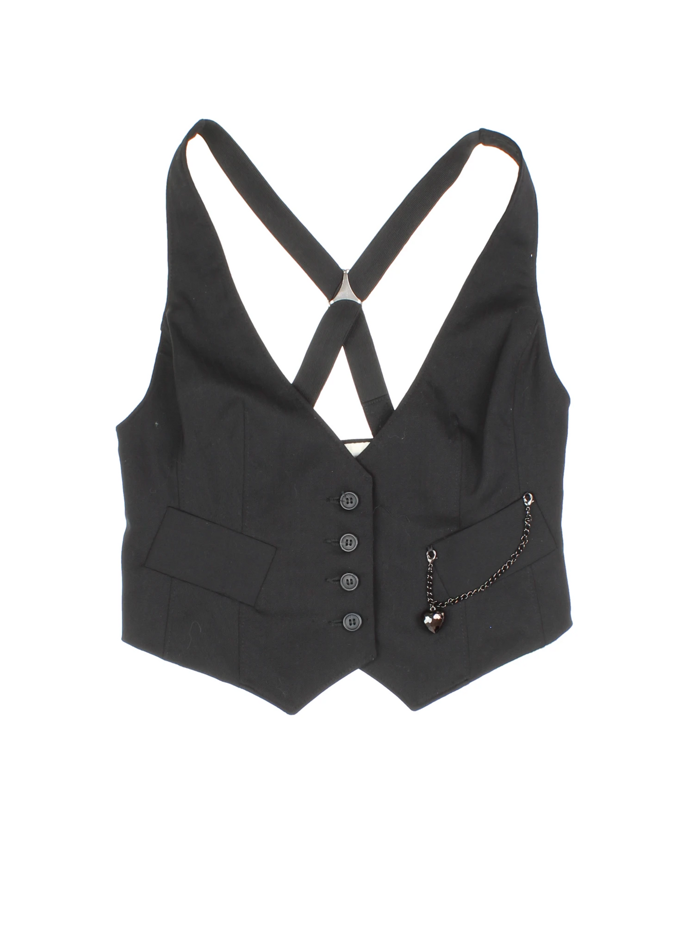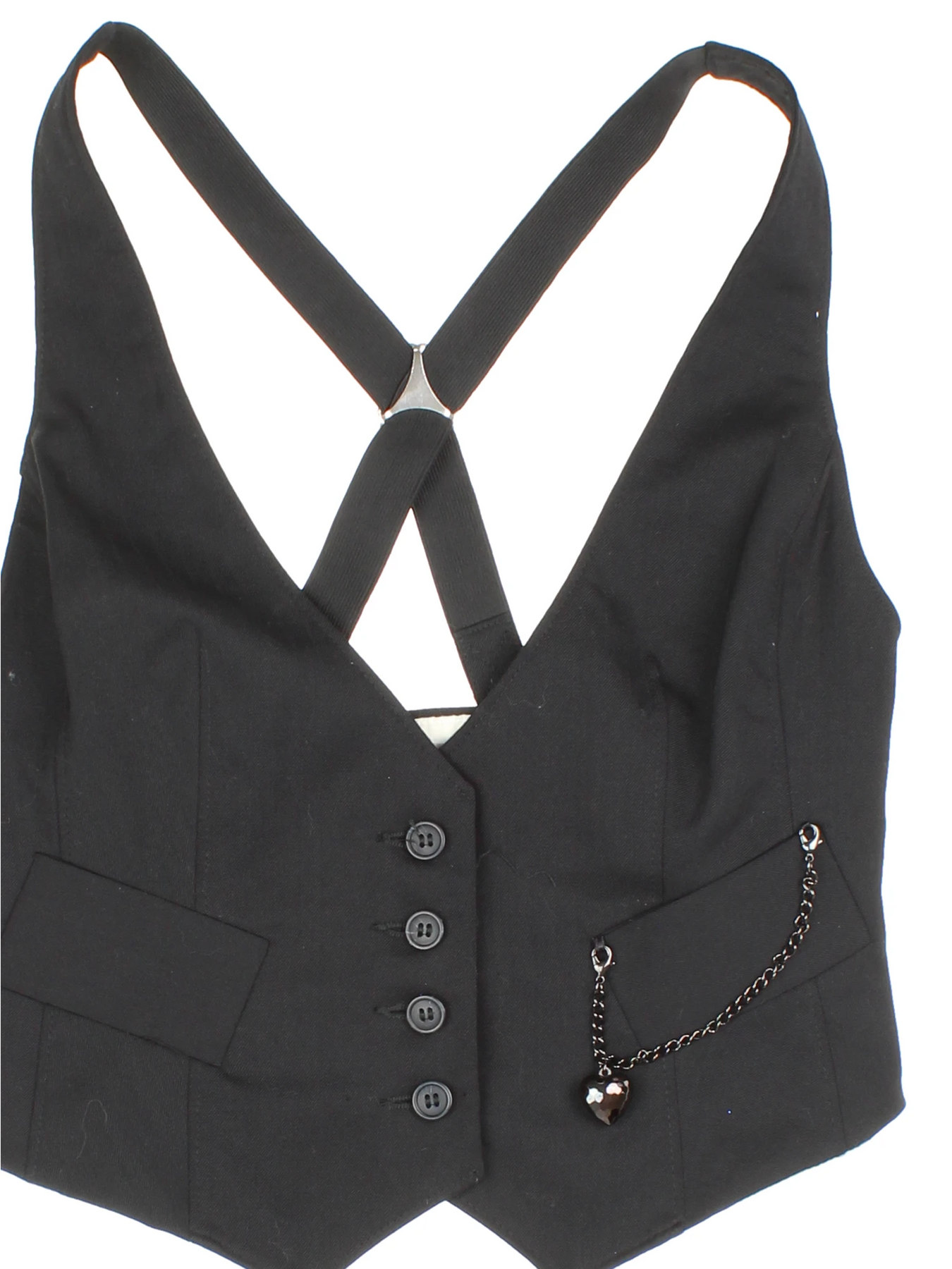 Elevate your ensemble with the River Island Women's Black Fitted Waistcoat, crafted in a tailored XXS silhouette for refined sophistication. Featuring a unique cross strap back design, this waistcoat offers a modern twist on classic tailoring. Made from high-quality polyester, it promises a comfortable yet structured fit, perfect for layering over shirts for parties or special occasions. The striking black shade ensures effortless pairing with your existing wardrobe, while the decorative heart chain detail at the front pocket adds a playful touch of character. Style it with tailored trousers or a sleek skirt for an instantly elevated look that blends timeless style with distinctive flair.