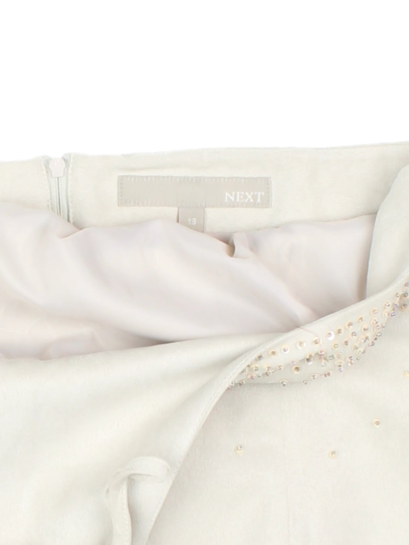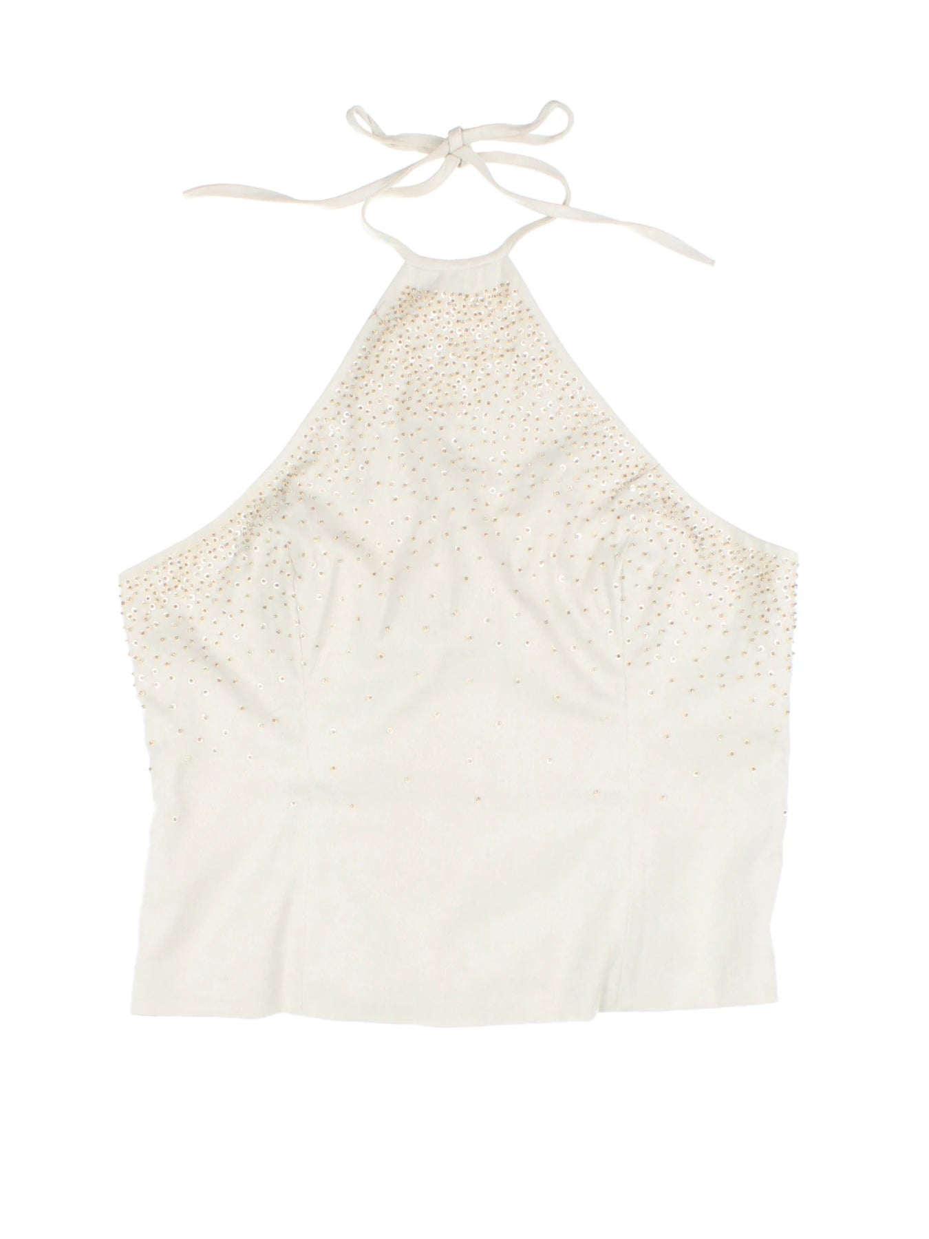 Elevate your party wardrobe with the glamorous NEXT Women’s White Suede Halterneck Crop Top, exquisitely crafted for a show-stopping look. This Y2K-inspired piece features a luxurious suede finish adorned with shimmering sequins for a sparkling touch, making it the perfect choice for special occasions and night outs. The halterneck design and zip-back fastening ensure a secure, flattering fit, while the cropped cut is ideal for pairing with high-waisted trousers or skirts. Designed in a classic white hue, this top exudes contemporary elegance and retro flair that stands out.